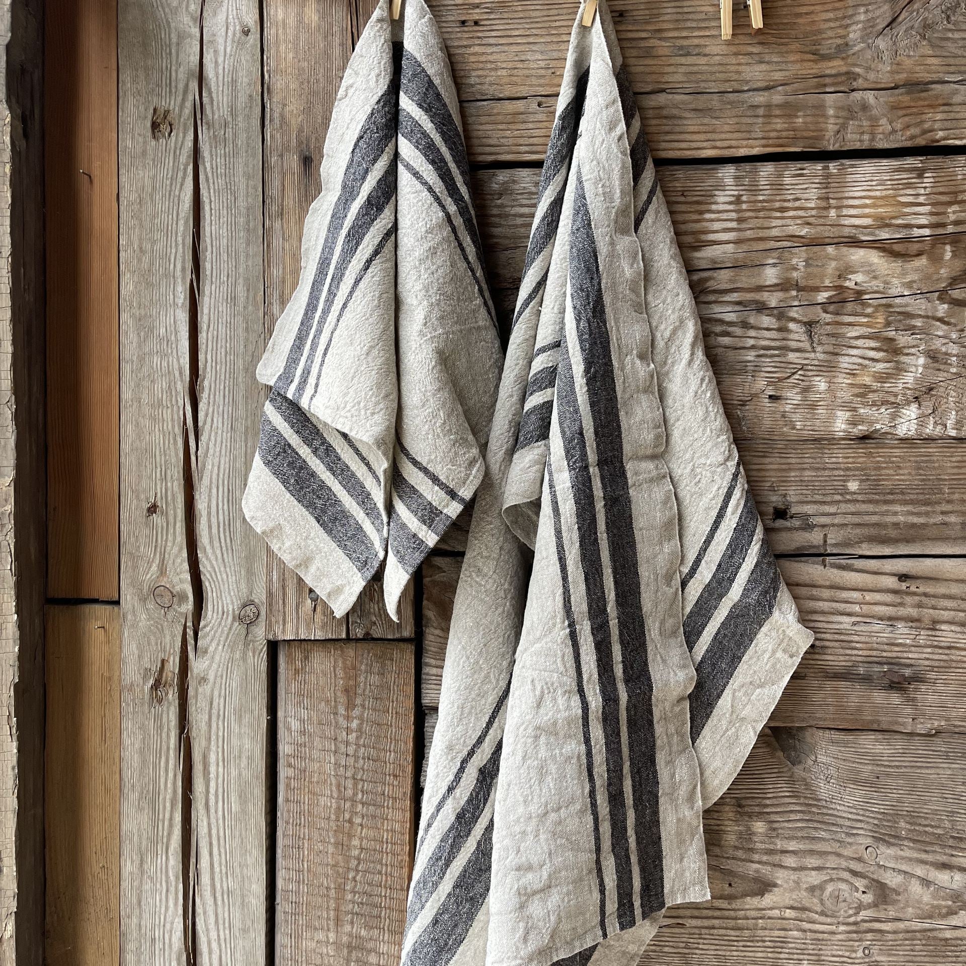 Divu vienāda dizaina svītrainu dabīgi pelēku lina dvielīšu komplekts ar tumši pelēkām svītriņām