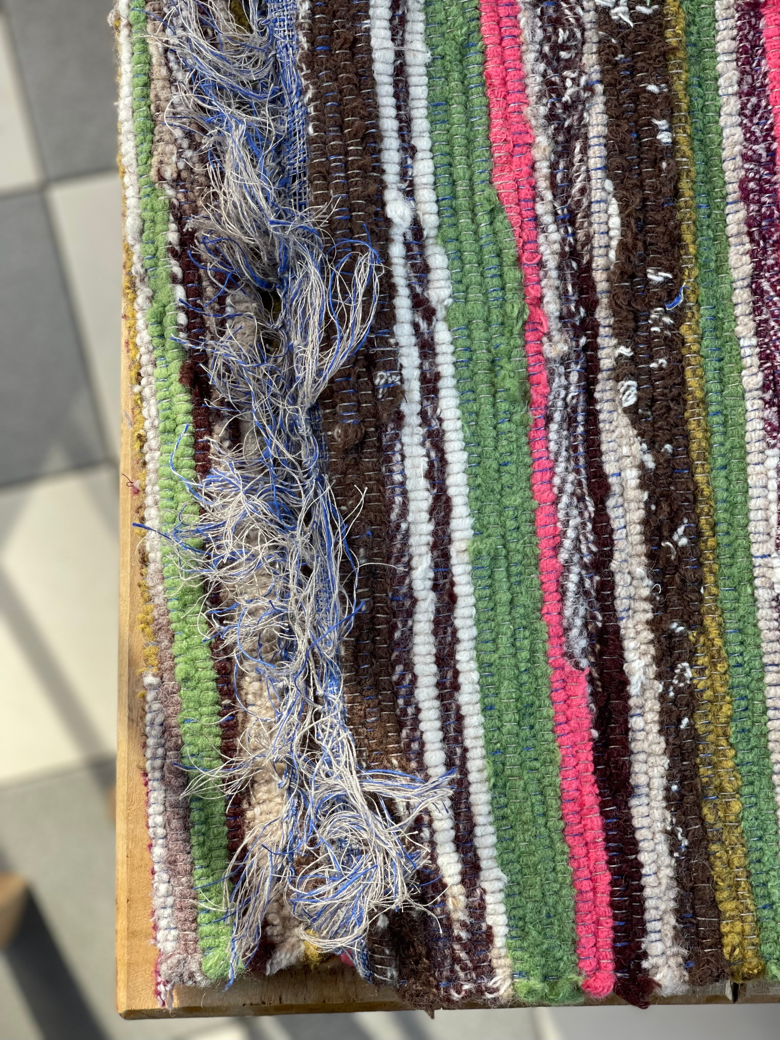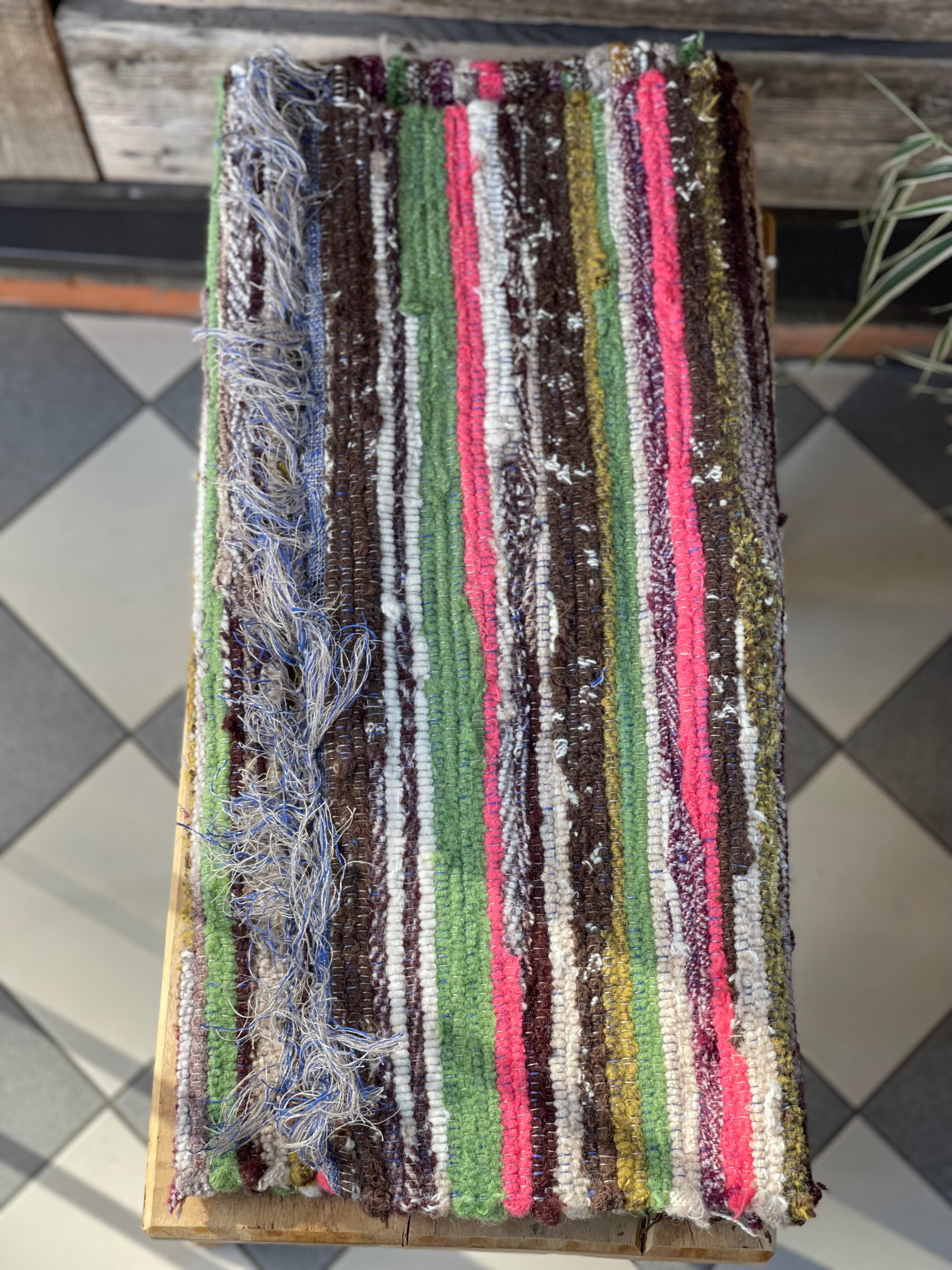 Brūnas/zaļas/sārtas svītriņas, vilnas auduma grīdceliņš ~60x115cm
