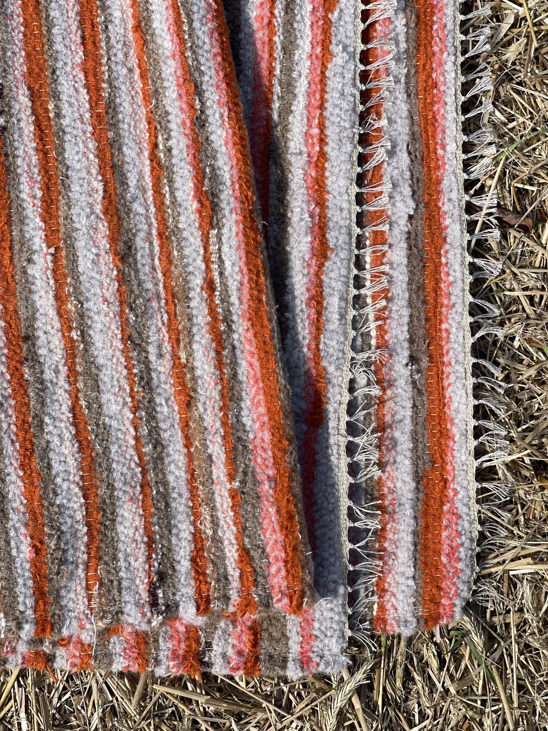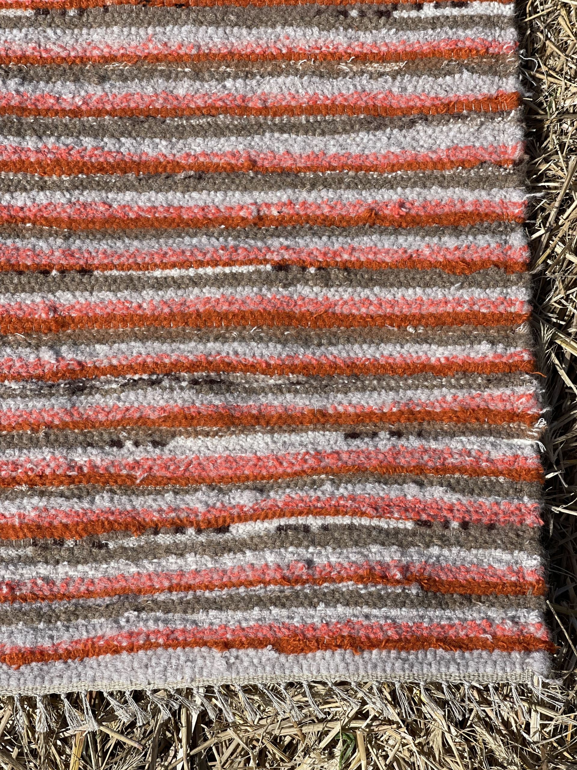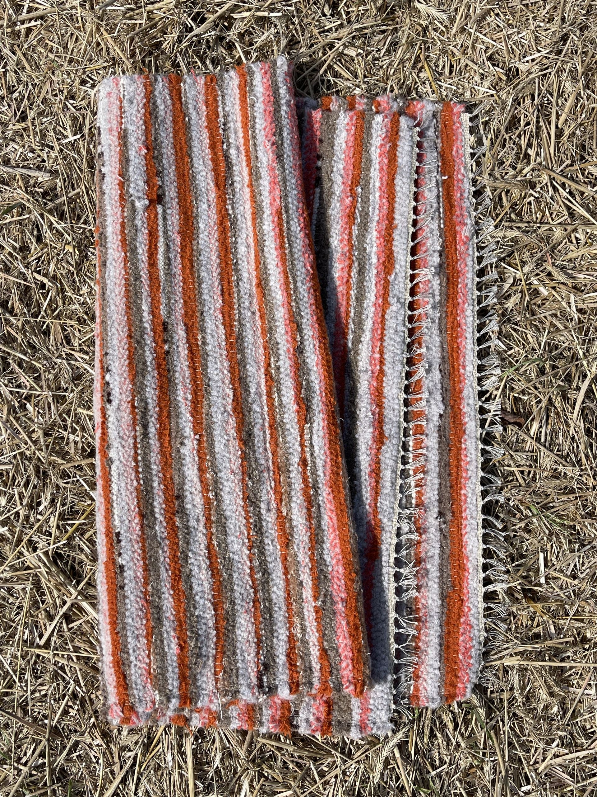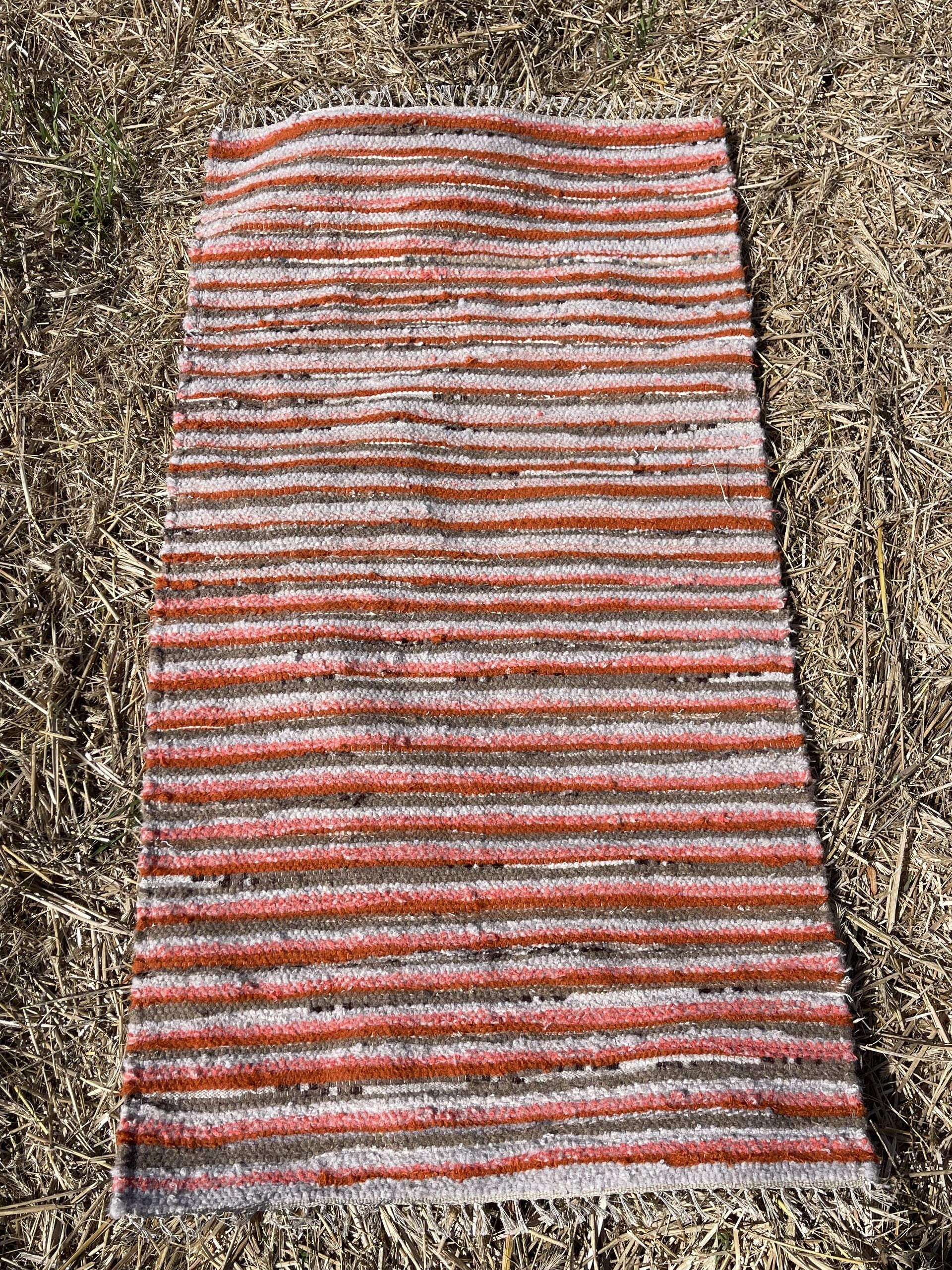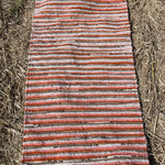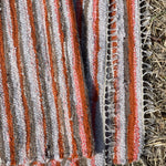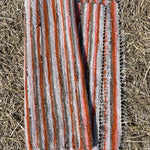 Oranžas, gaiši pelēkas, brūnas svītriņas, vilnas auduma grīdceliņš ~70x130cm