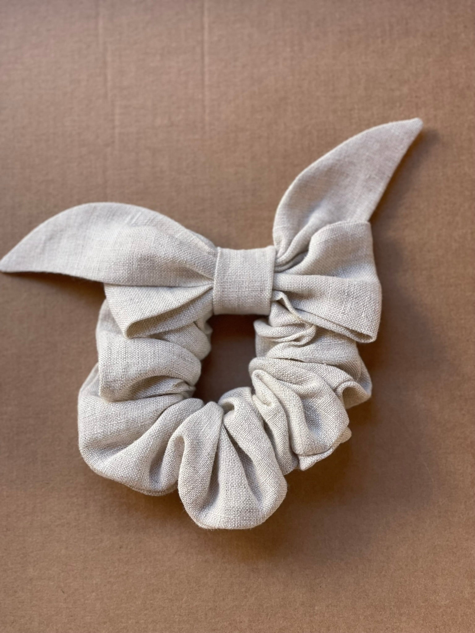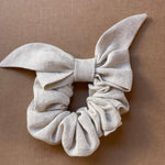 Lina auduma matu gumija - scrunchie - ar dekoratīvu banti Gaiši dabīgi pelēka lina tonis