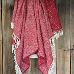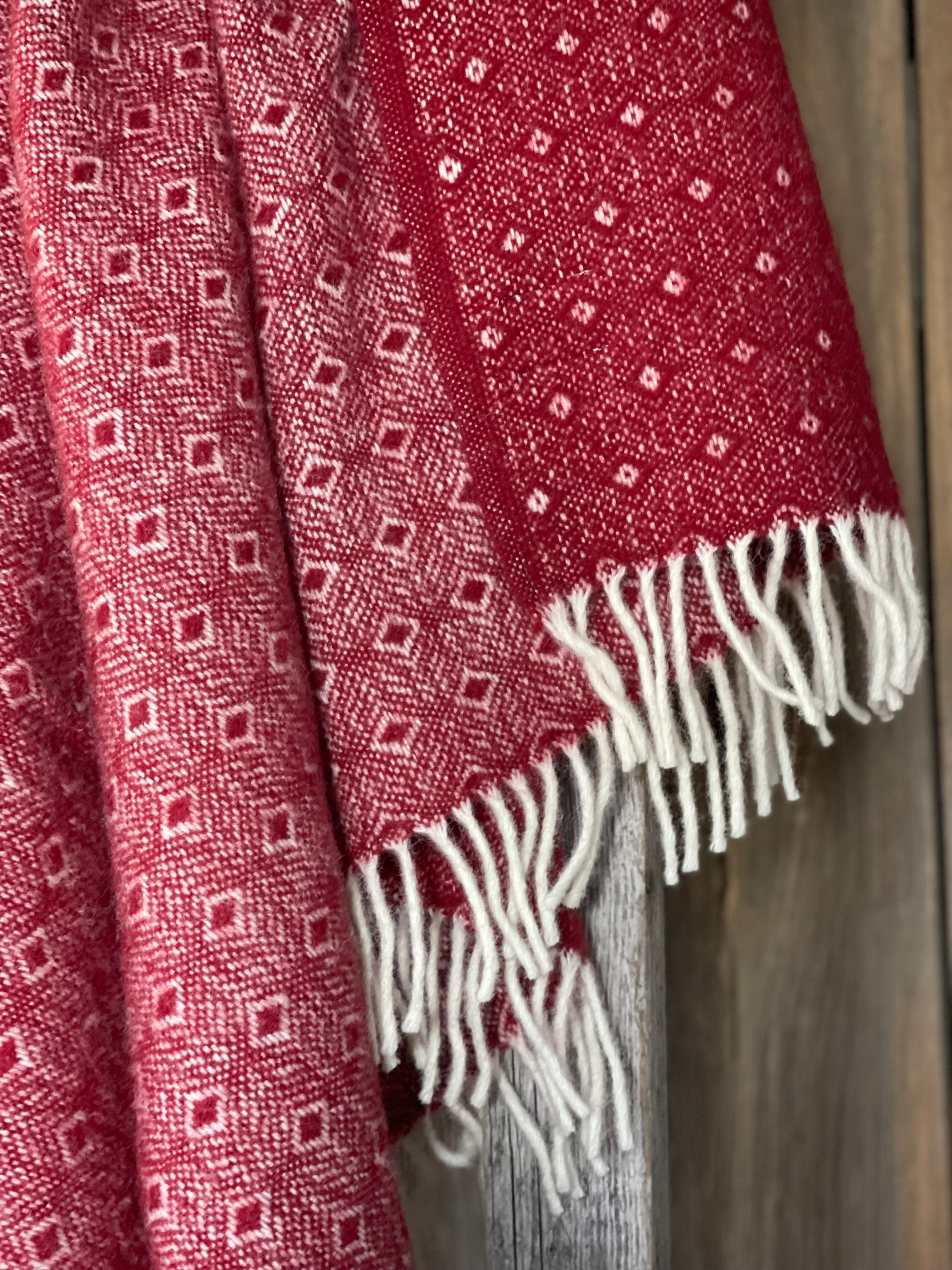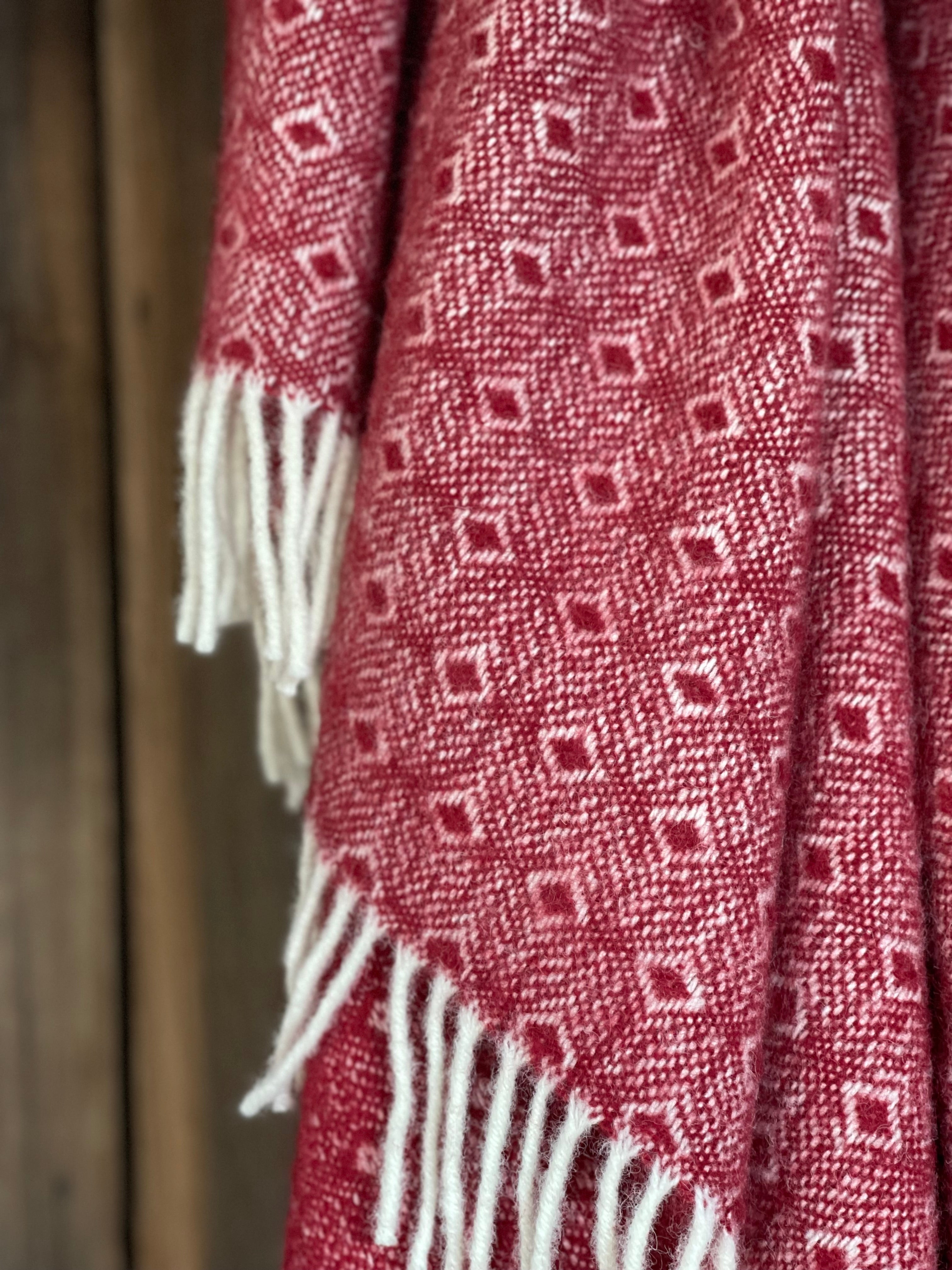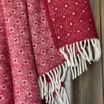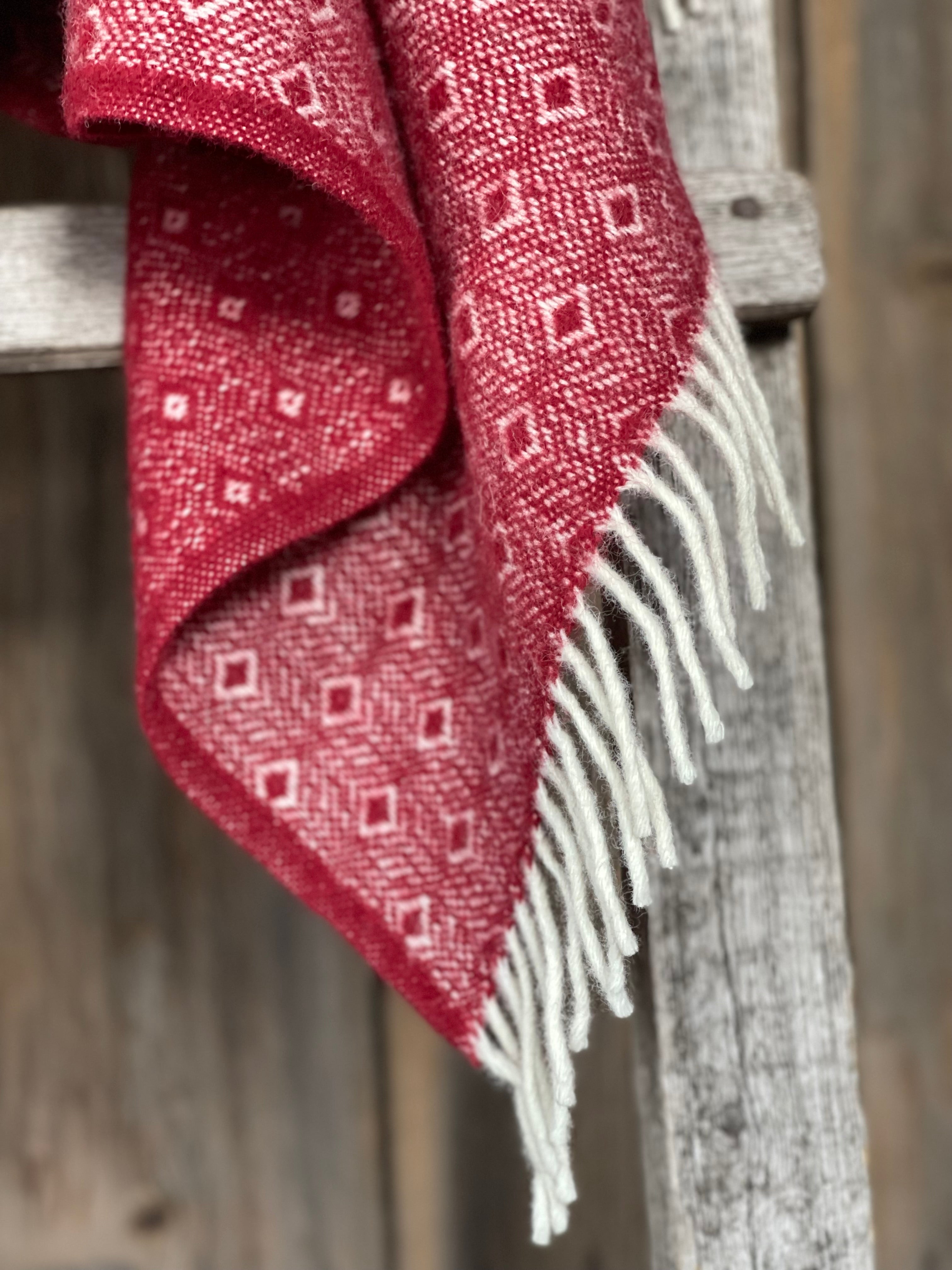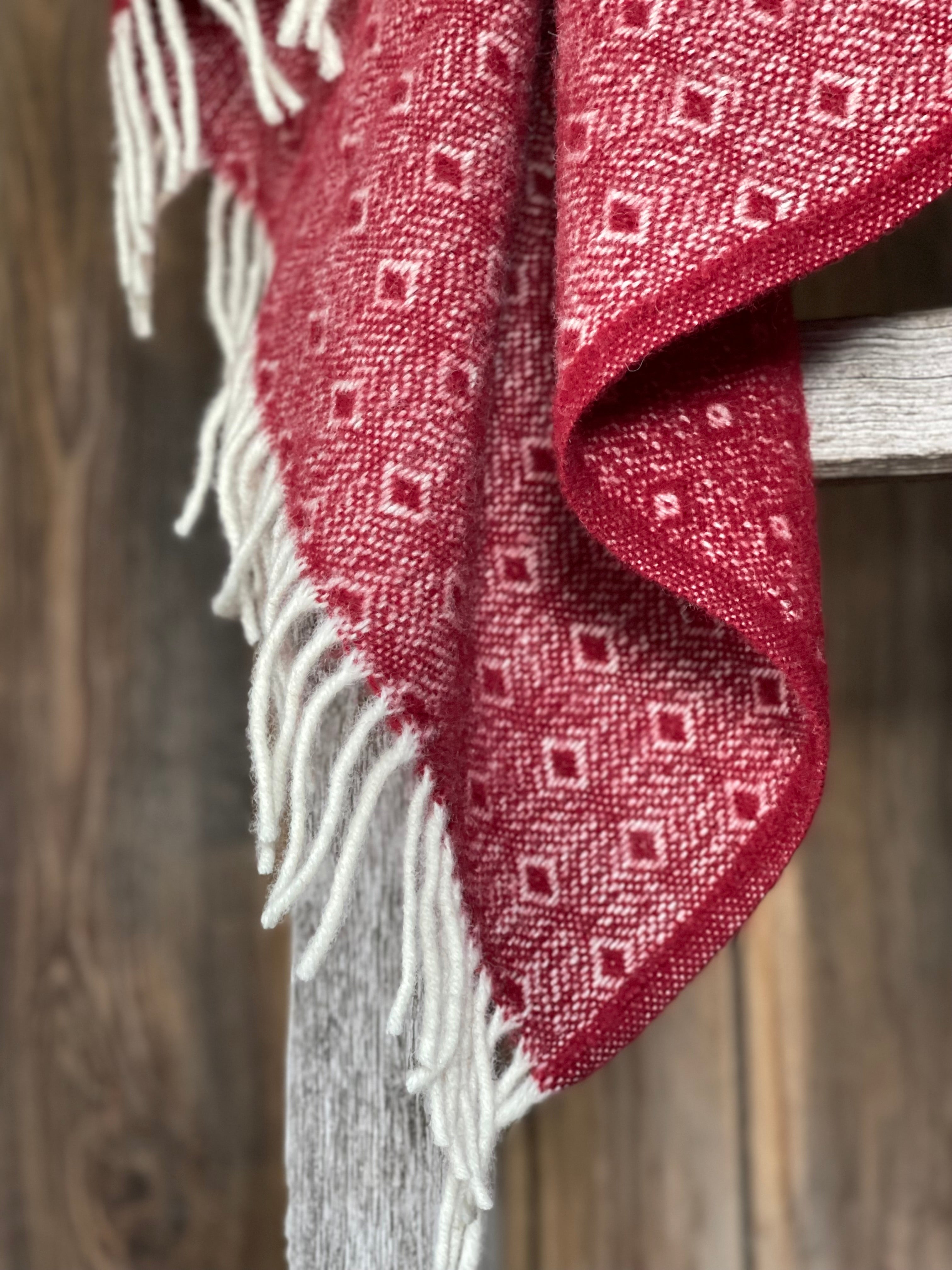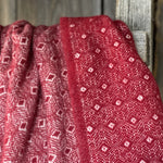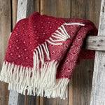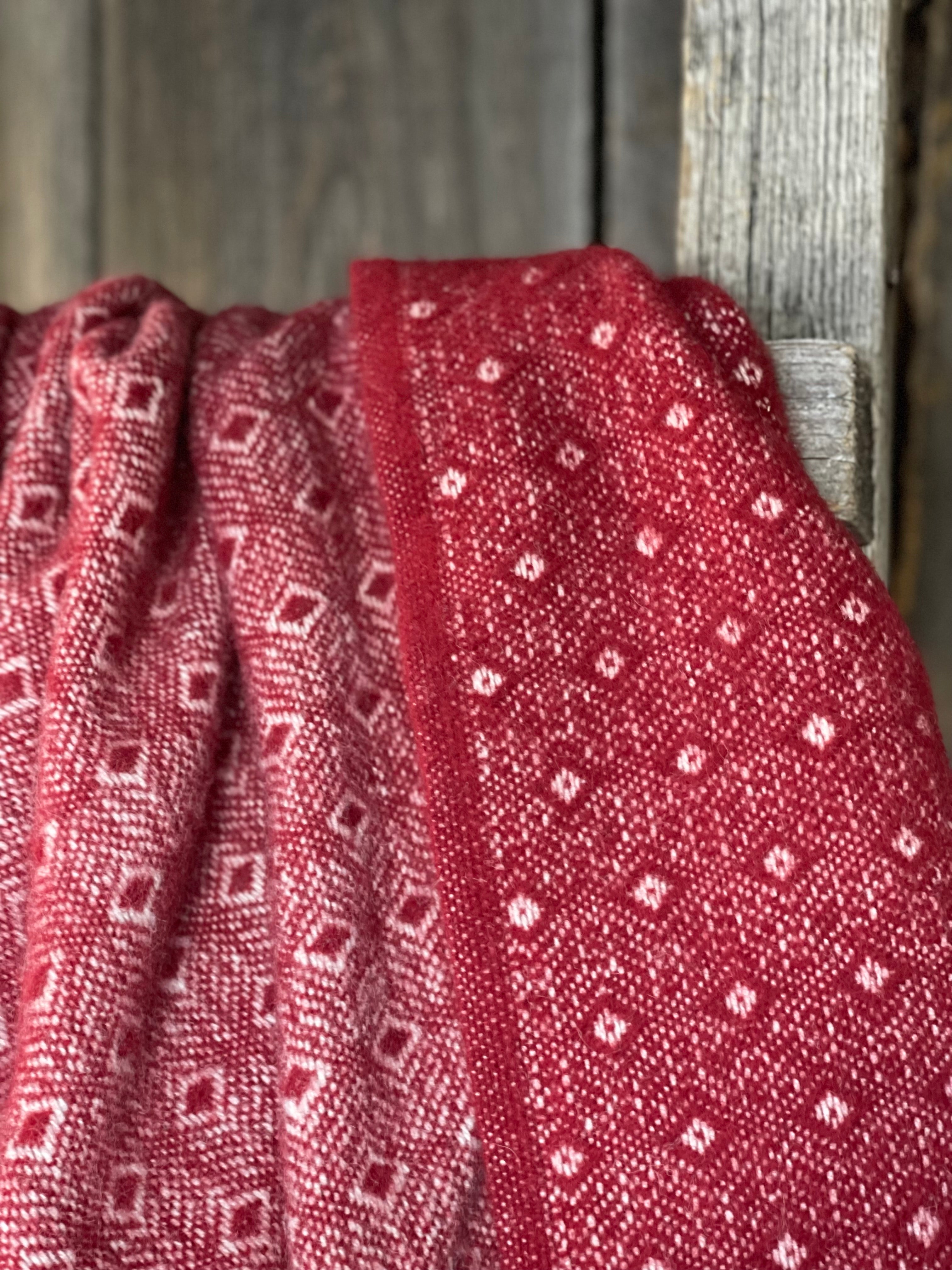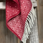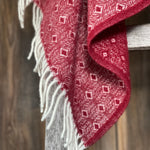 Sarkans aitas vilnas pleds ar baltu ornamentu un baltām bārkstīm 130x200cm