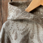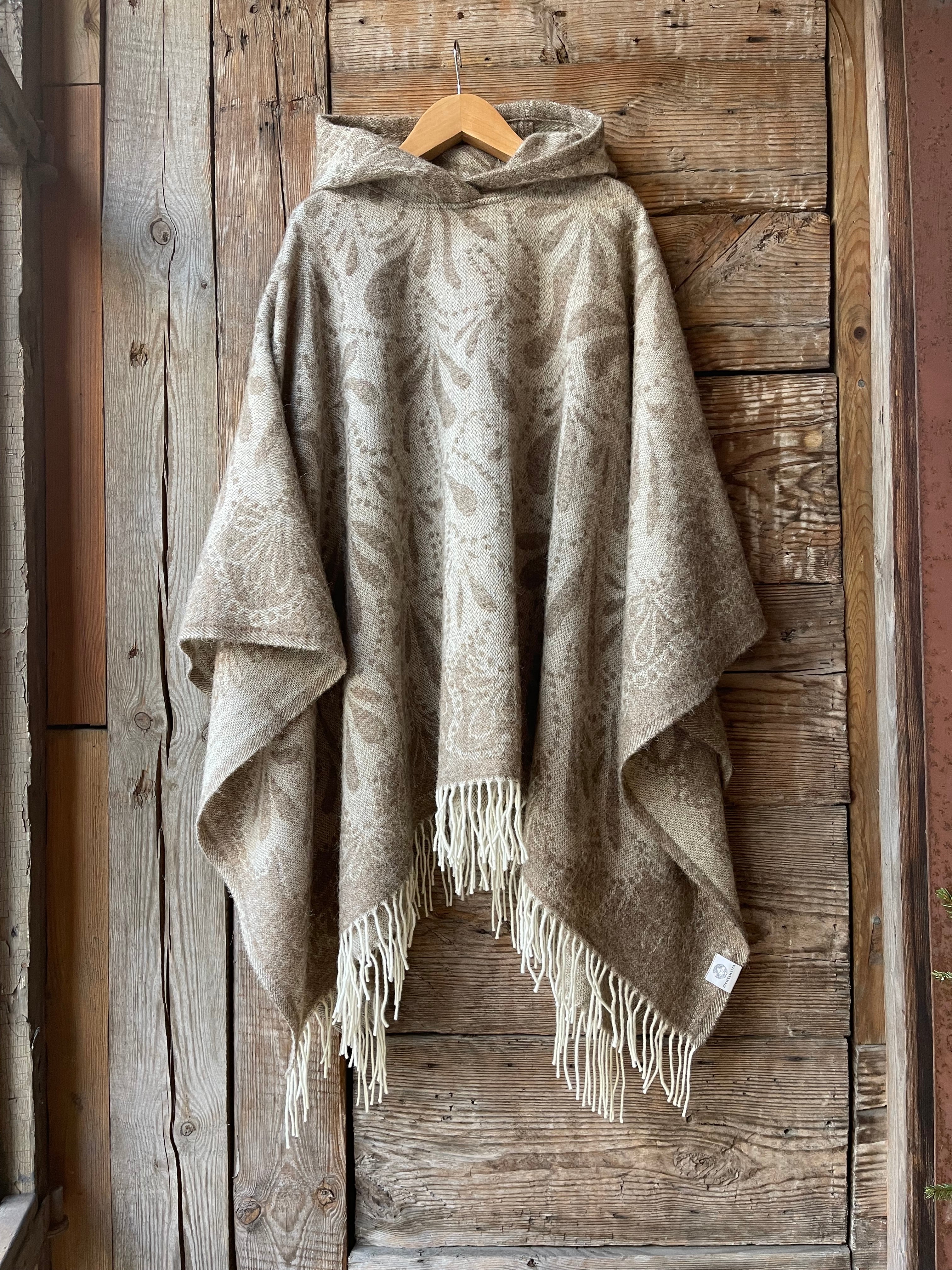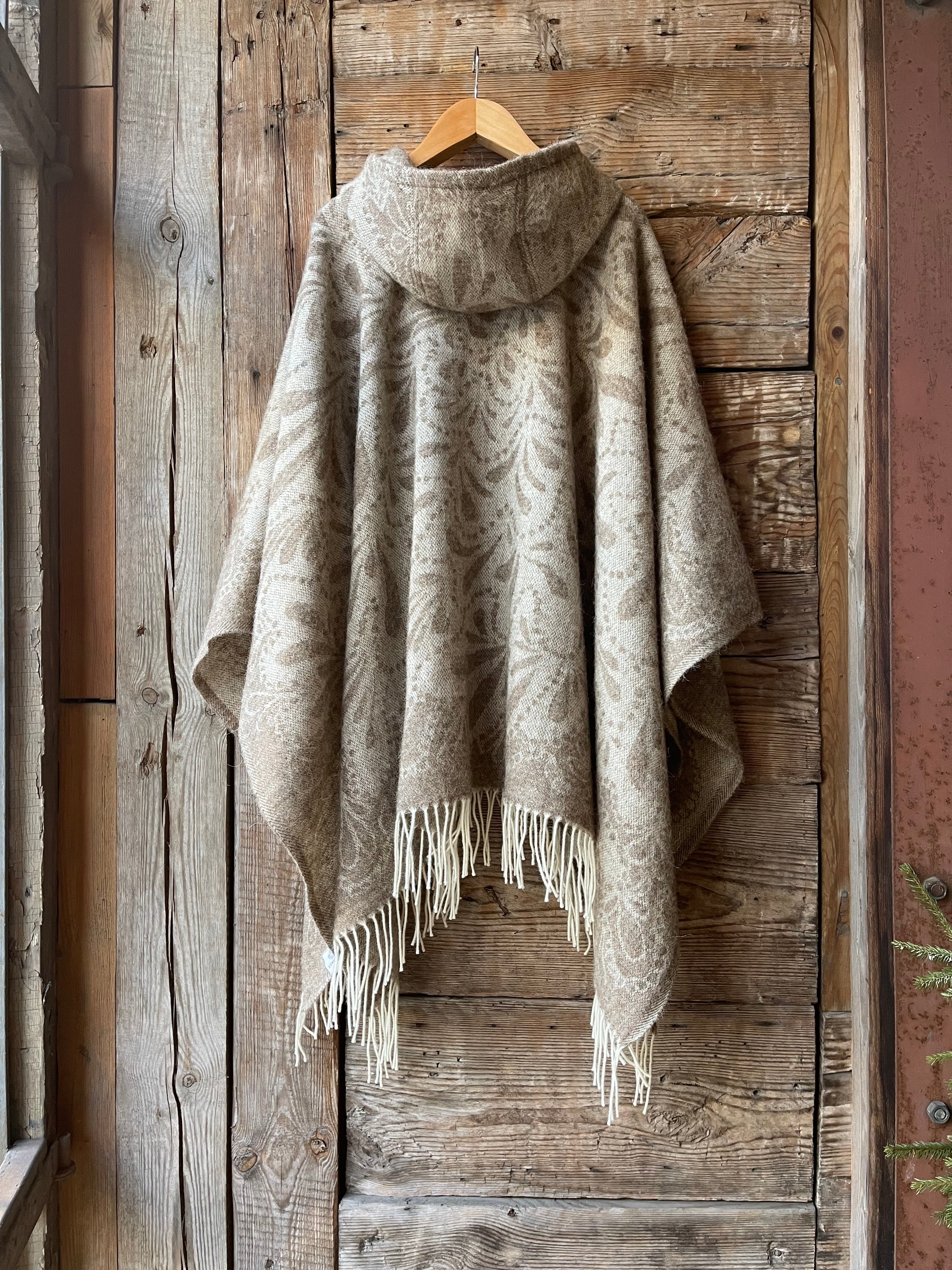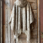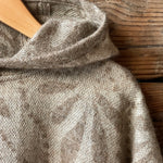 Dūmakaini brūna toņa indiāņu piegriezuma garais mohēras/alpakas/aitas vilnas pončo ar kapuci un bārkstīm ar lāsīšu dizainu