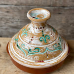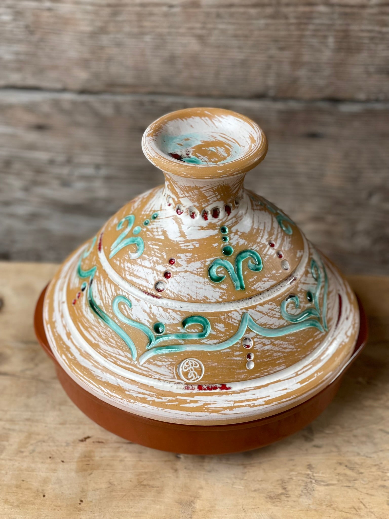 Tadžina 24 cm dia ar gaiši brūnu/baltu vāku, reljefu zaļu marokāņu stila ornamentu un brūnu šķīvi