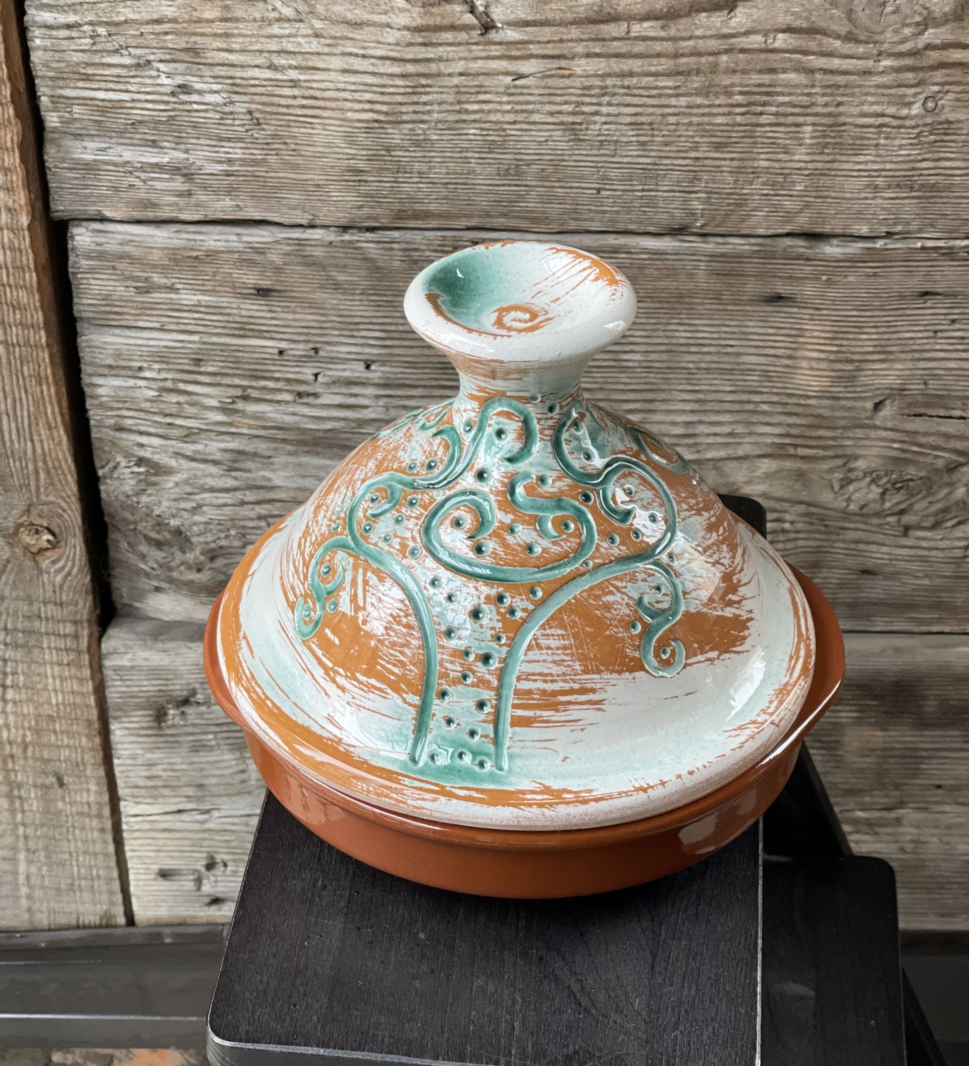 Tadžina 20 cm dia ar baltu/zaļu/brūnu vāku ar reljefu marokāņu ornamentu un brūnu šķīvi
