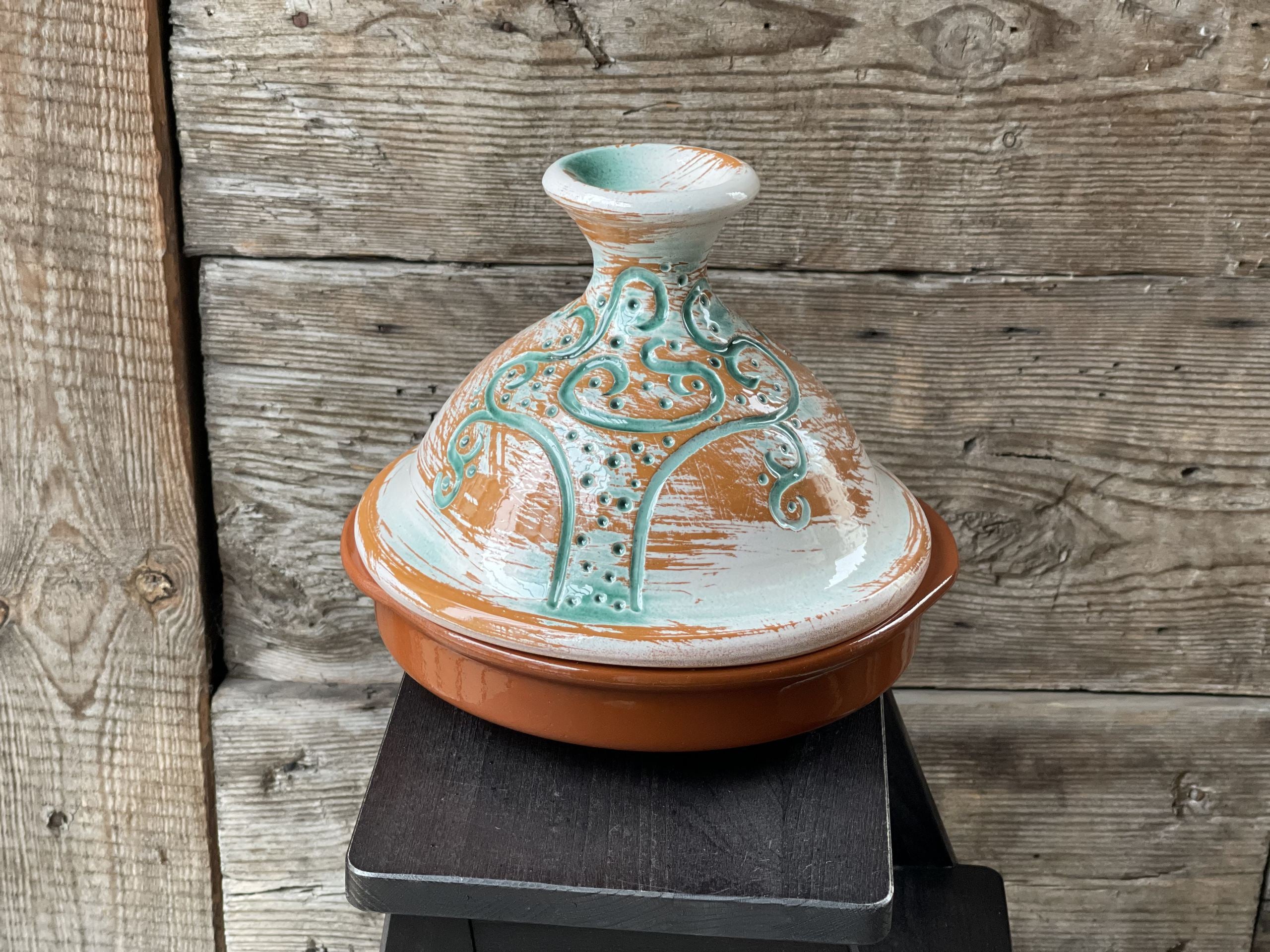 Tadžina 28 cm dia ar baltu vāku, reljefu marokāņu stila ornamentu zaļos/zilos toņos un brūnu šķīvi