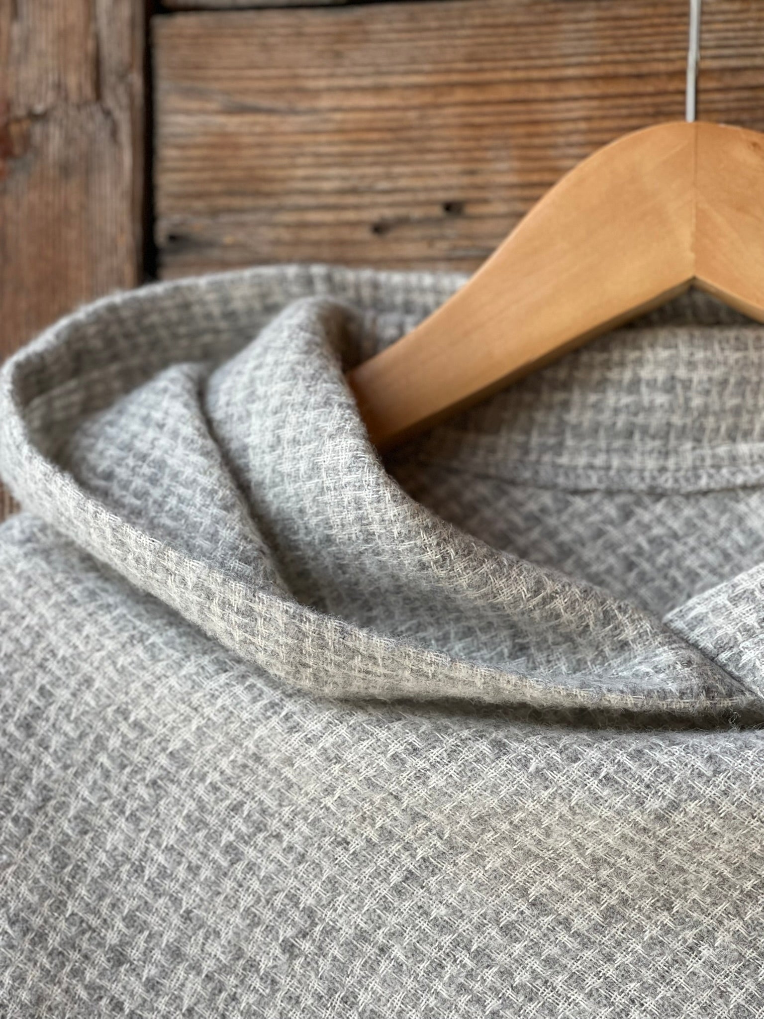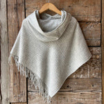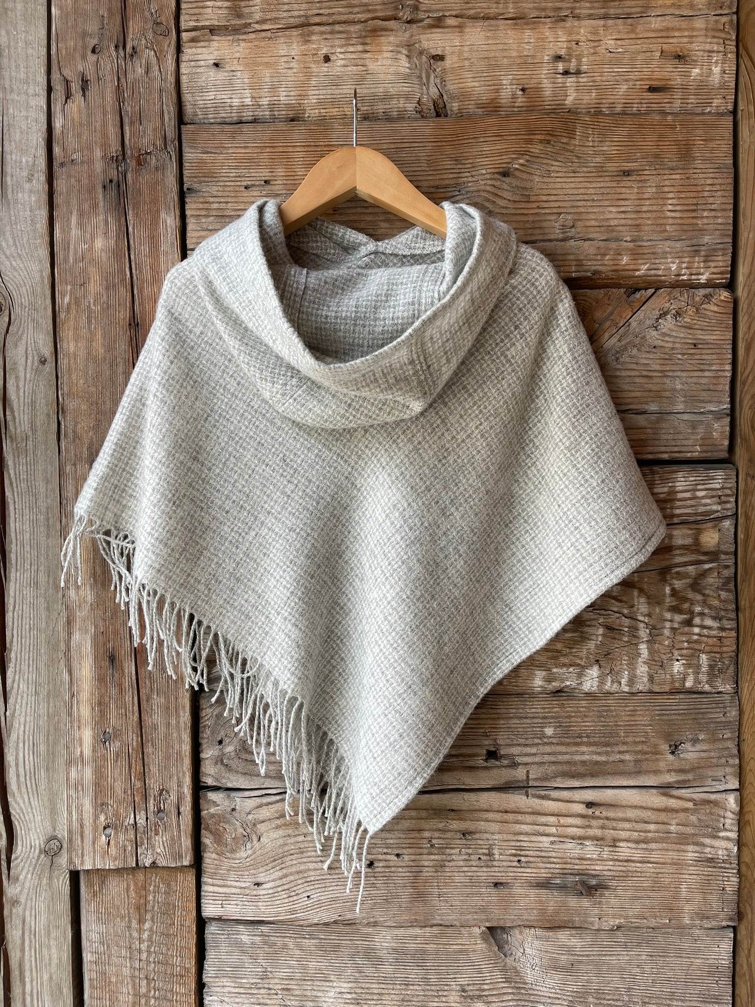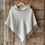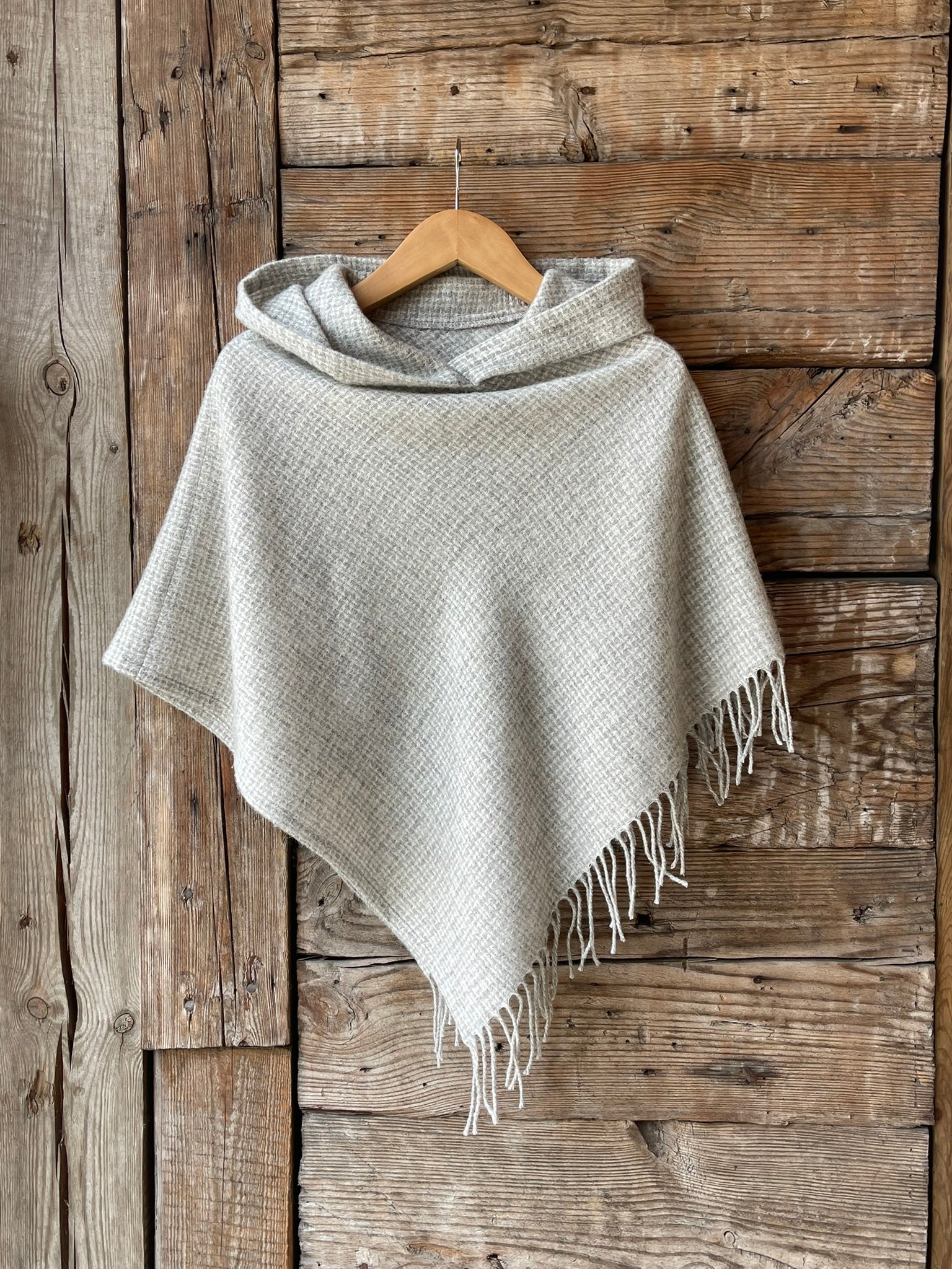 Gaiši pelēka toņa aitas vilnas/bambusa sķiedras pončo ar kapuci un bārkstīm