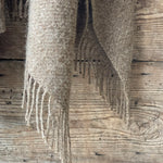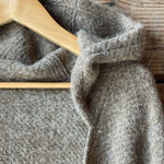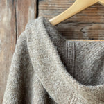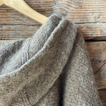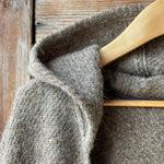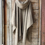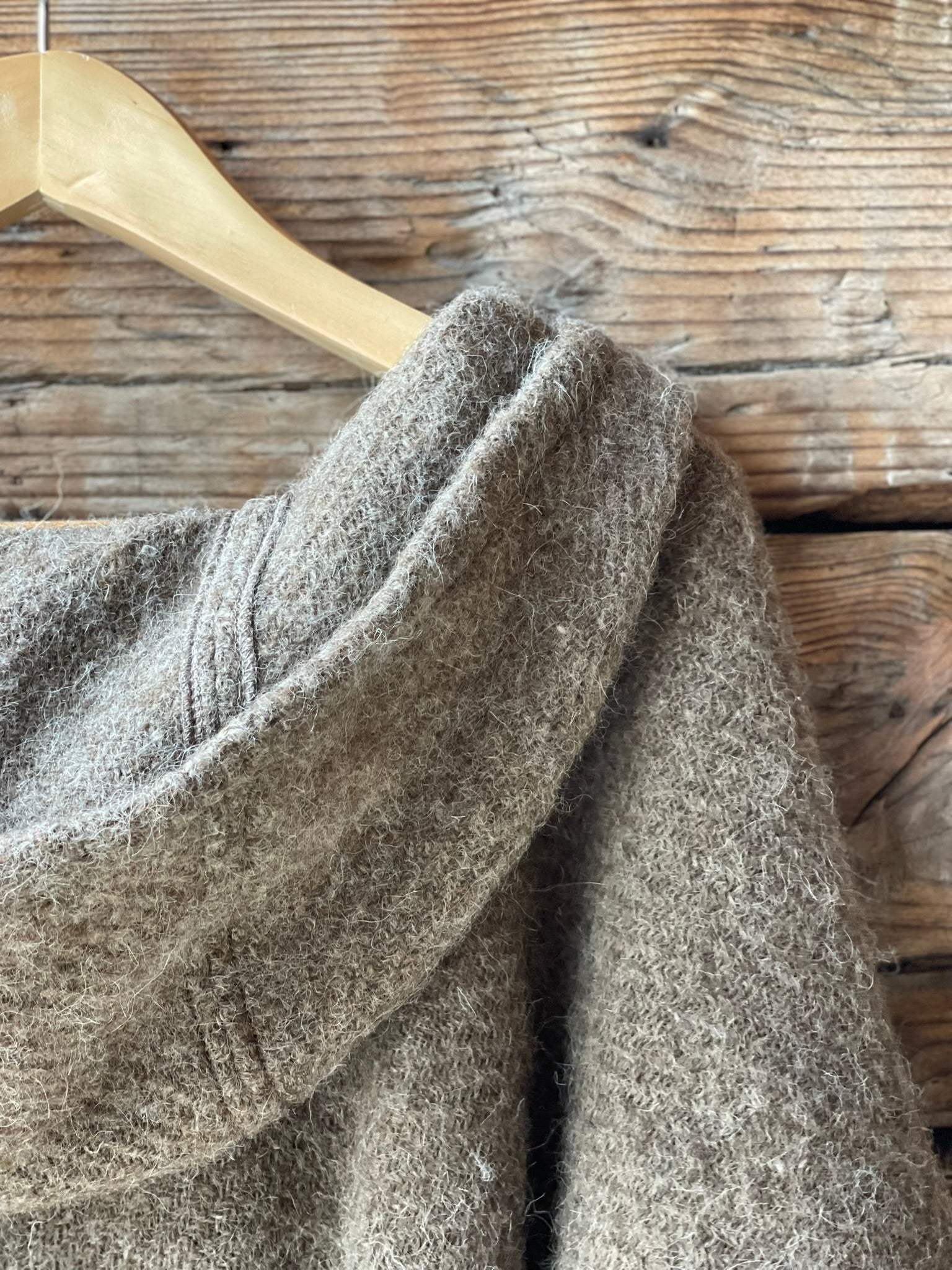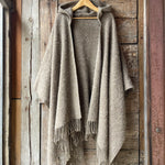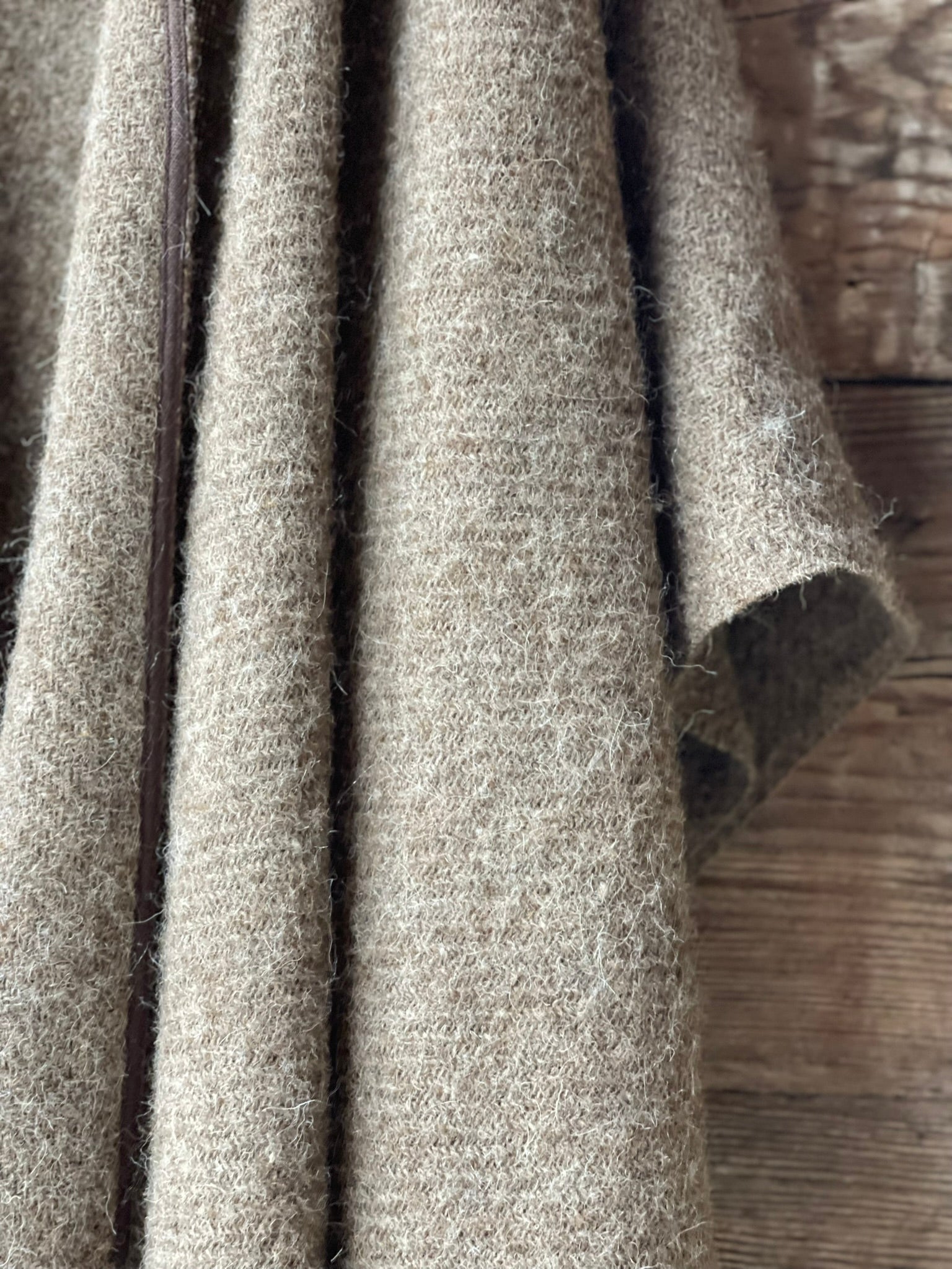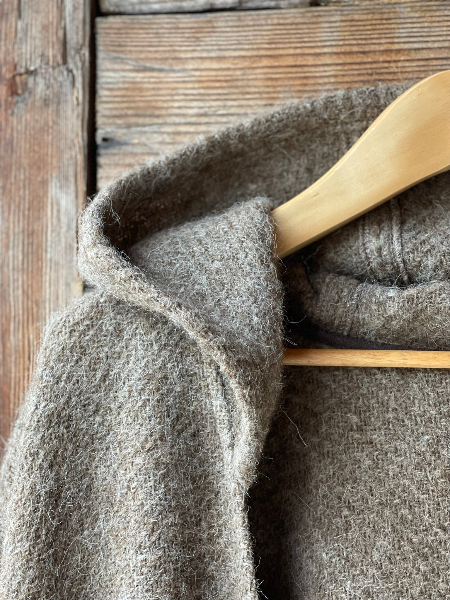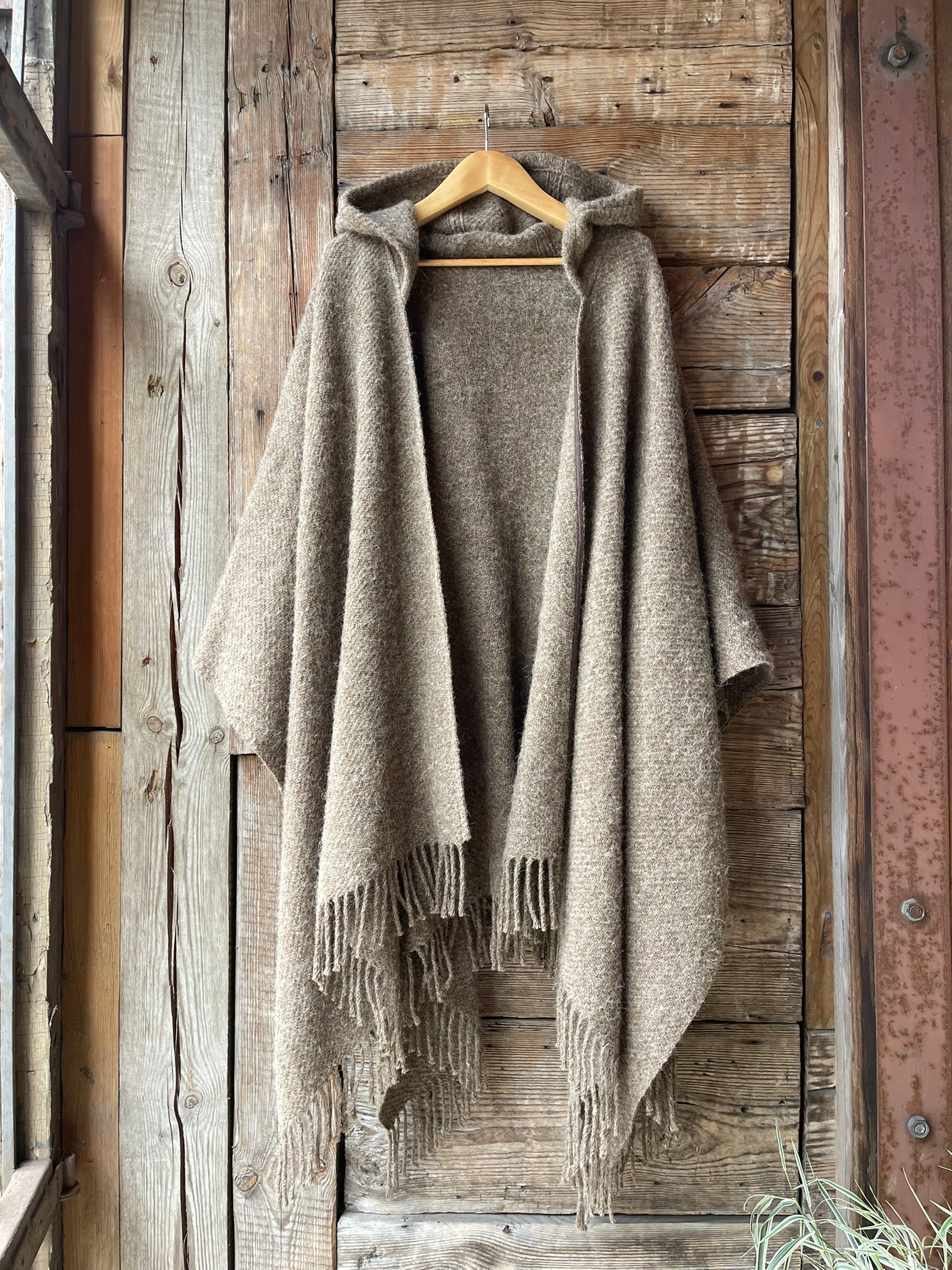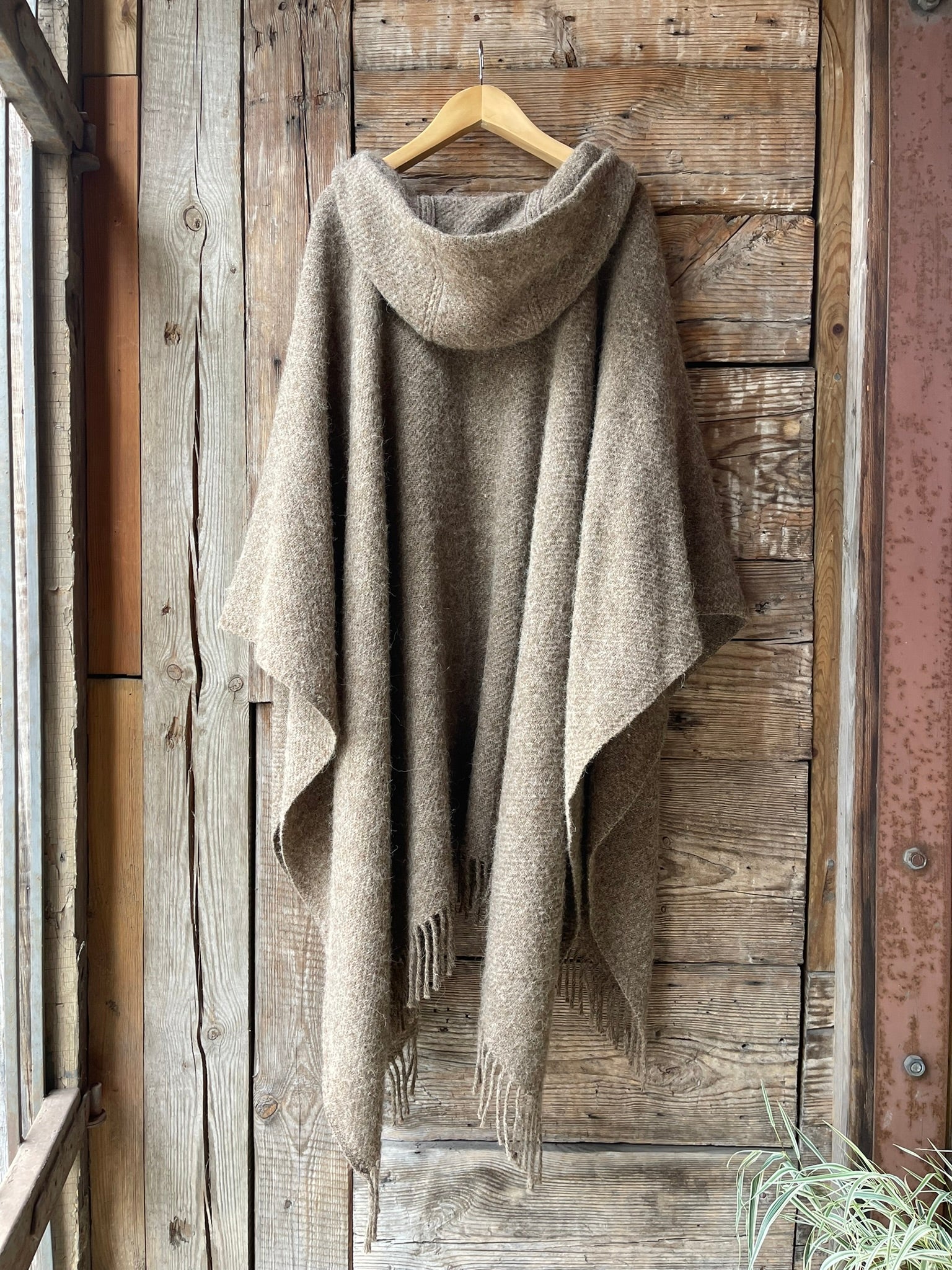 Trifeļu brūna toņa pončo ar kapuci un bārkstīm no aitas/alpakas/mohēras vilnas auduma, klasisks piegriezums