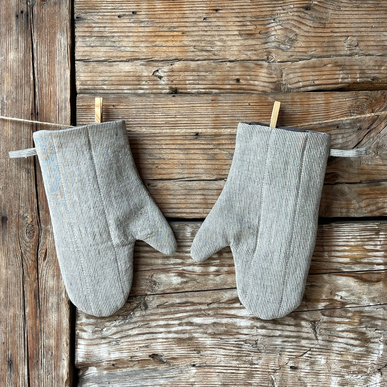 Komplekts 2 gab.: Gaiši zilas/dabīgi pelēkas sīkas svītriņas (~1.25mm), nekrāsota lina karstuma cimdiņš