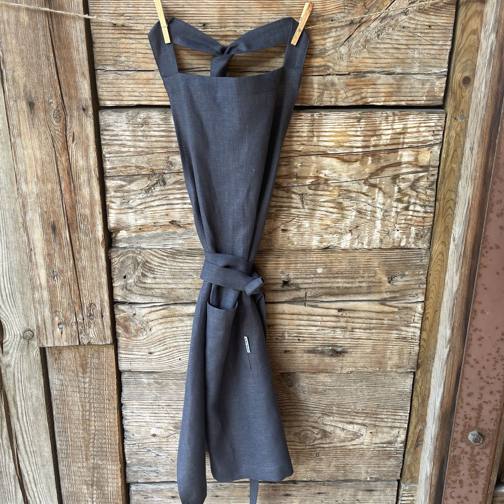 Tumši pelēka lina auduma priekšauts ar kabatiņu un regulējamām lencēm
