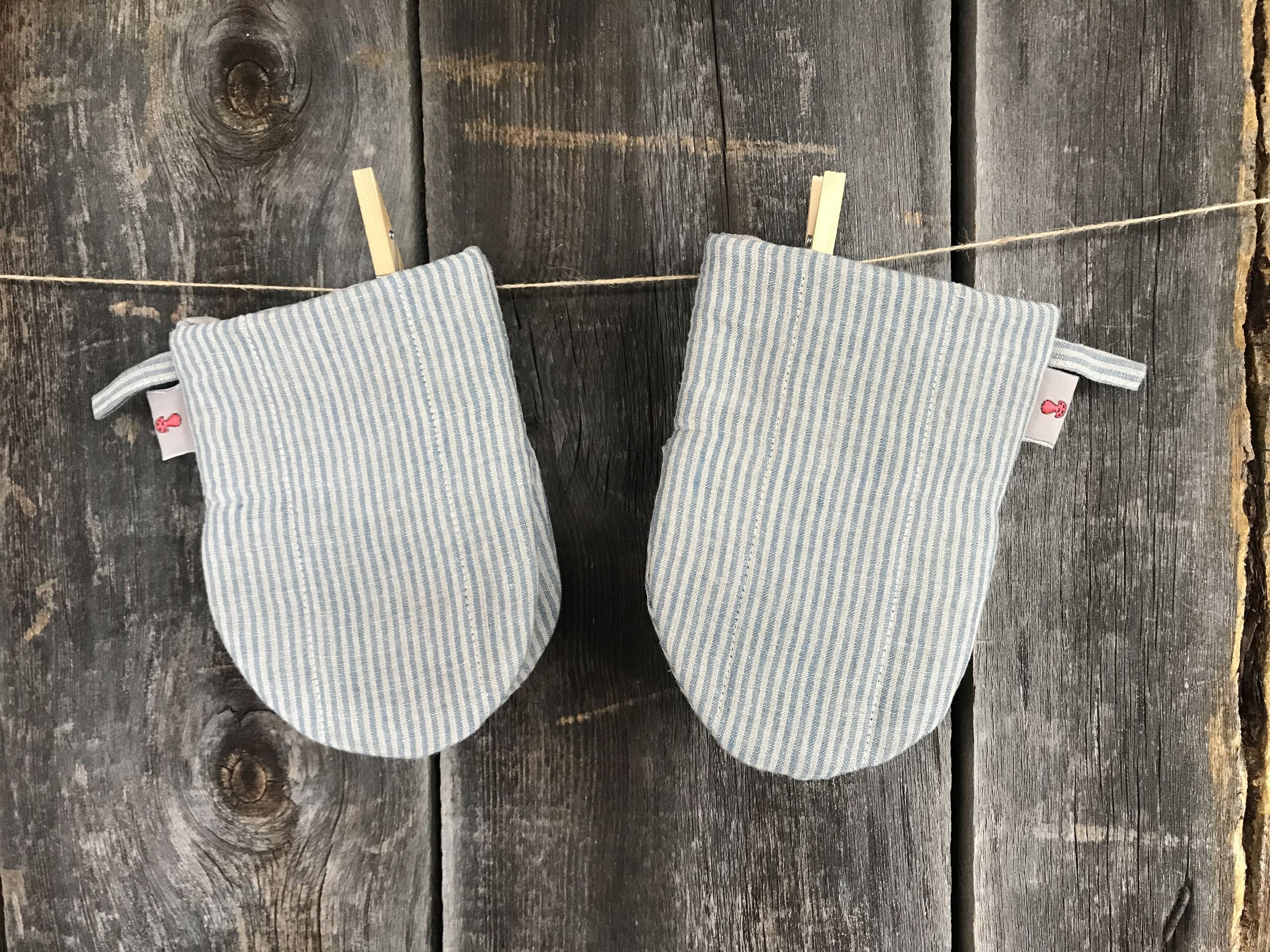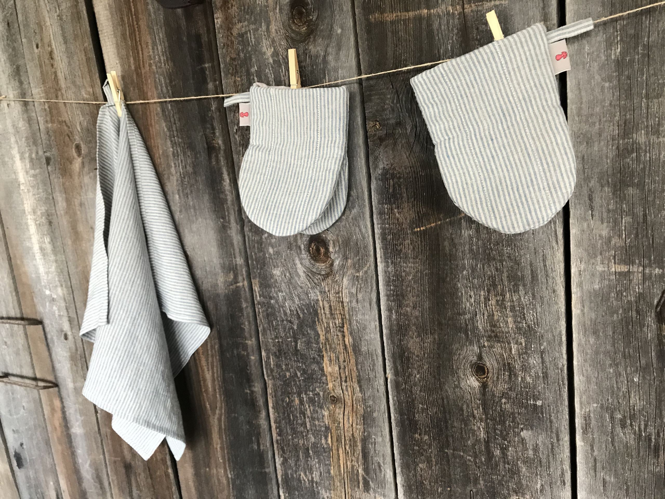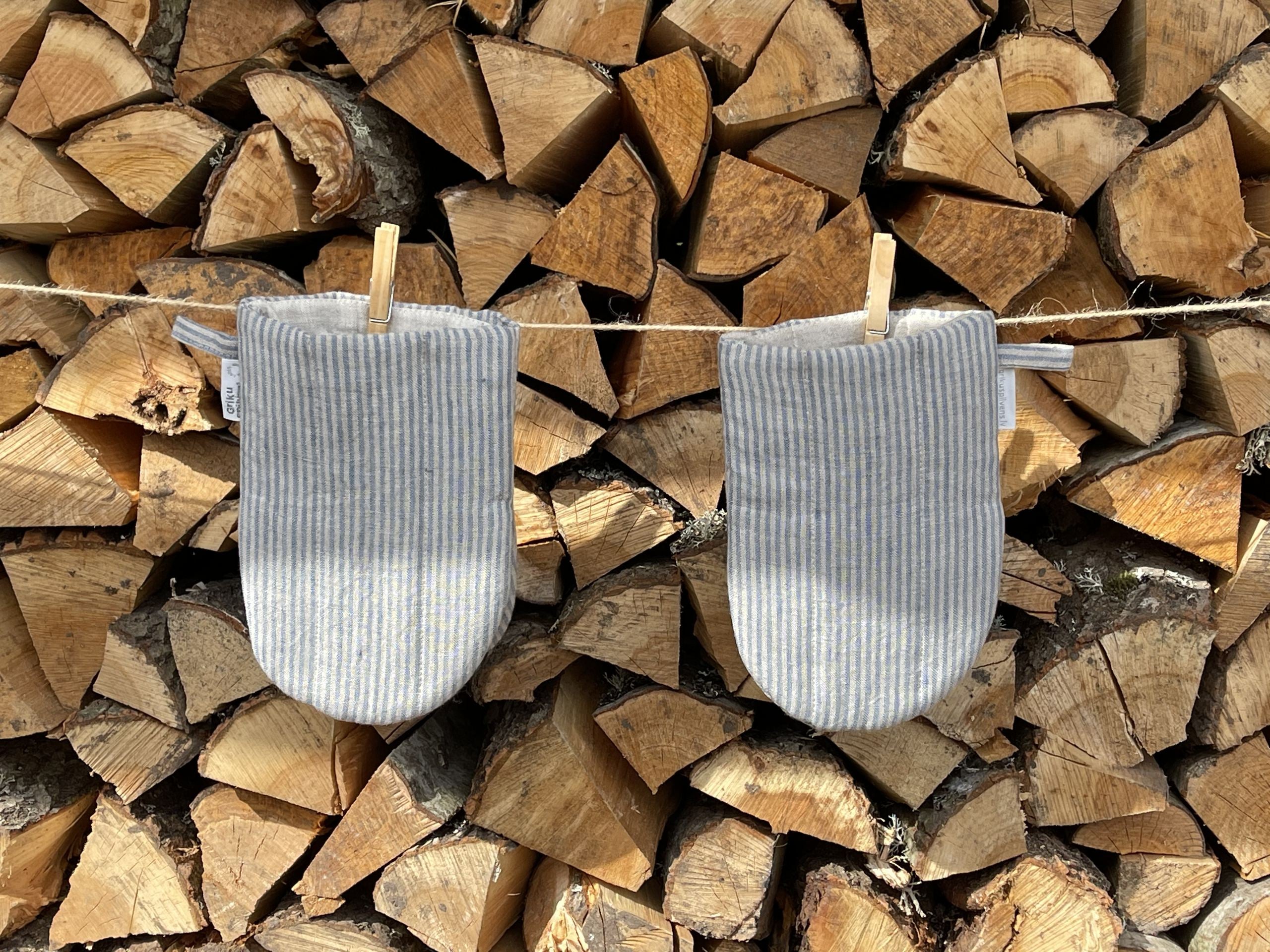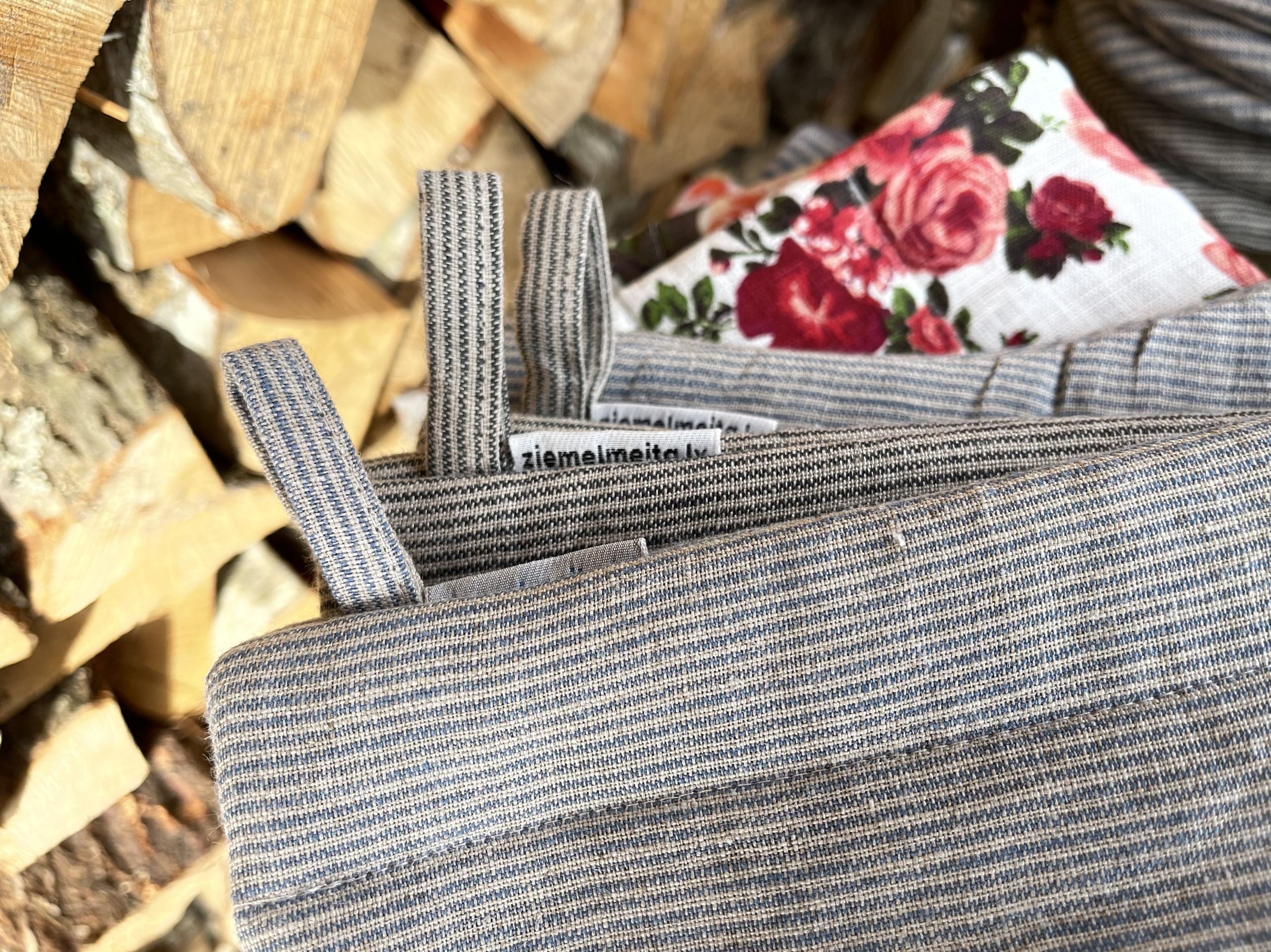 Divi dabīgi pelēki lina un vatelīna karstuma knābīši ar gaiši zilām svītriņām