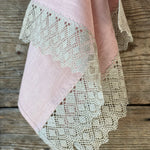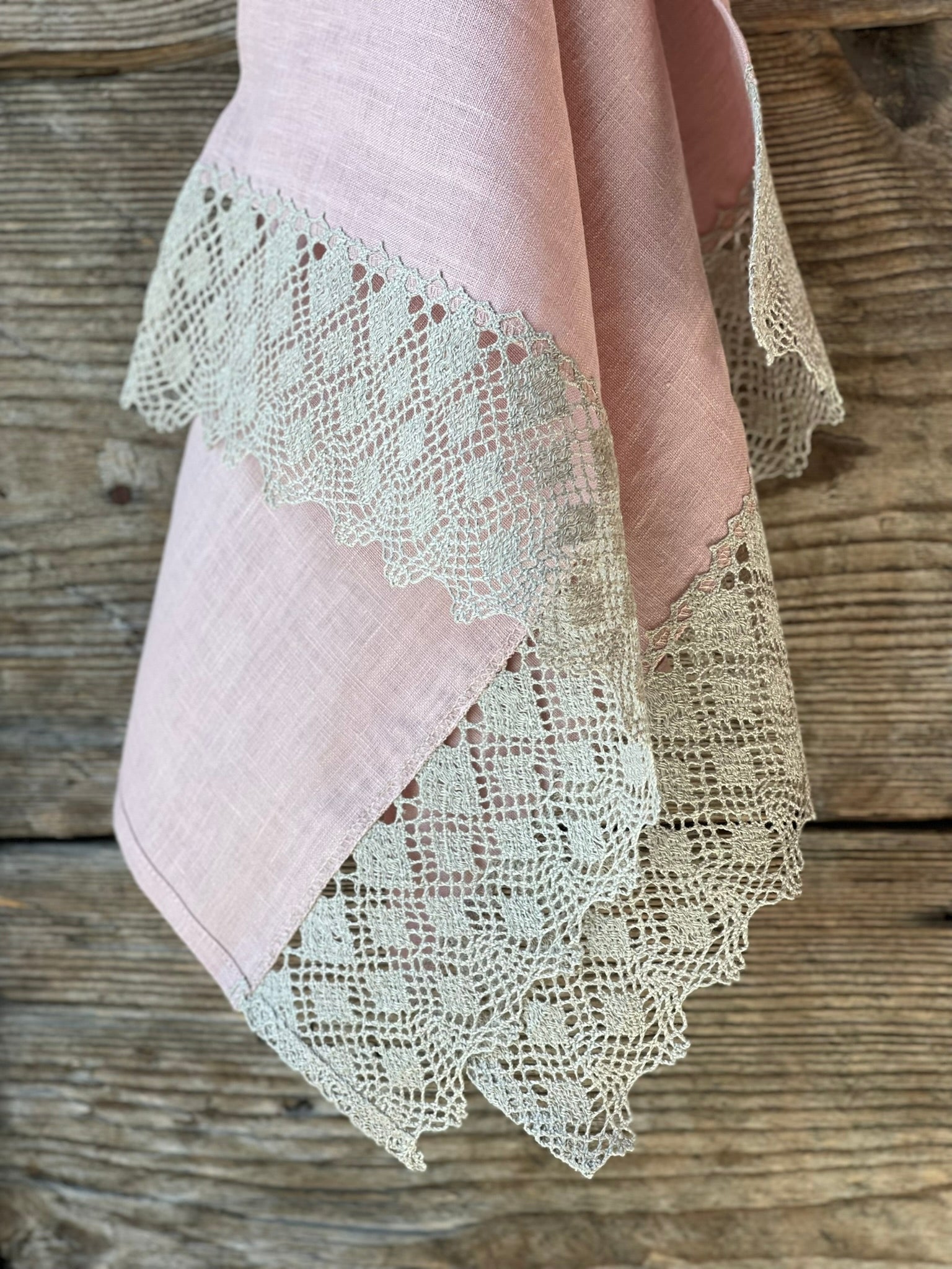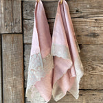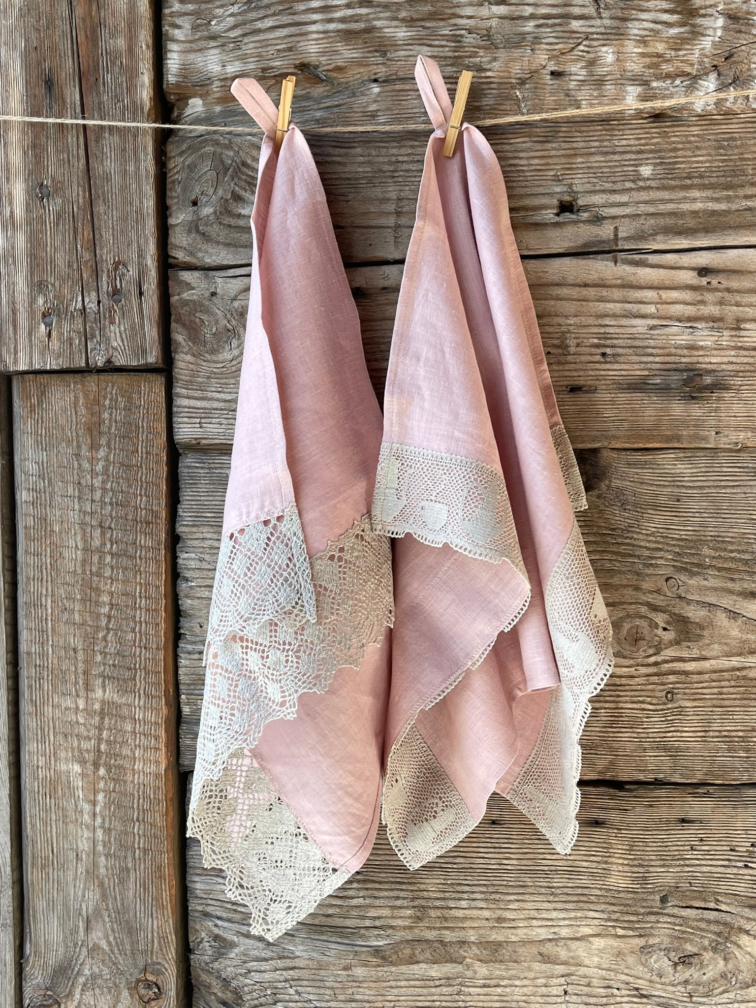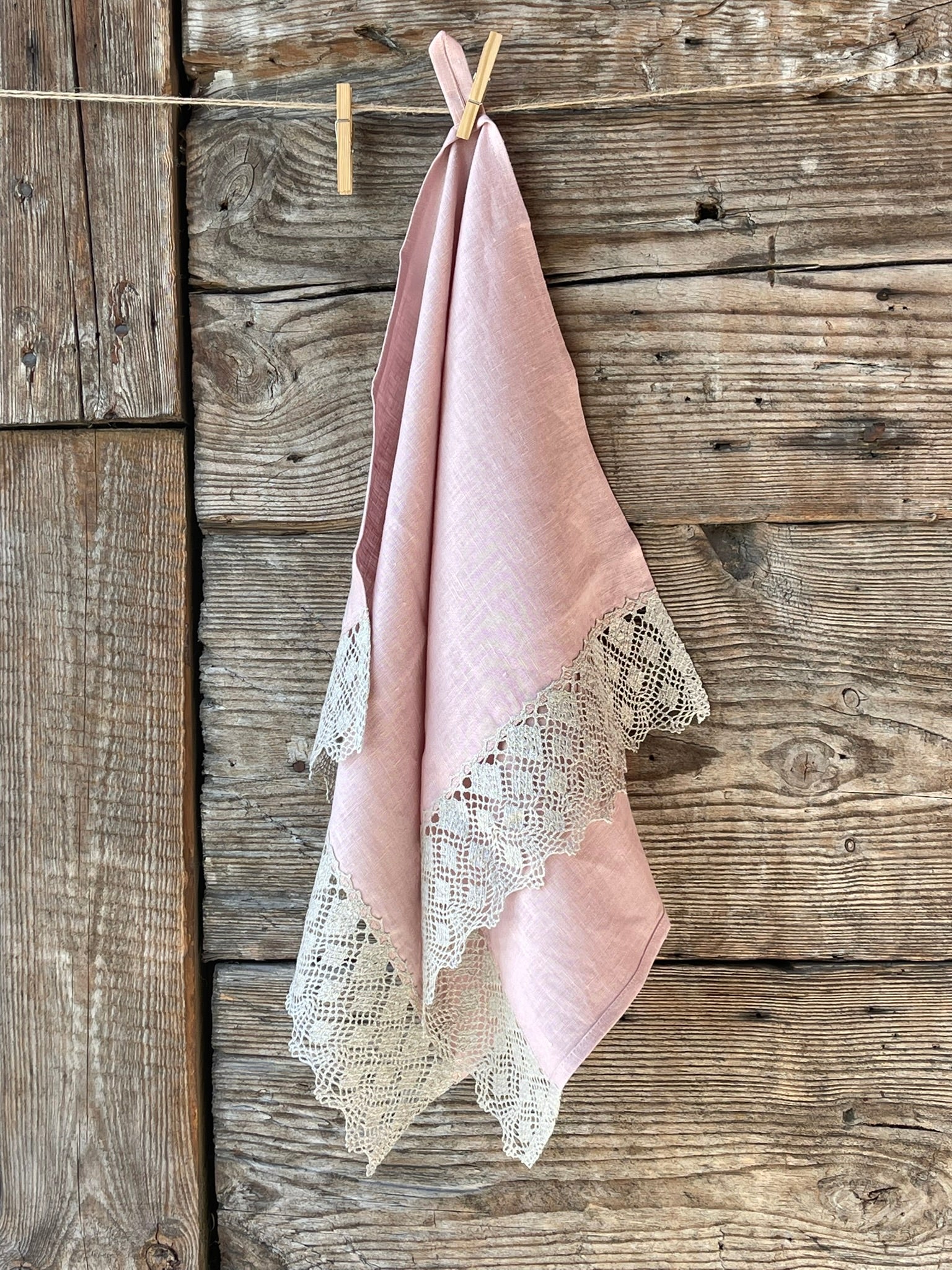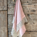 Mīkstināta lina dvielītis maigi rozā toņī ar dabīgi pelēka toņa platu greznu lina mežģīni