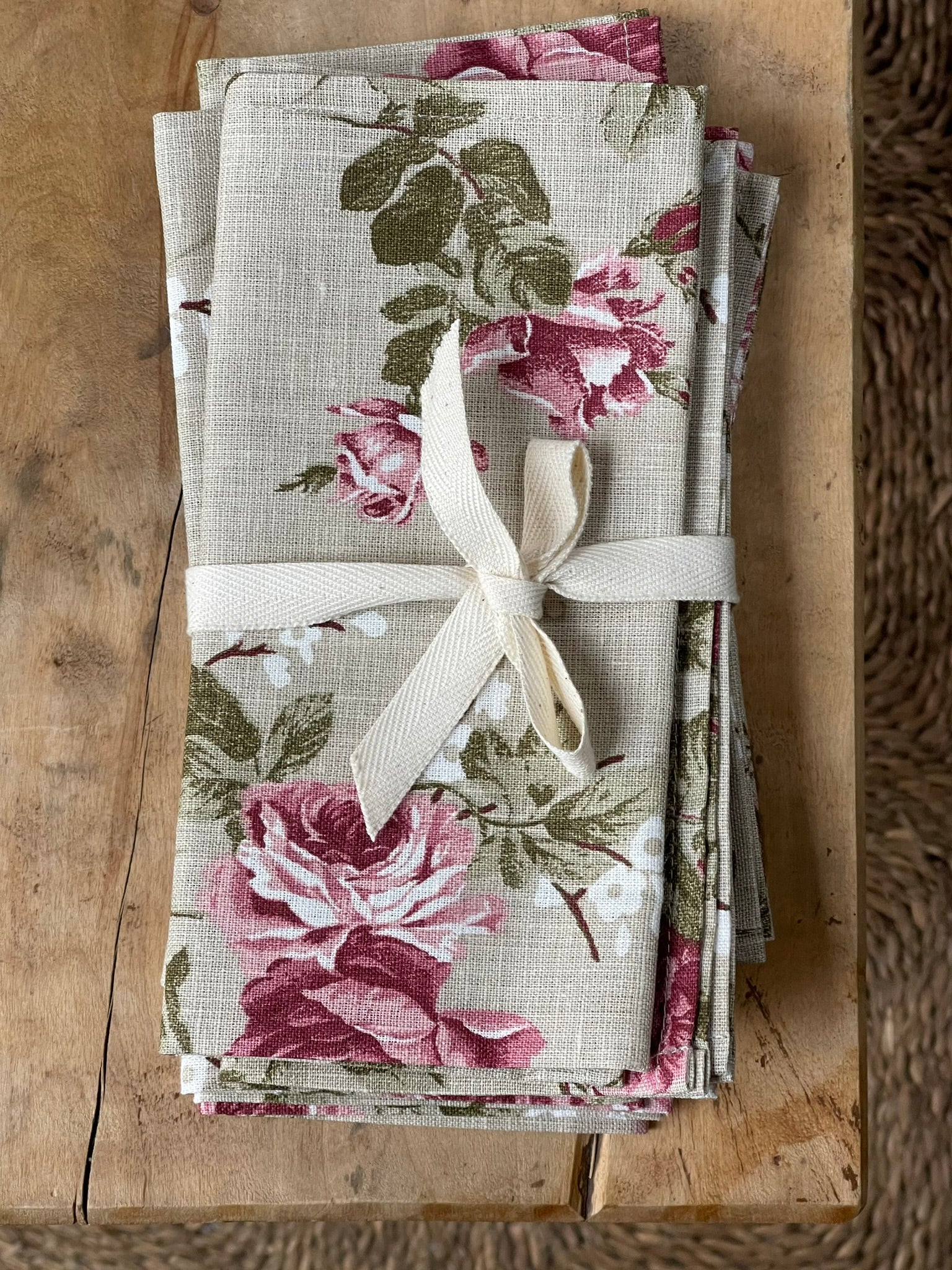 Lina galda salvetes ar šaurām maliņām, vintage rožu dizains, dažādi izmēri