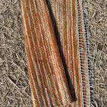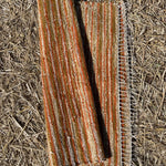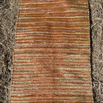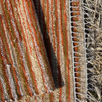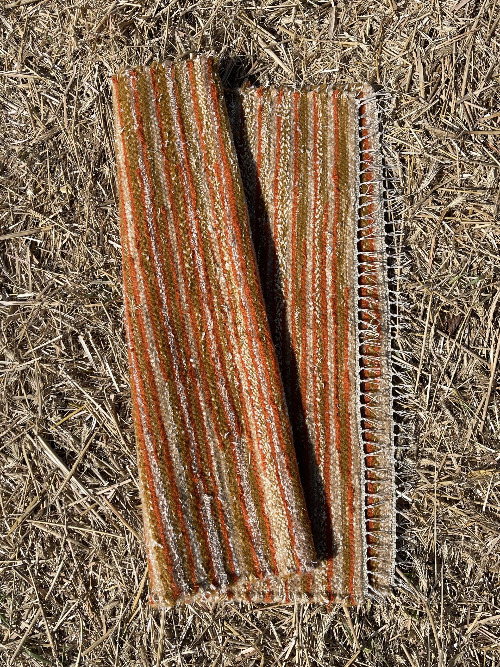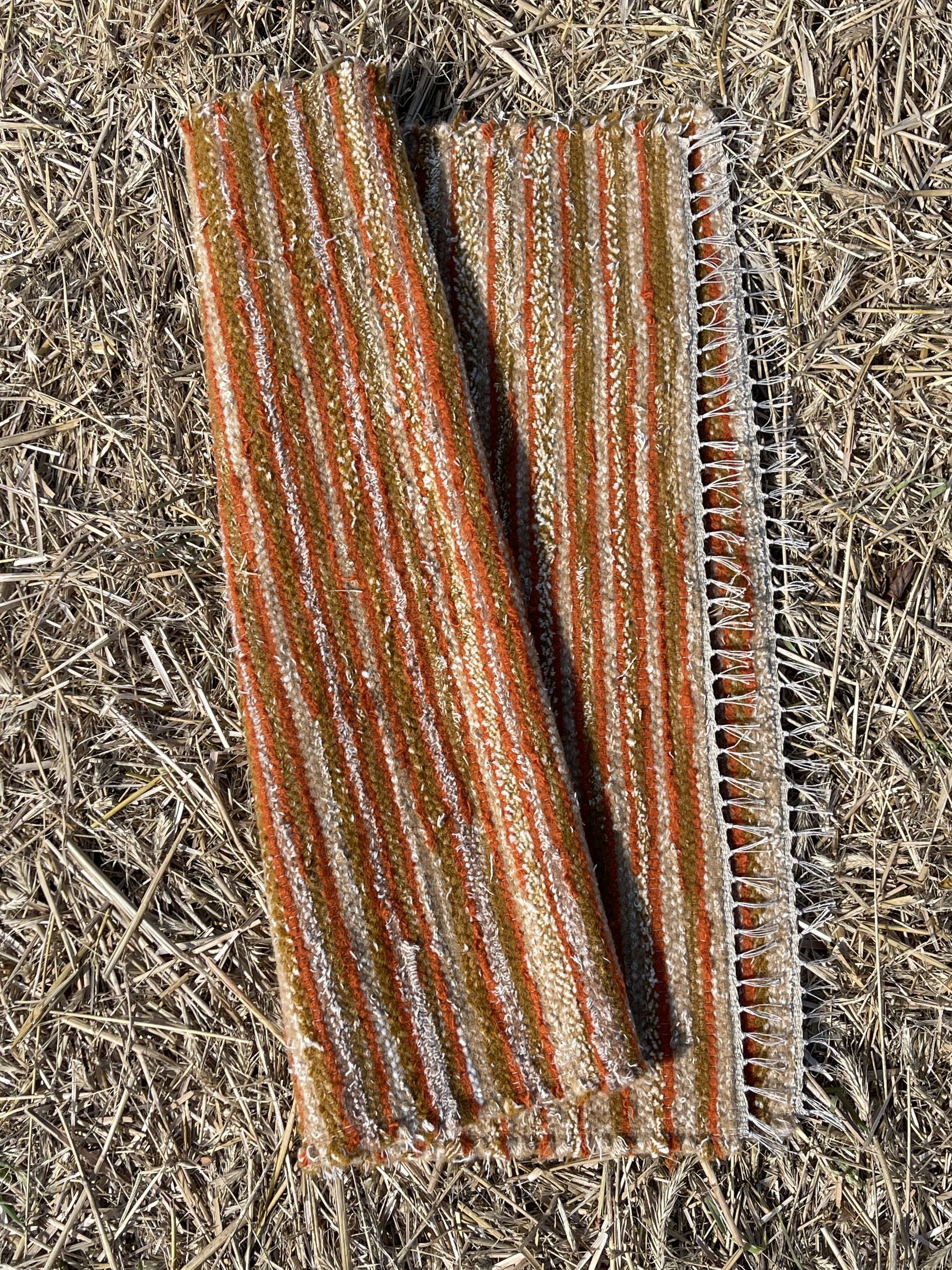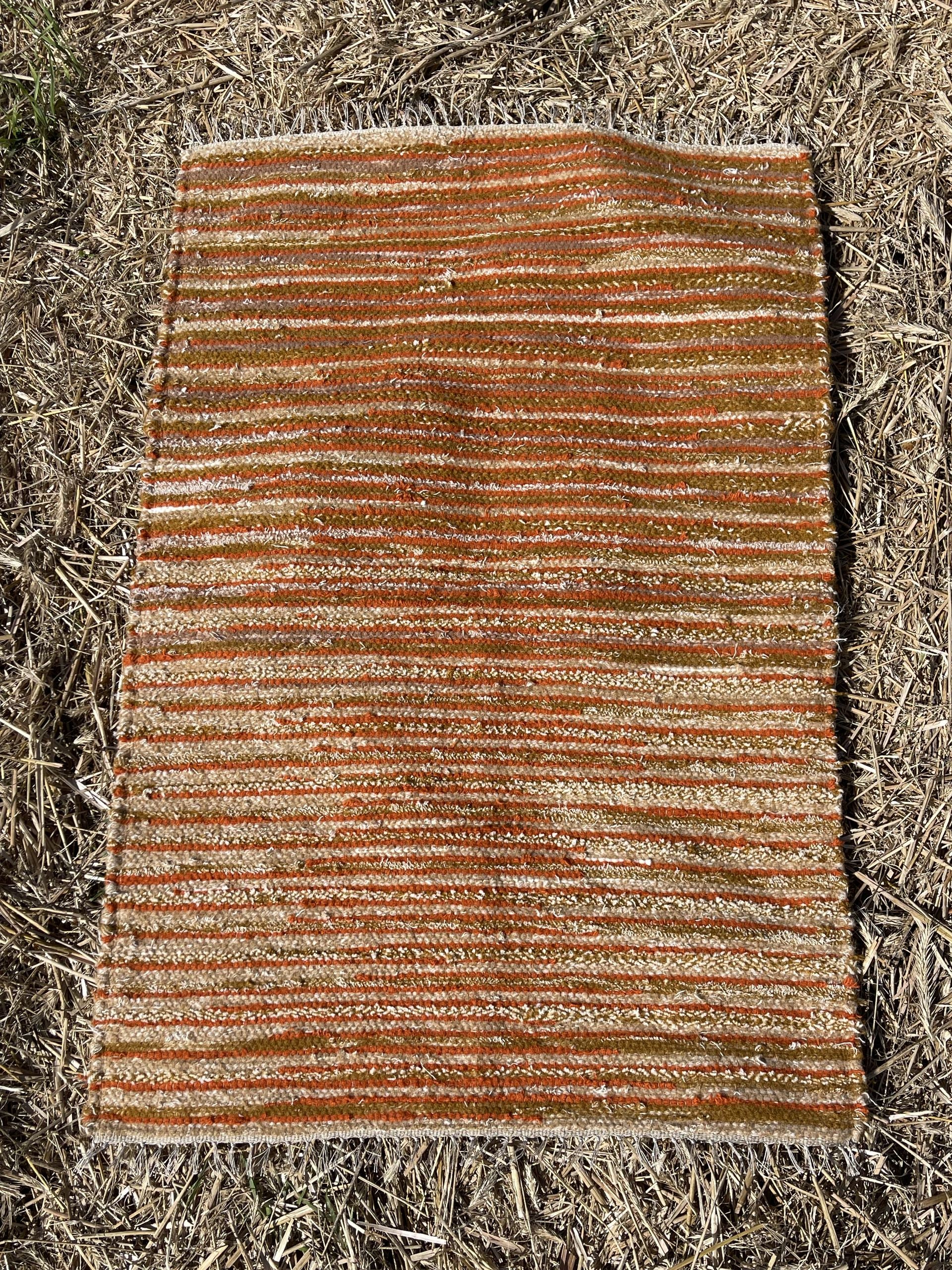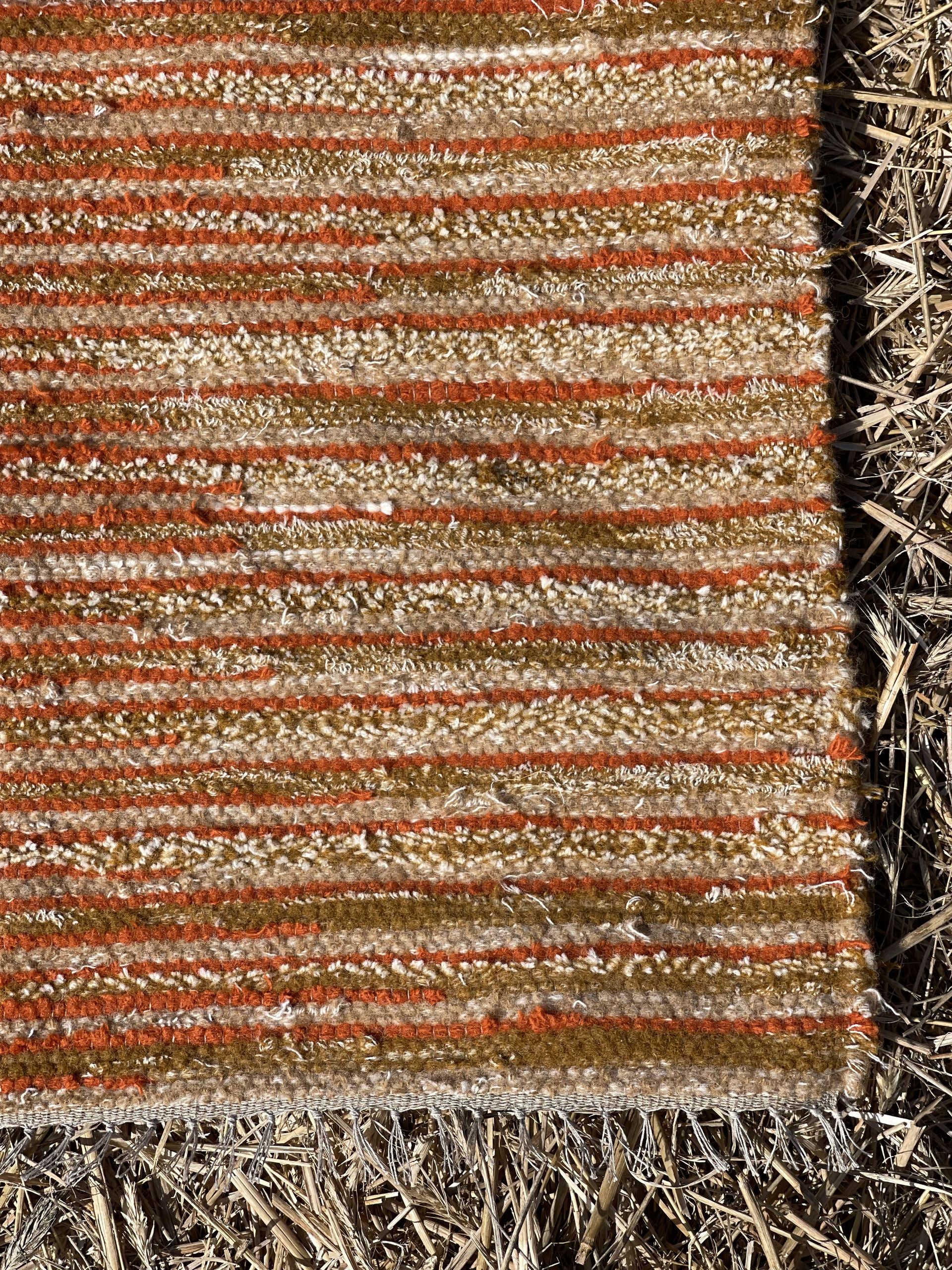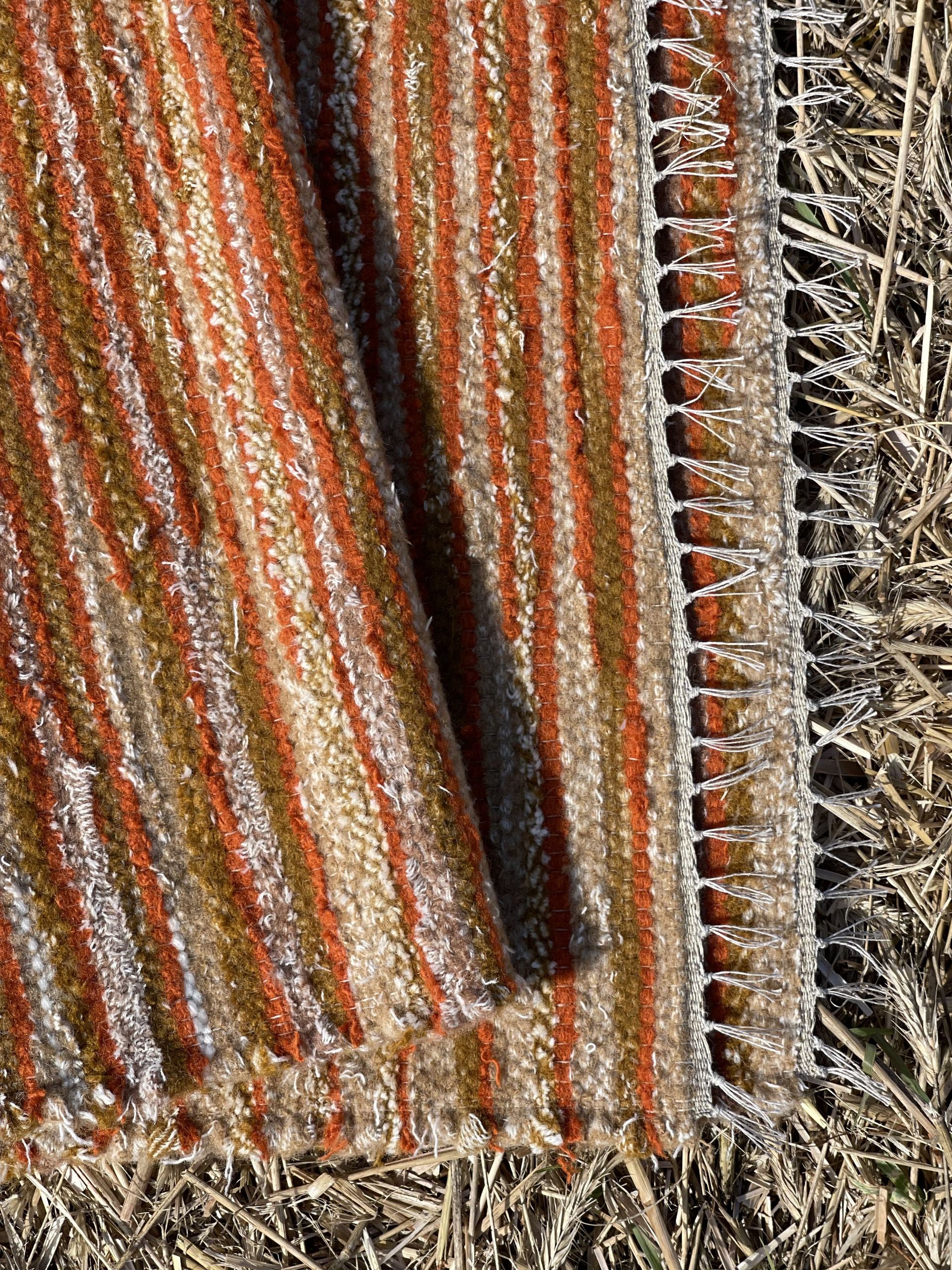Oranžas, bēšas, sinepju toņa svītriņas, vilnas auduma grīdceliņš ~70x100cm