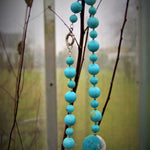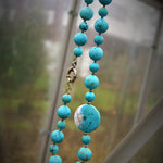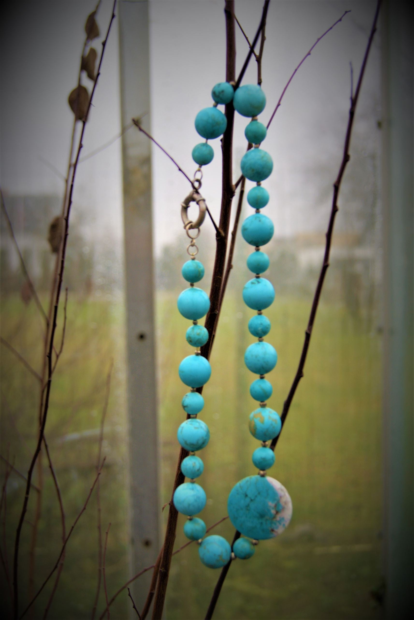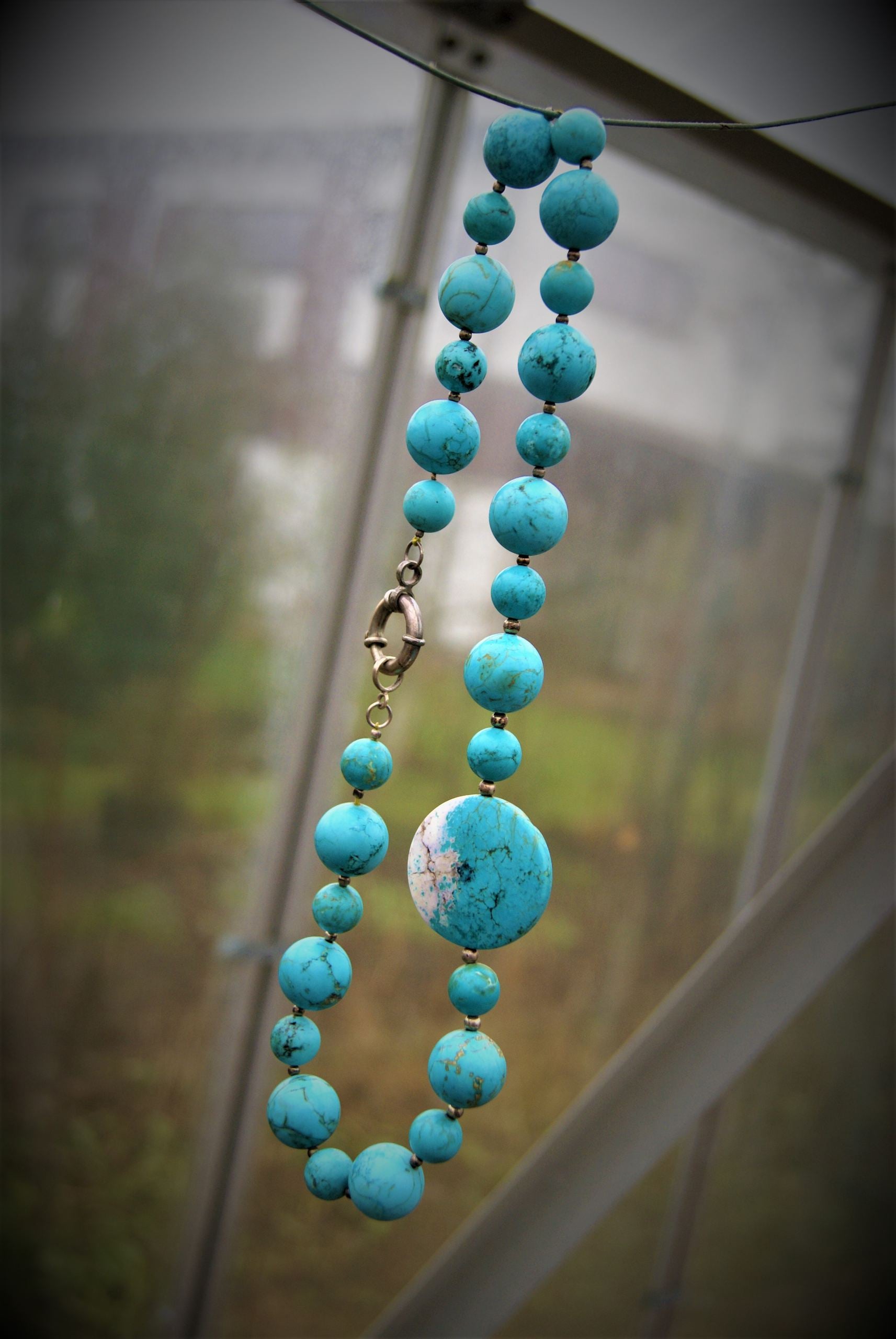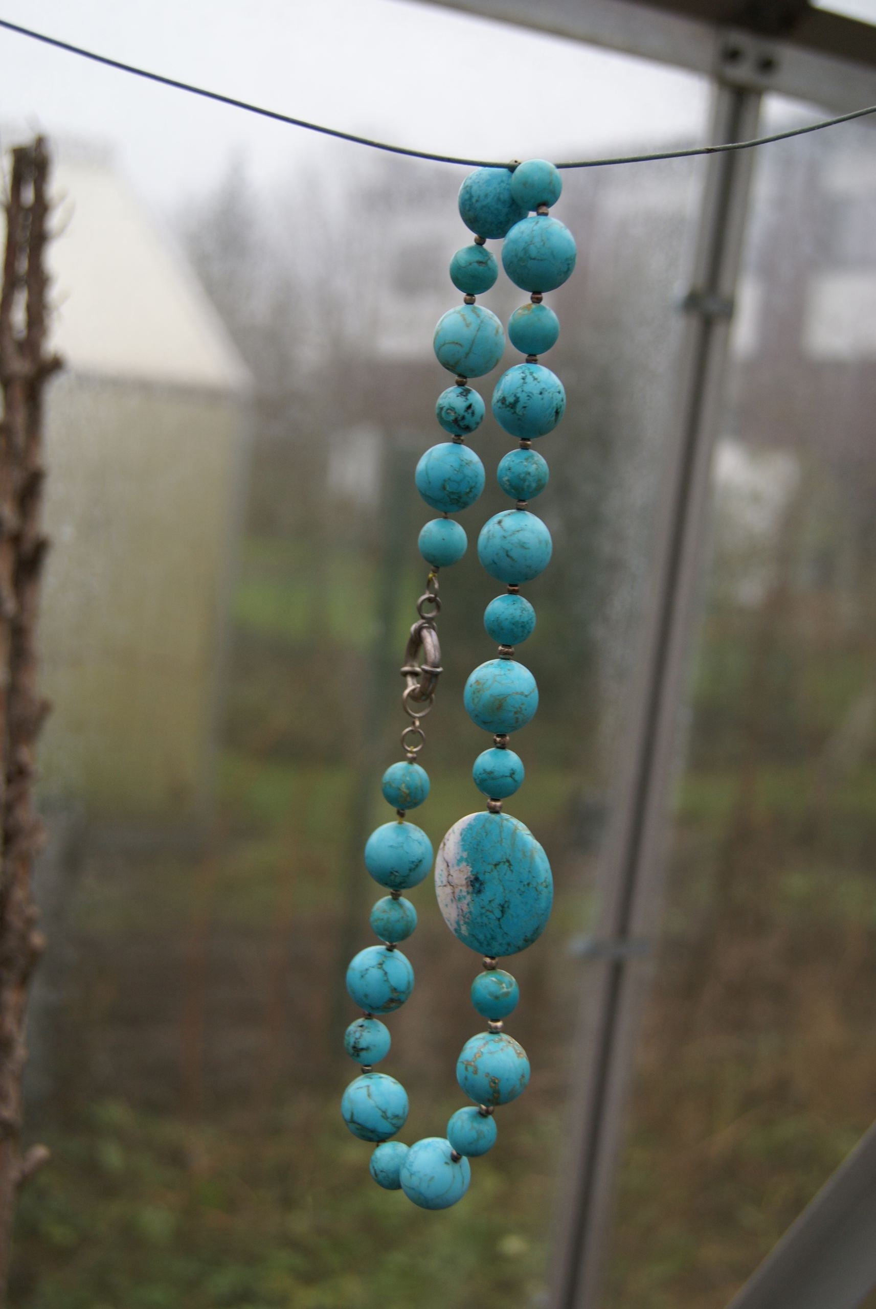 Kaklarota ar apaļas formas dabīgiem tirkīziem, kuri atdalīti ar mazām sudraba bumbiņām, uzvērti uz dubulta metāla diega un nostiprināta ar sudraba apaļas formas aizdari. Sudraba prove 925.