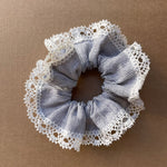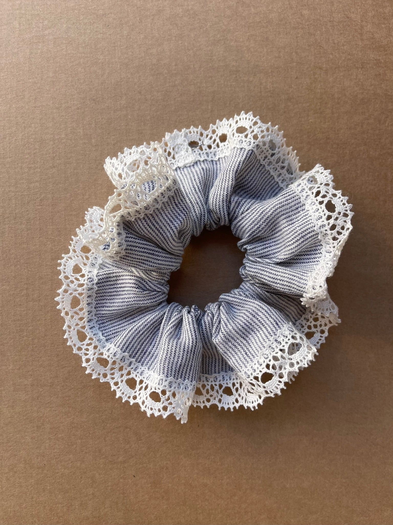 Lina auduma matu gumija - scrunchie - Zili svītraina ar baltu mežģīņu maliņu L (~5cm plata) (Copy)