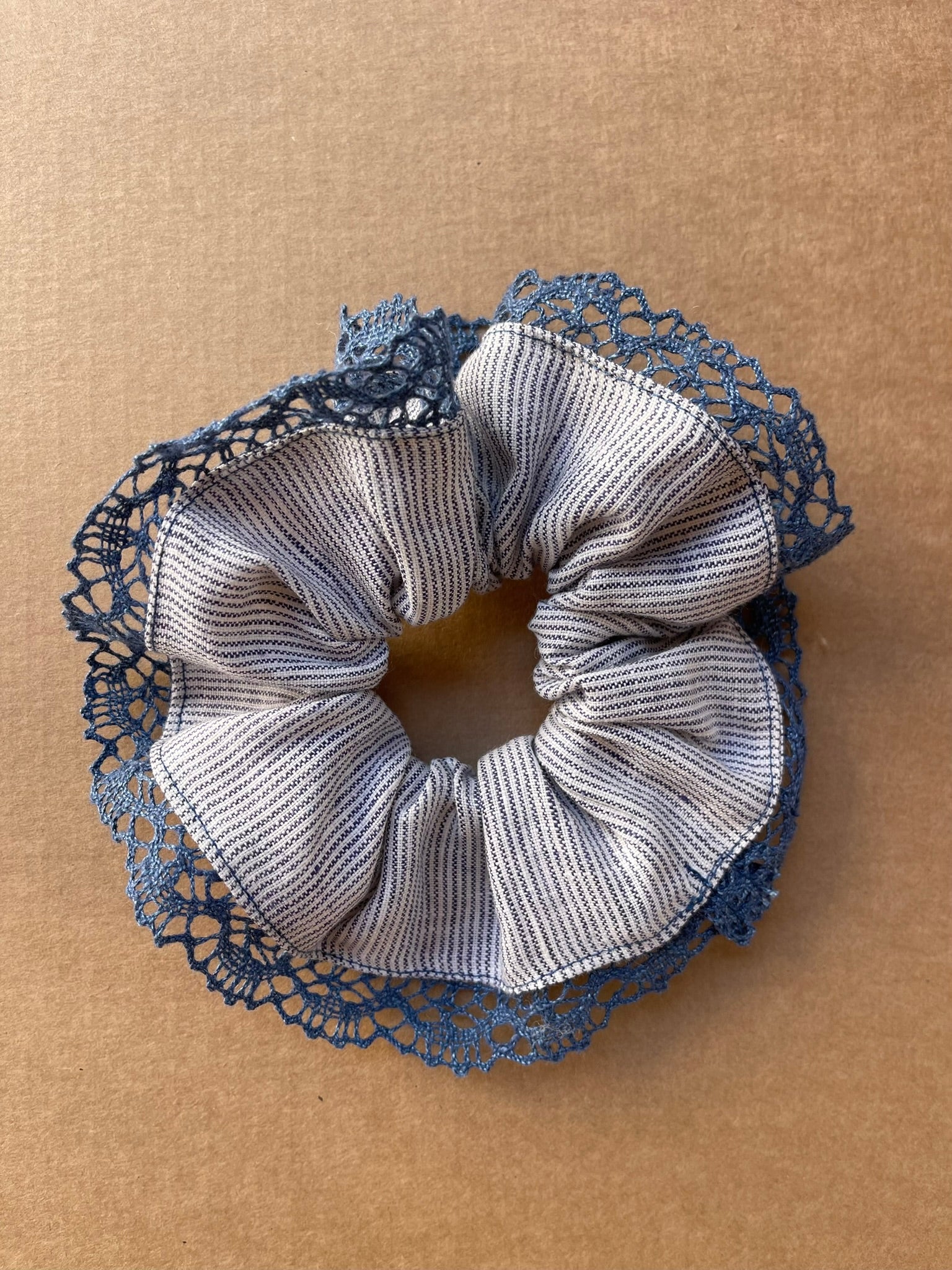 Lina auduma matu gumija - scrunchie - Zili svītraina ar zilu mežģīņu maliņu L (~5cm plata)