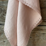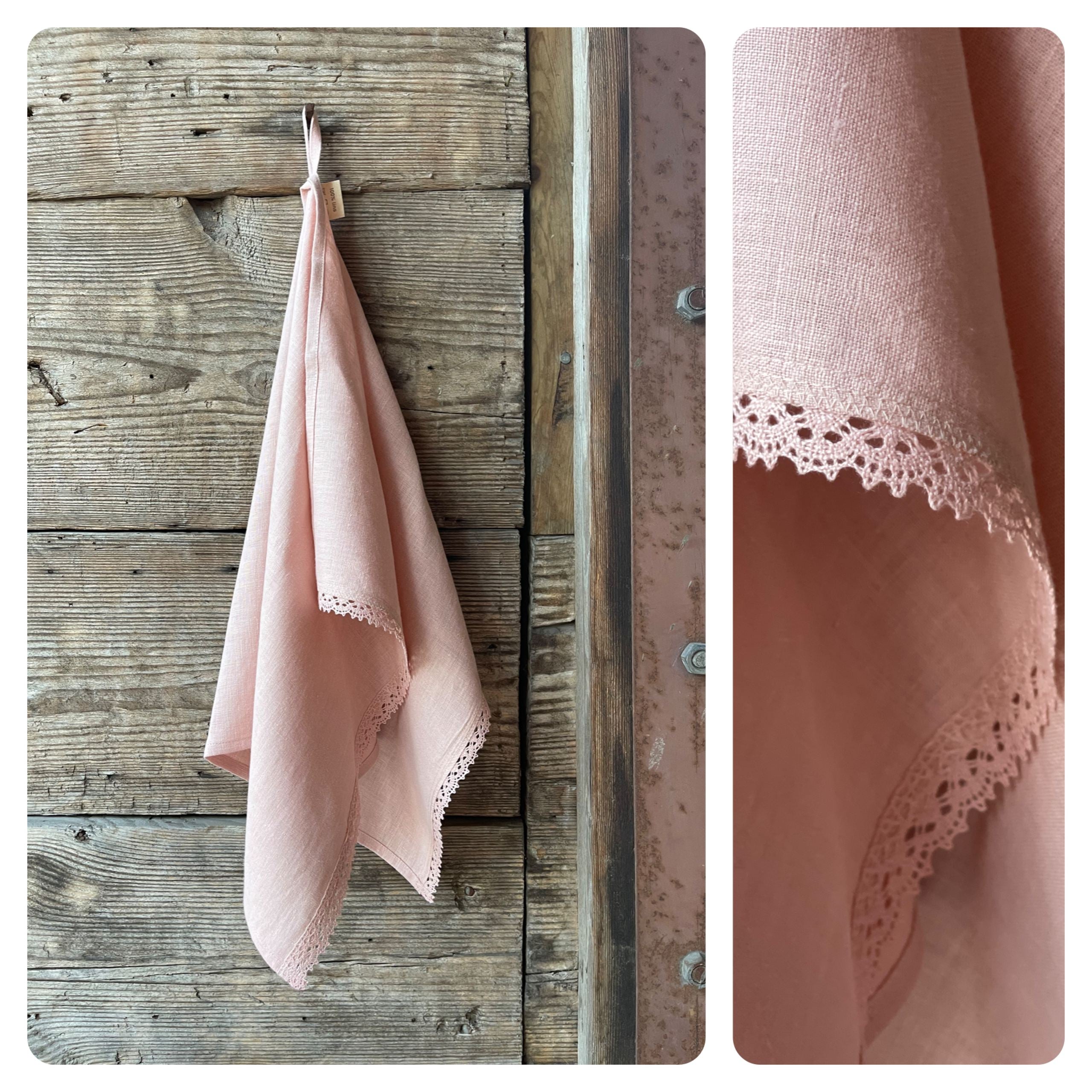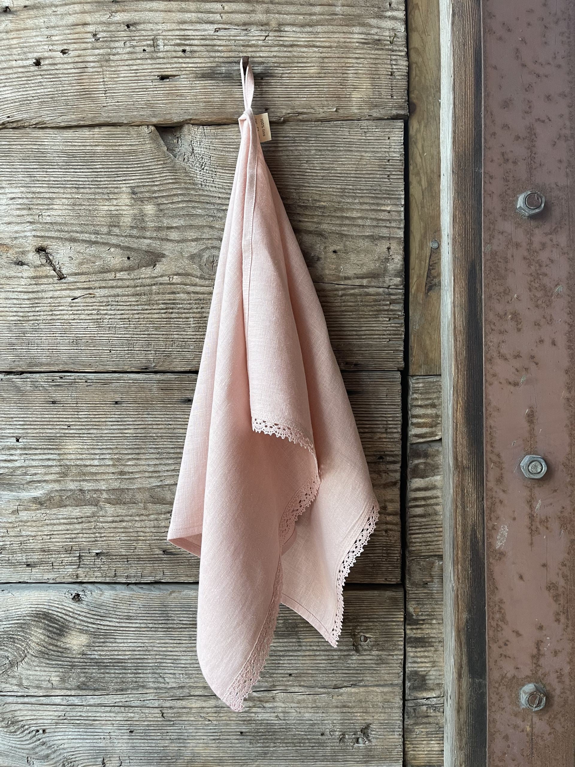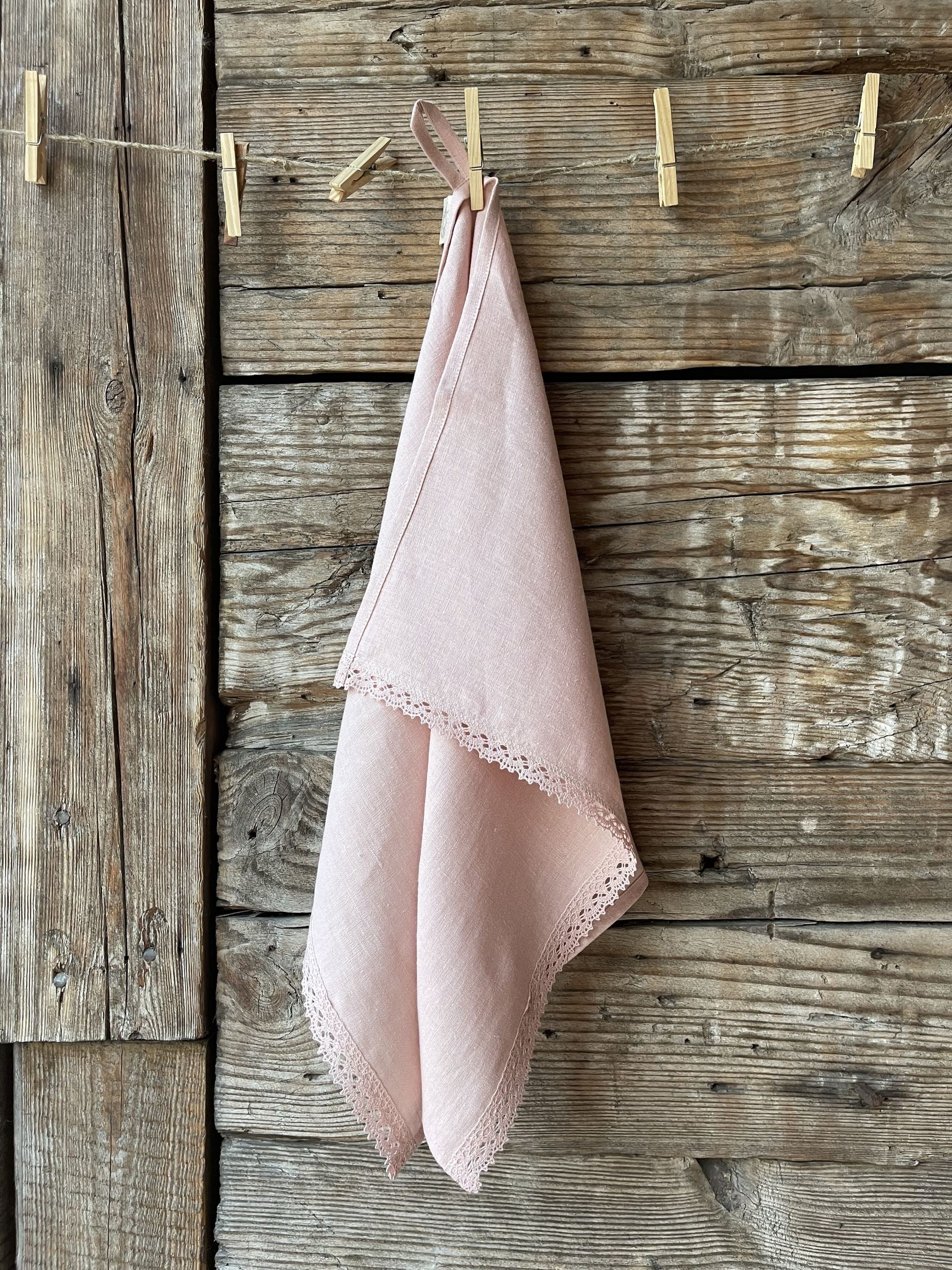 Maigi rozā mīkstināta lina dvielītis ar maigi rozā lina mežģīni - cakiņu