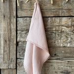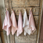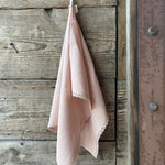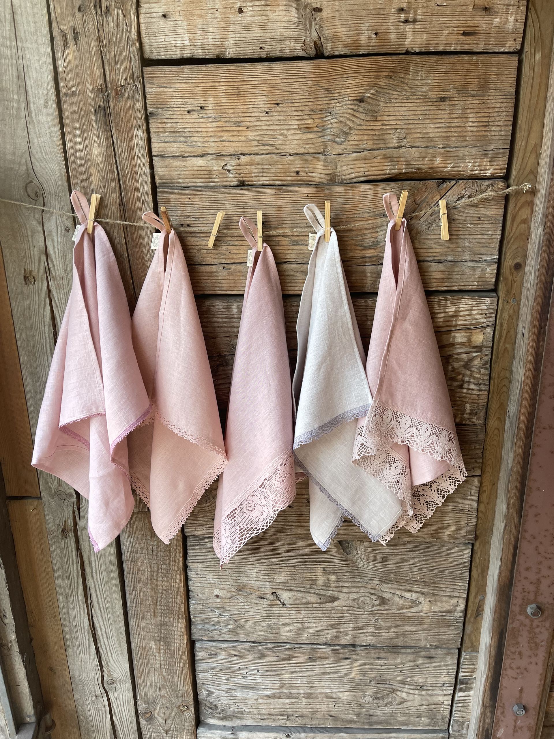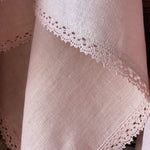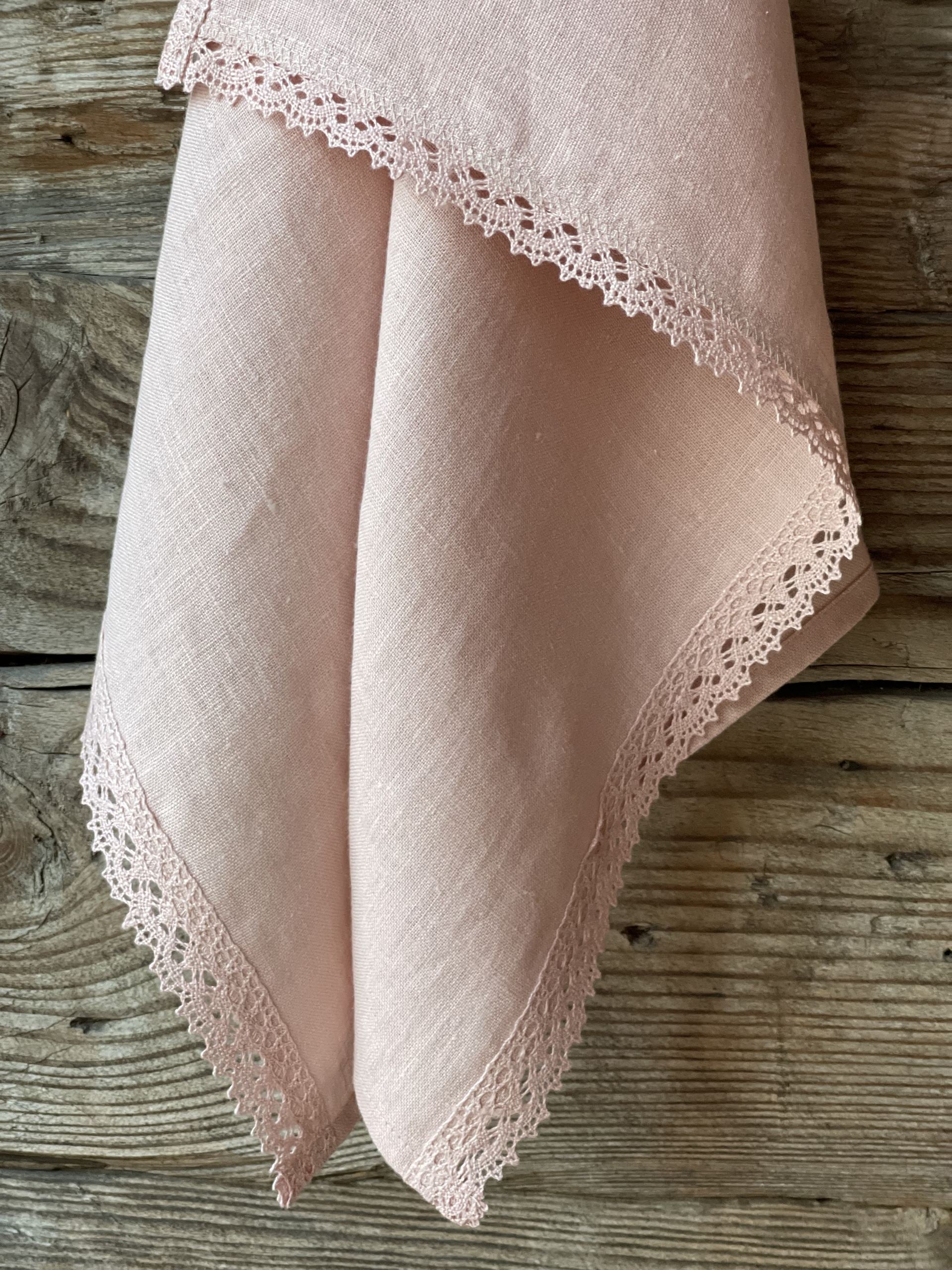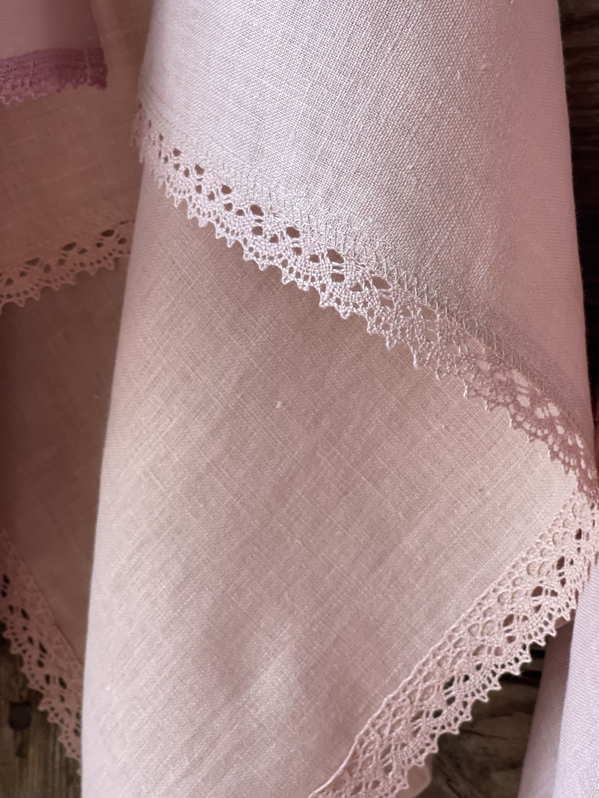 Maigi rozā mīkstināta lina dvielītis ar maigi rozā lina mežģīni - cakiņu