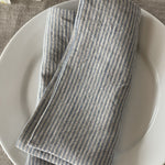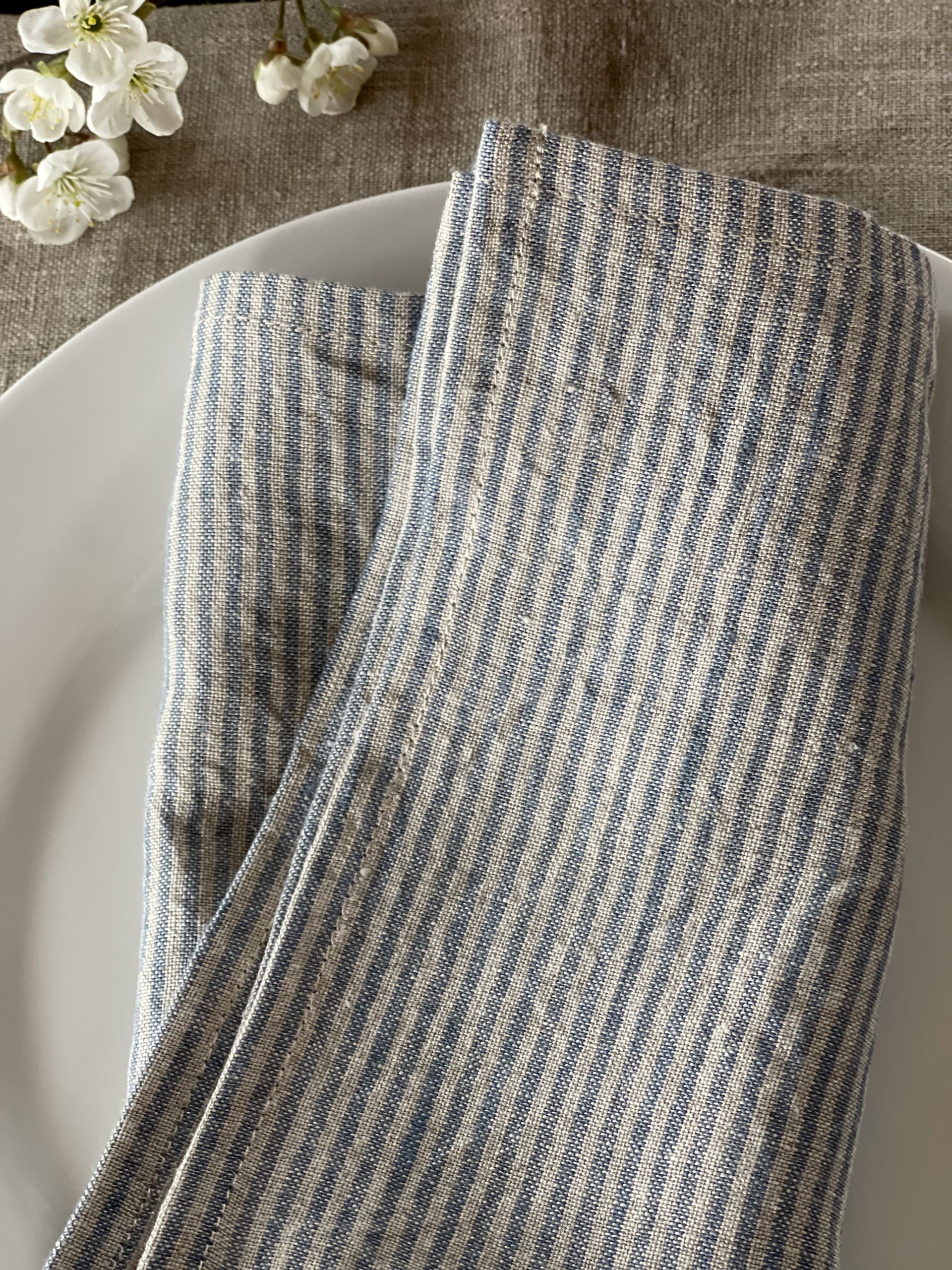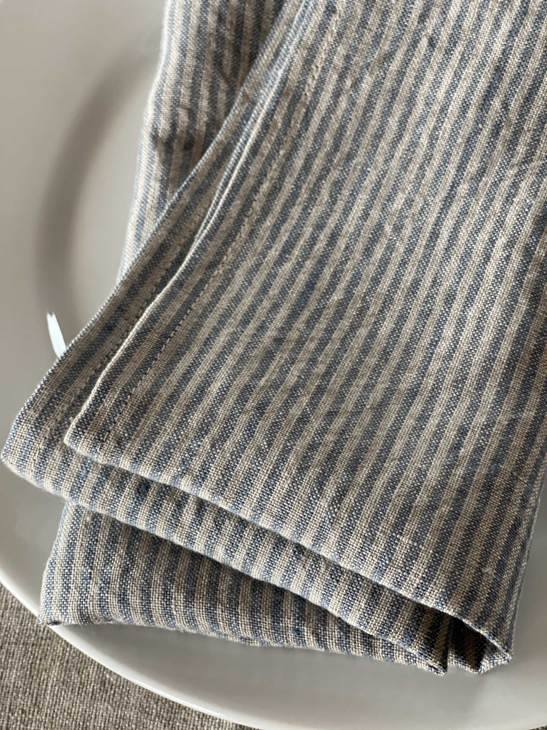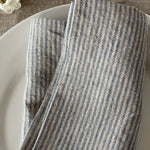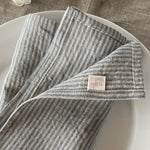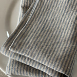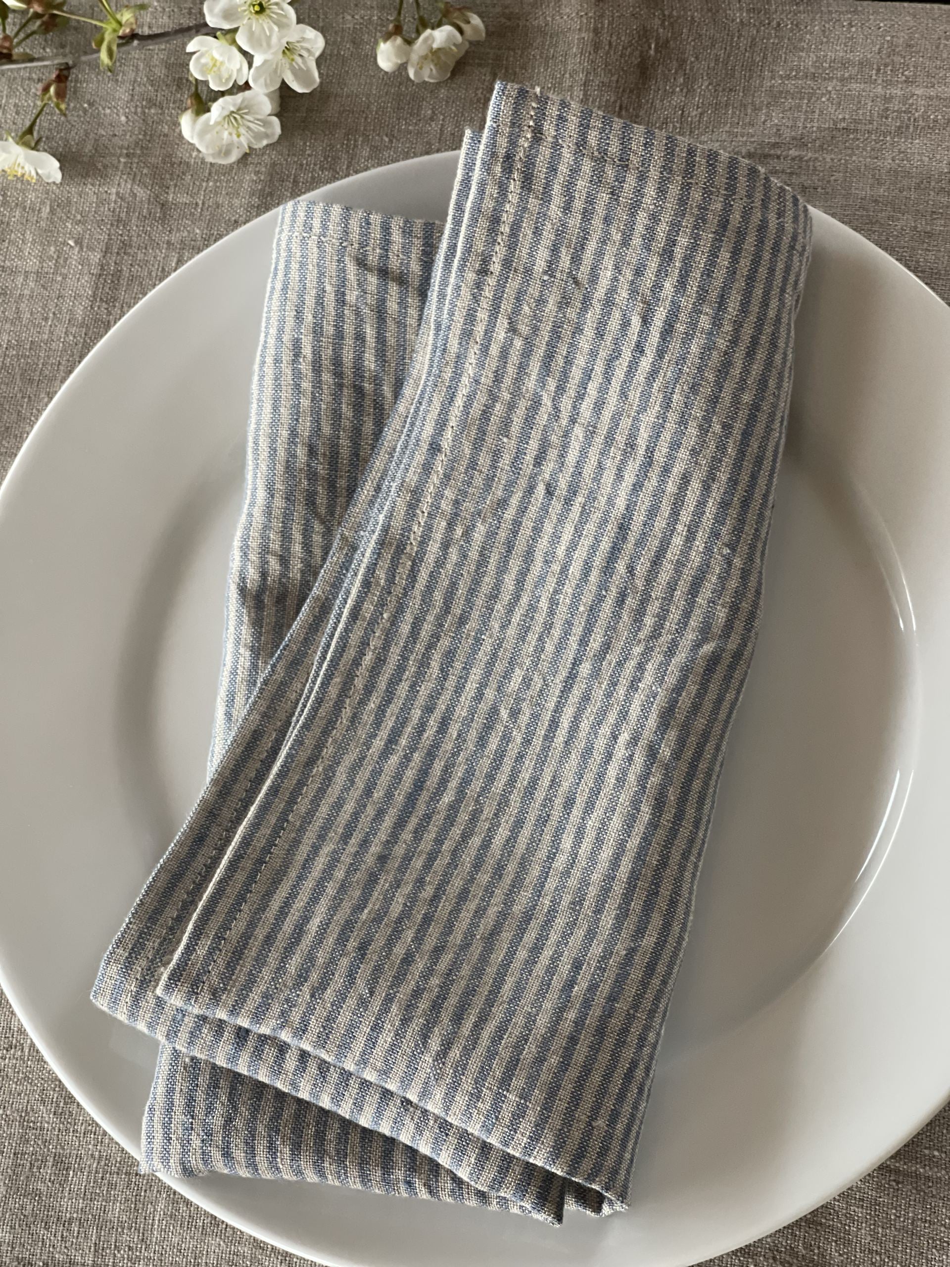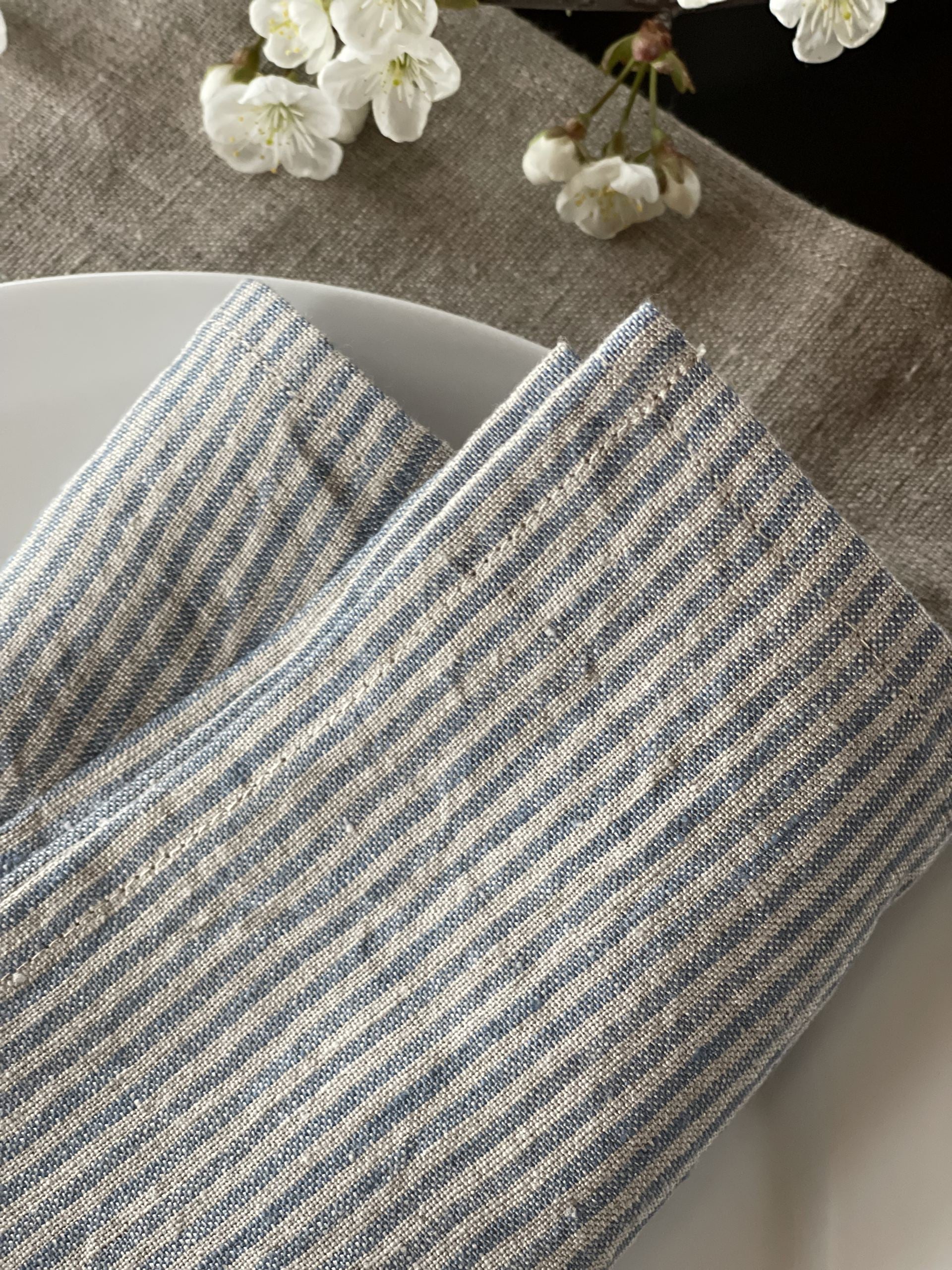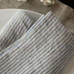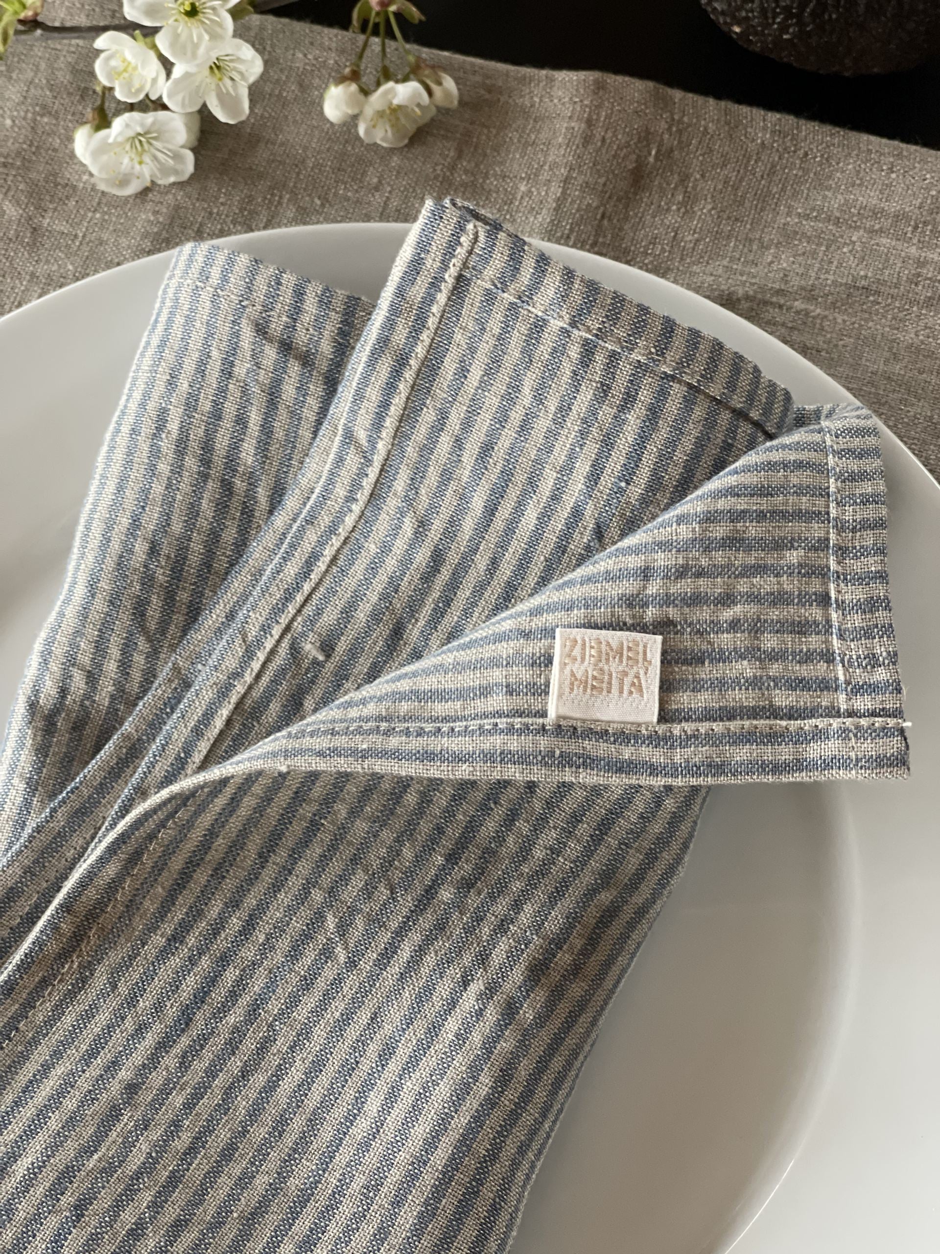 Mīkstināta vidēji plāna lina galda salvetes ar gaiši zilām/dabīgi pelēkām vidēji platām svītriņām un šaurām maliņām