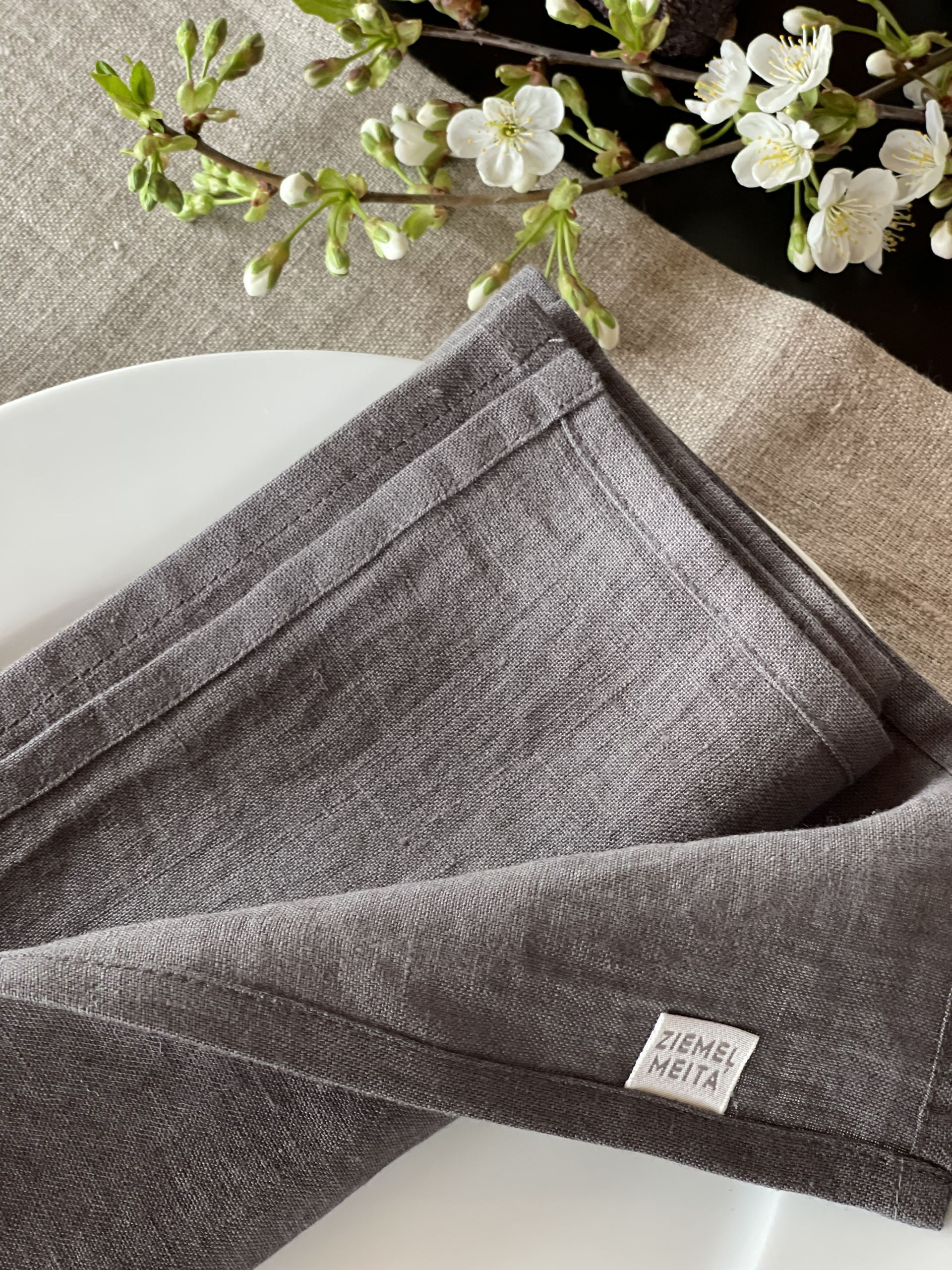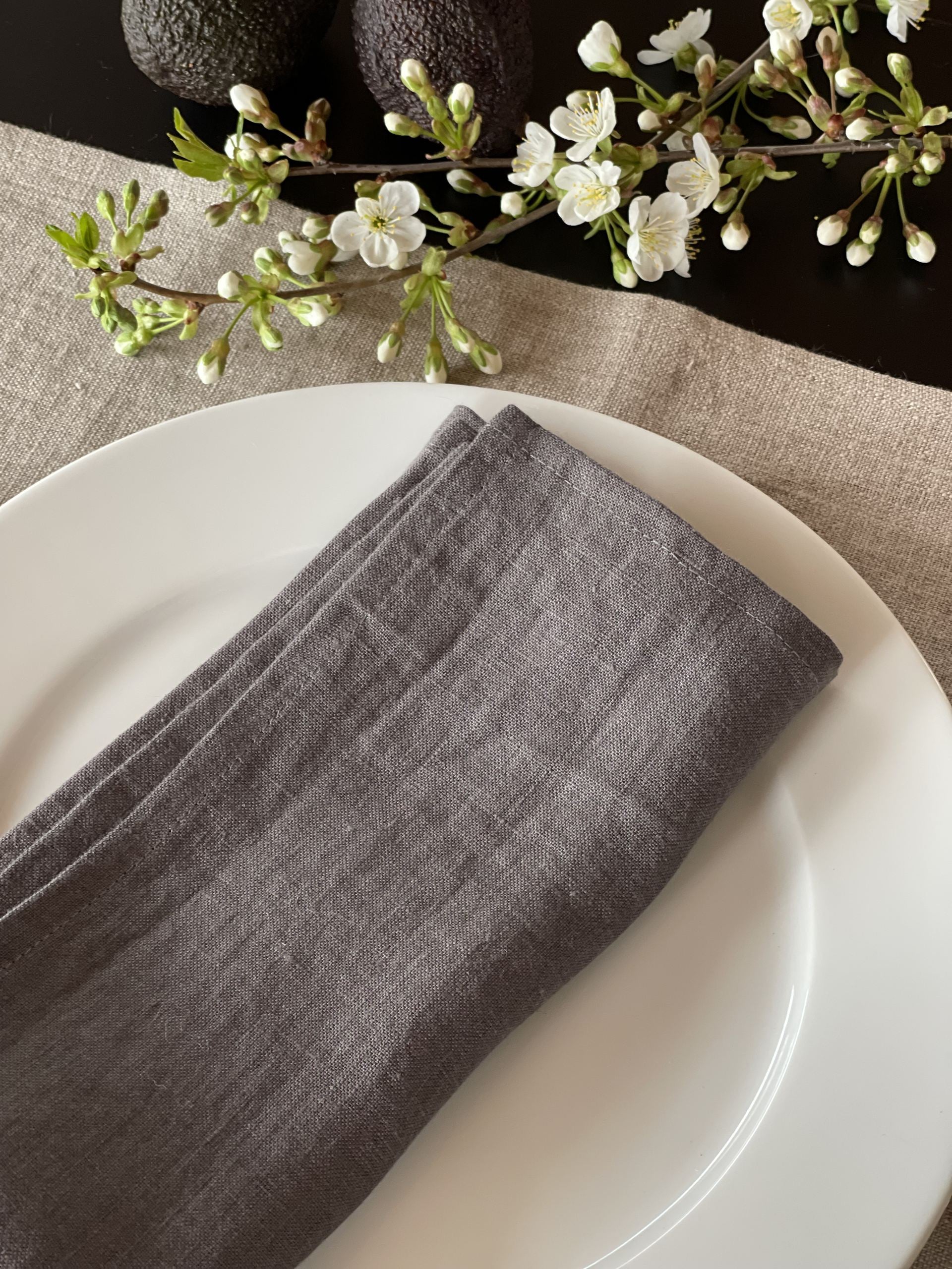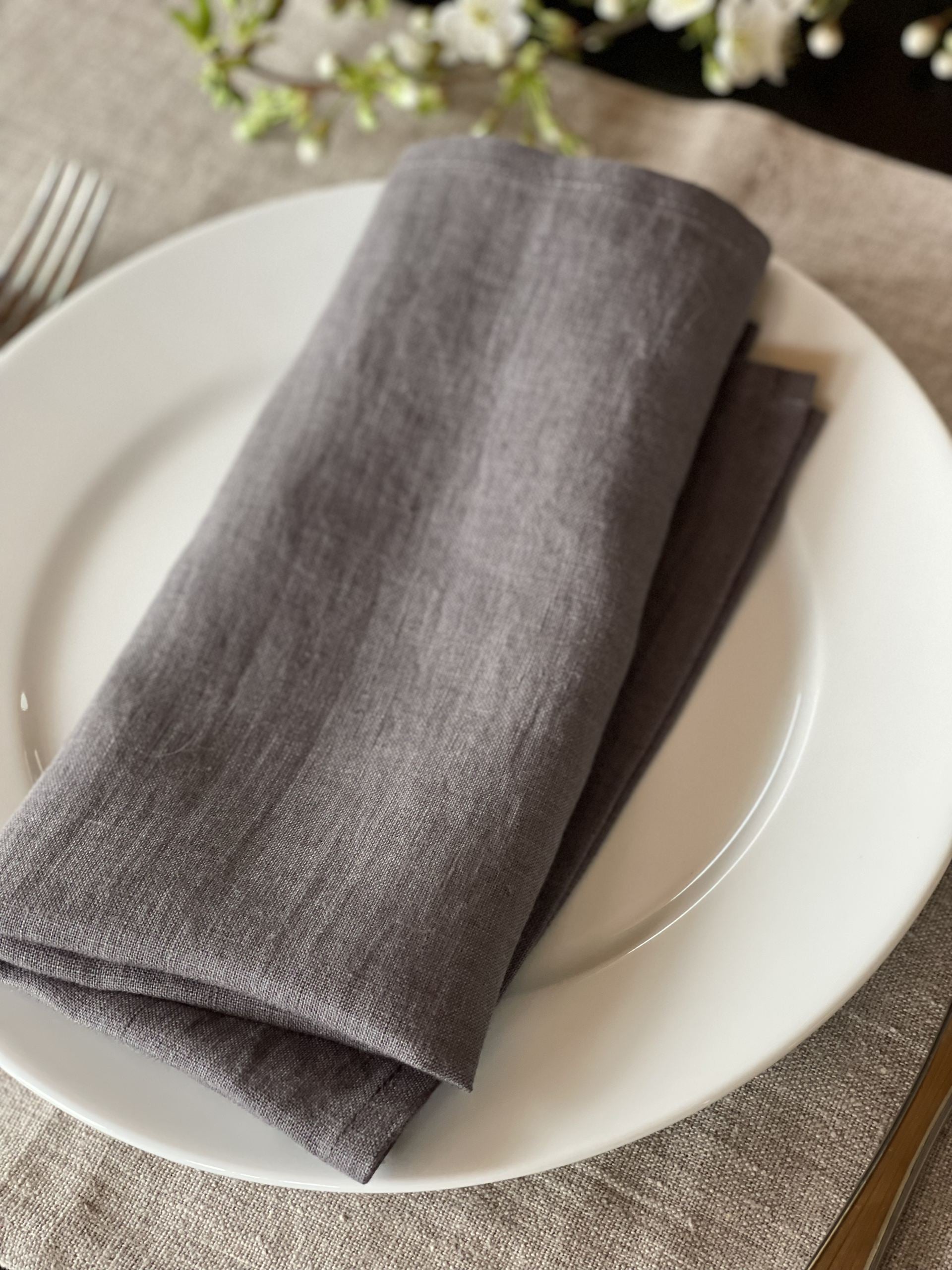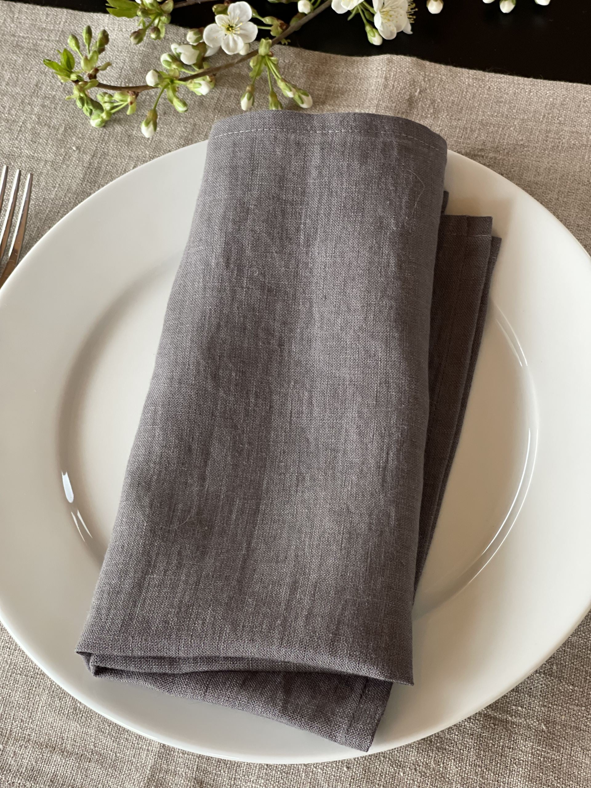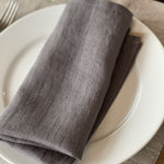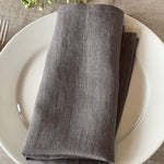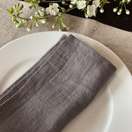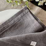 Mīkstināta vidēji plāna lina tumši pelēkas galda salvetes ar šaurām maliņām