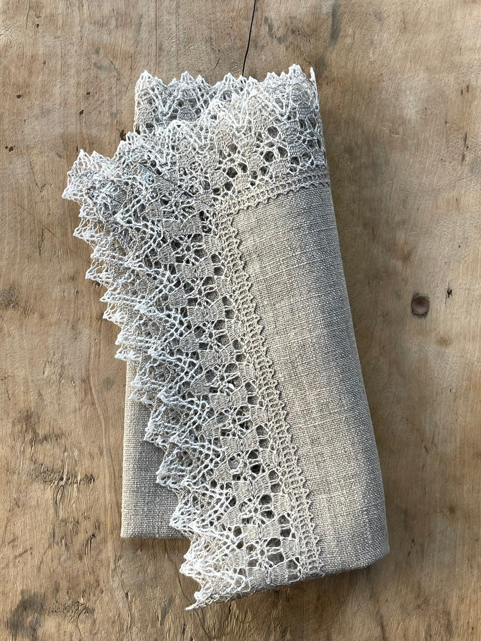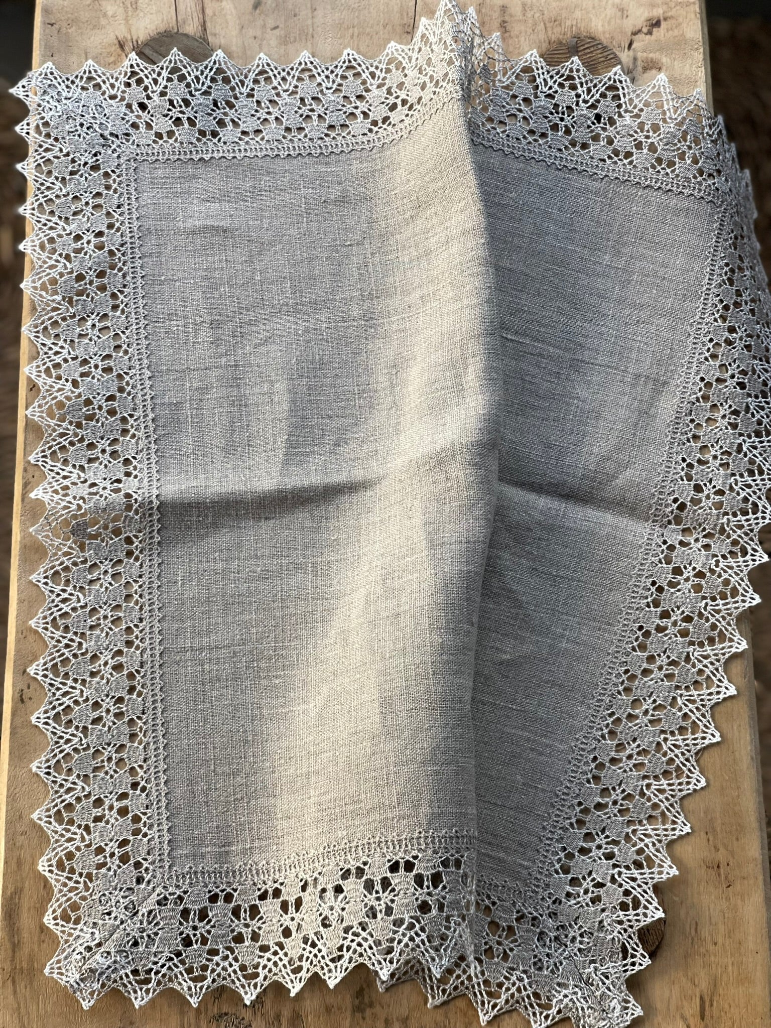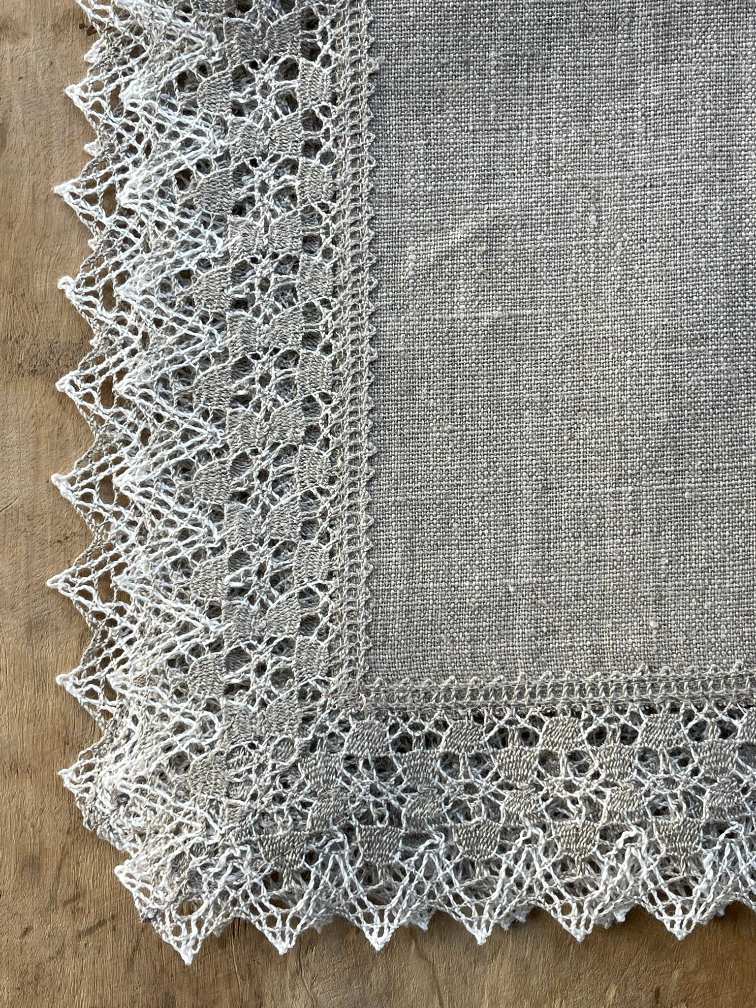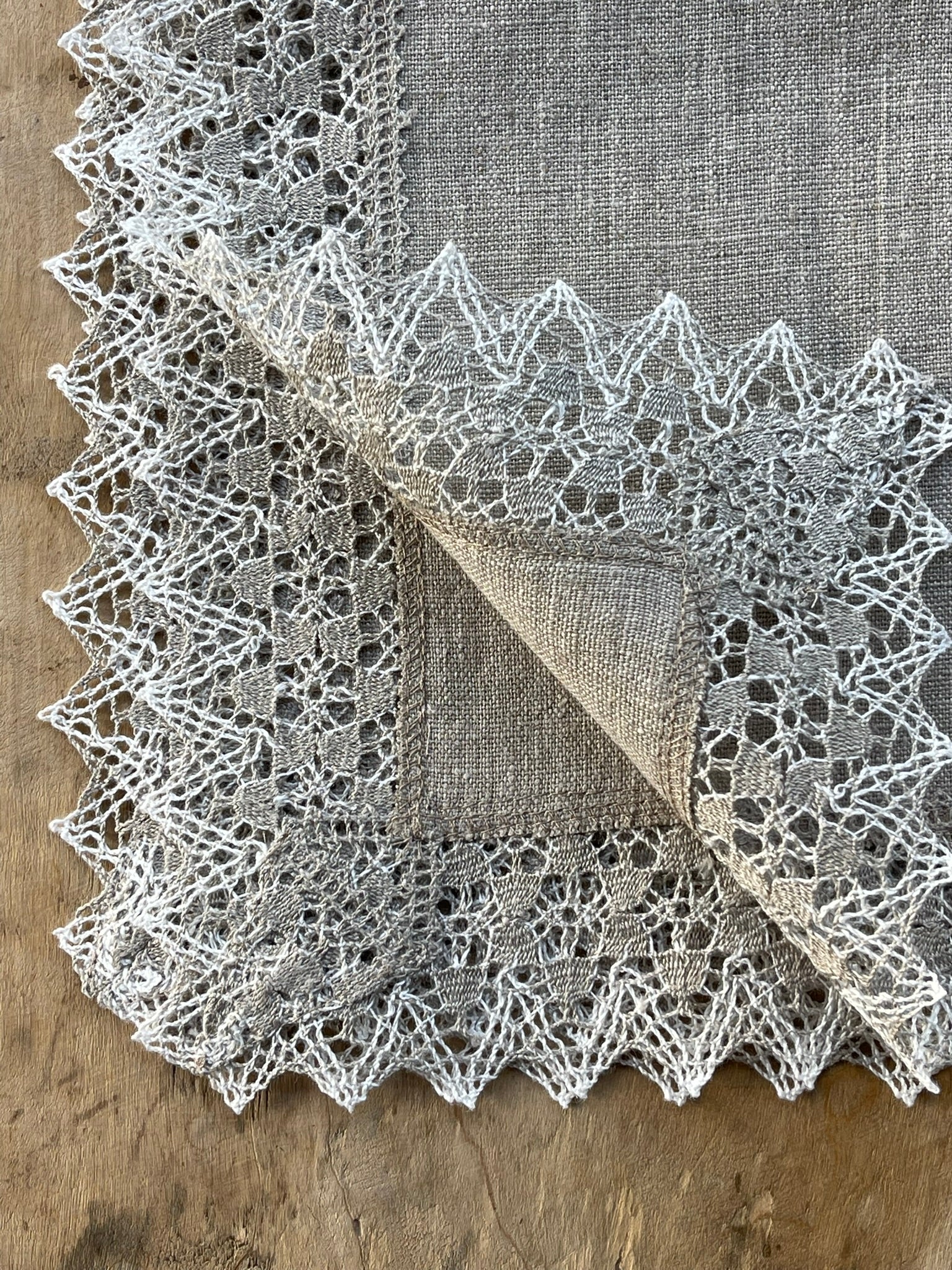 Nekrāsota, dabīgi pelēka toņa mīkstināta lina galda salvete ar divkrāsainu lina mežģīni ar ziedu rakstu