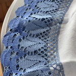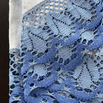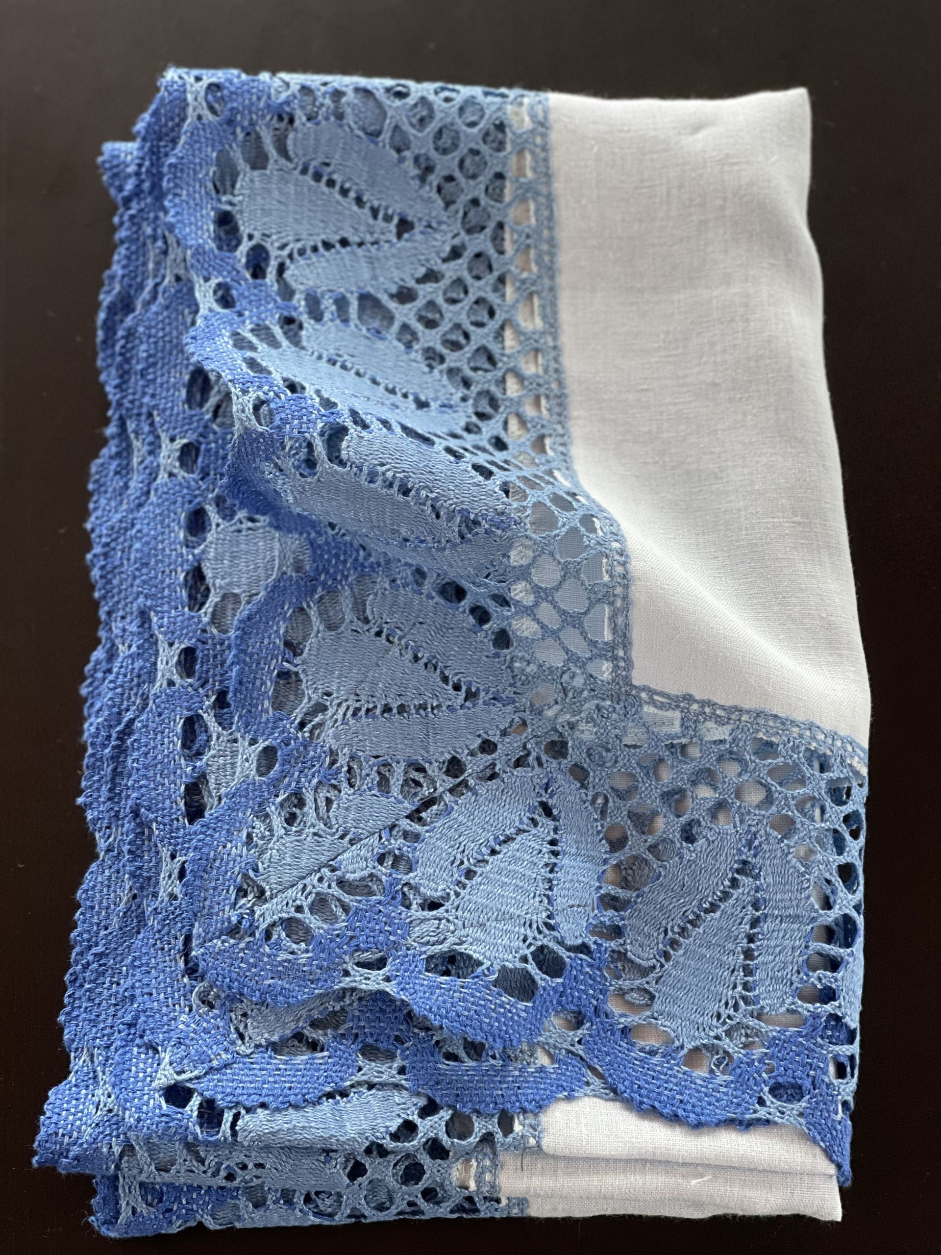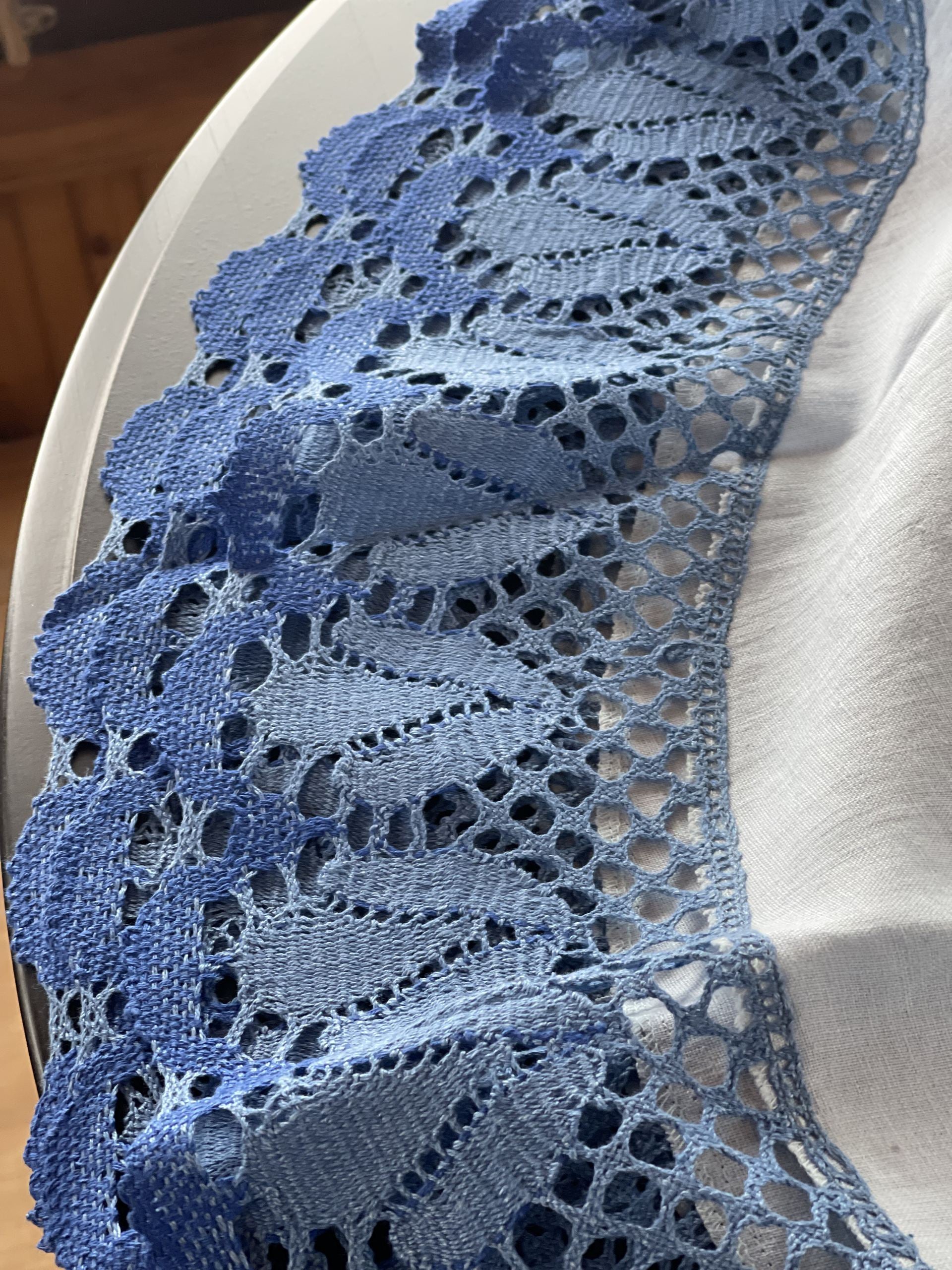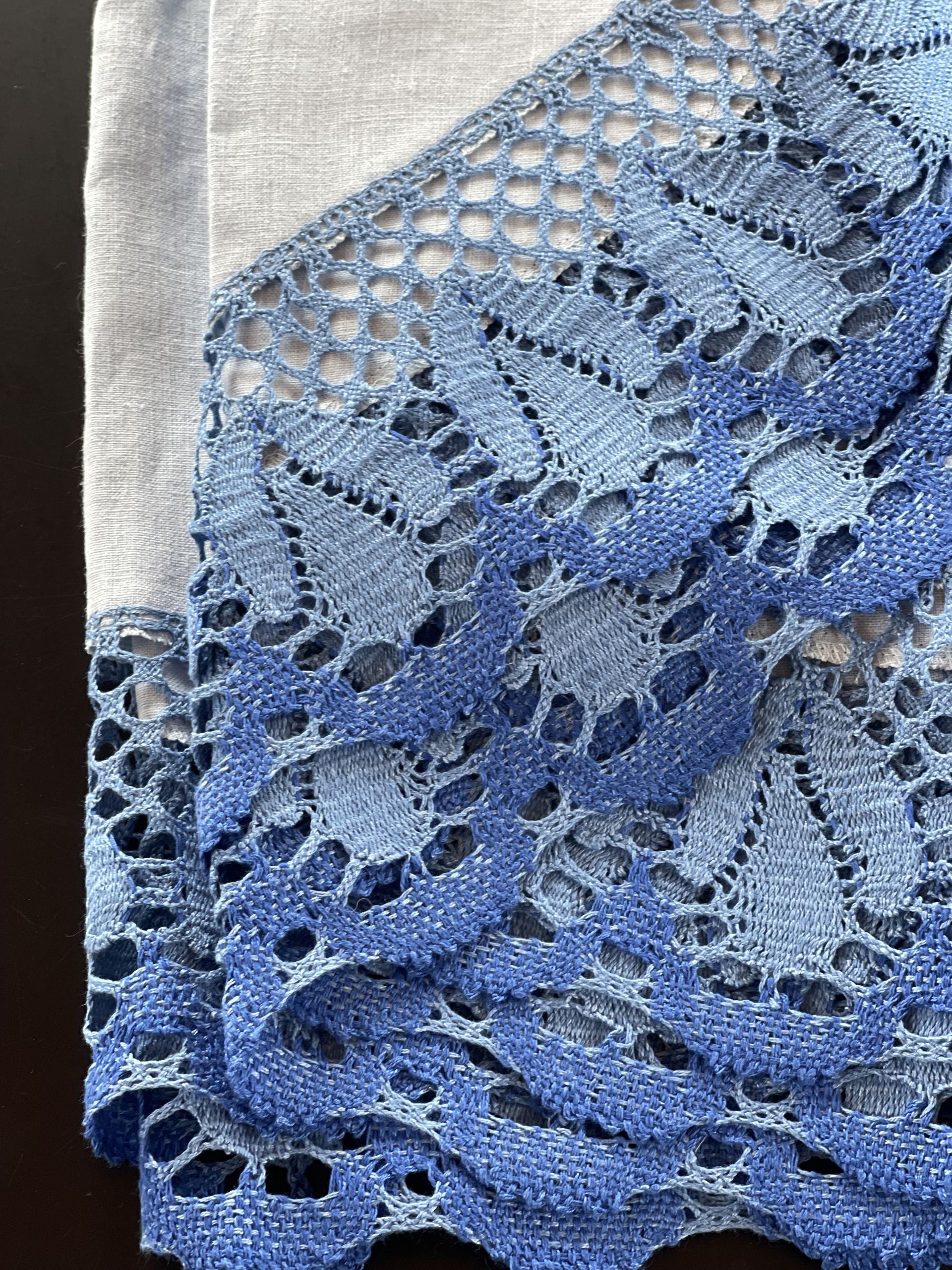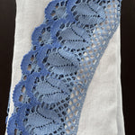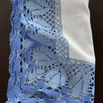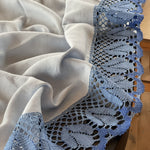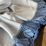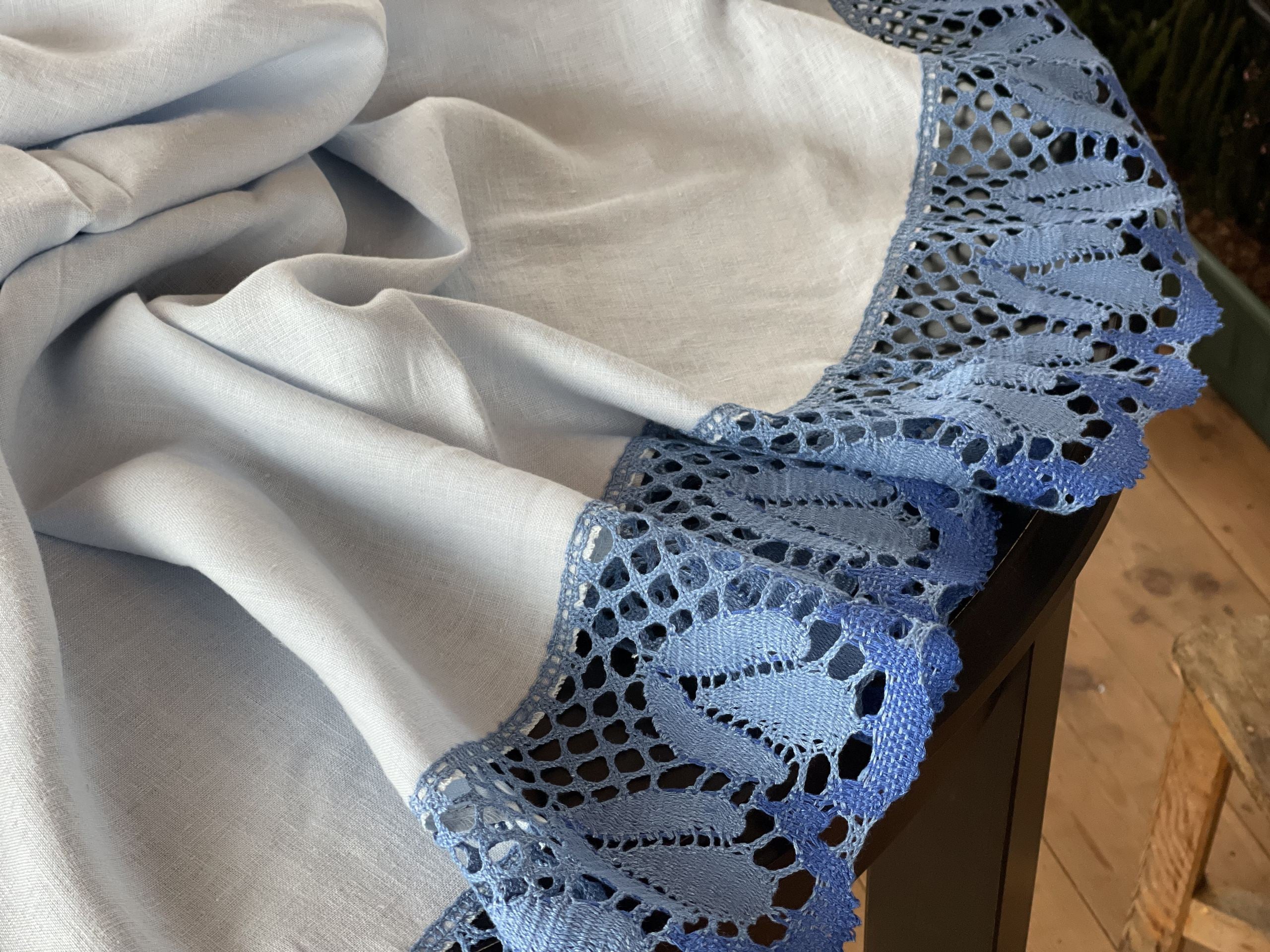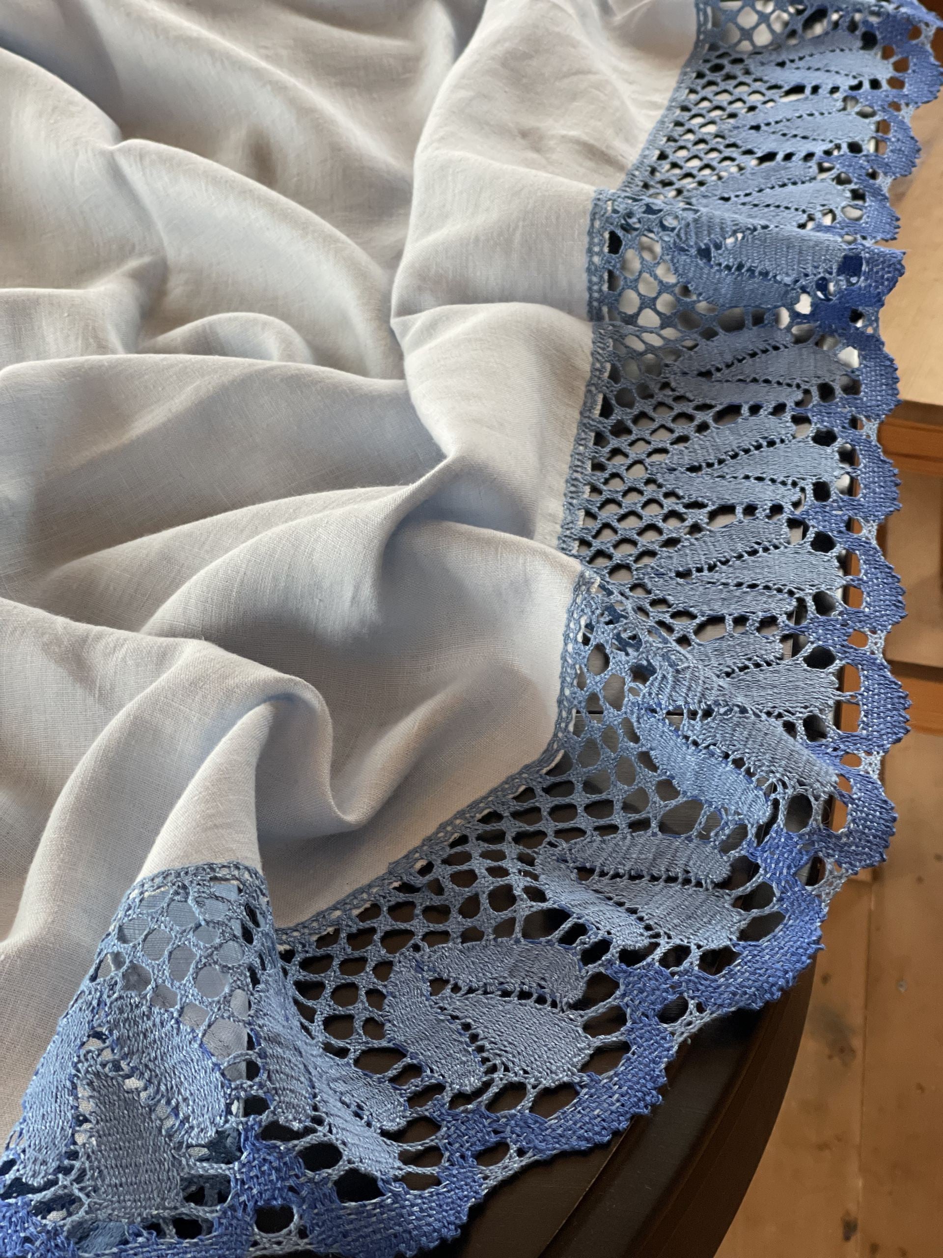 Gaiši zils lina galdauts ar 12cm platu zilu lina mežģīni ar tulpīšu ornamentu