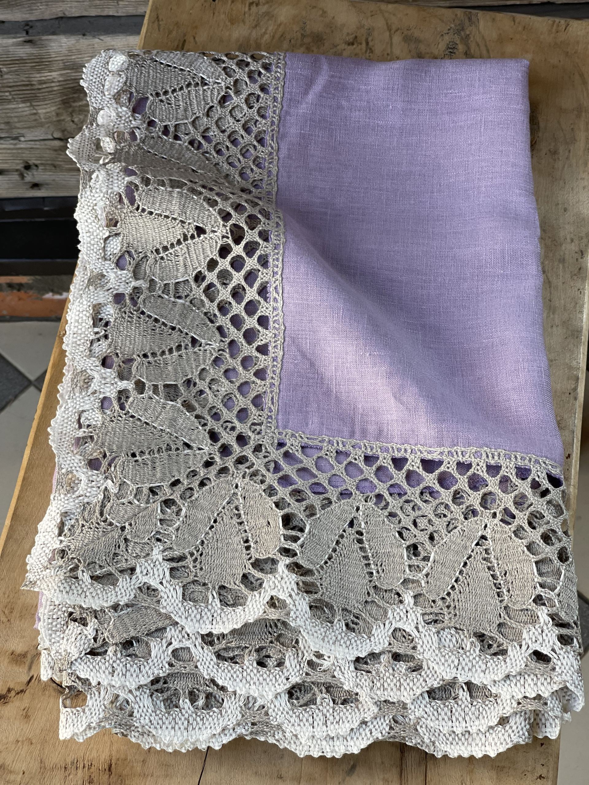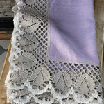Lavandu violets lina galdauts ar 12cm platu dabīgi pelēku/balta lina mežģīni ar tulpīšu ornamentu