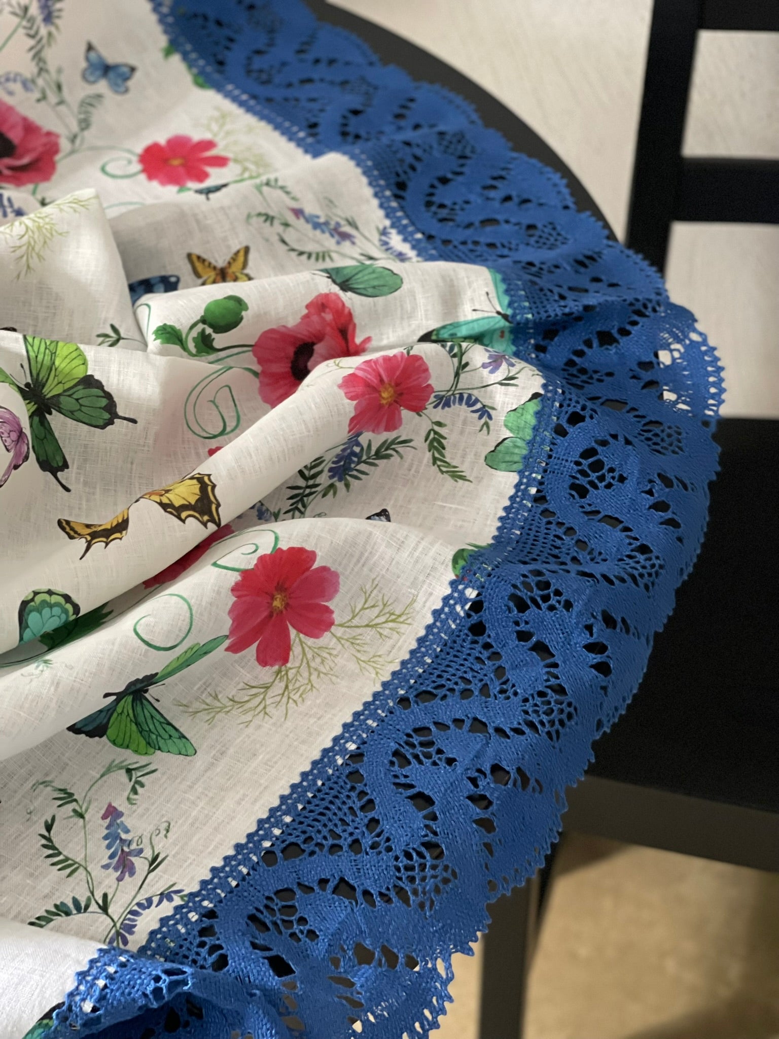 Magones, vanagzirņi, kosmejas un tauriņi- lina galdauts ar 12cm platu rudzupuķu zilu lina mežģīni