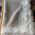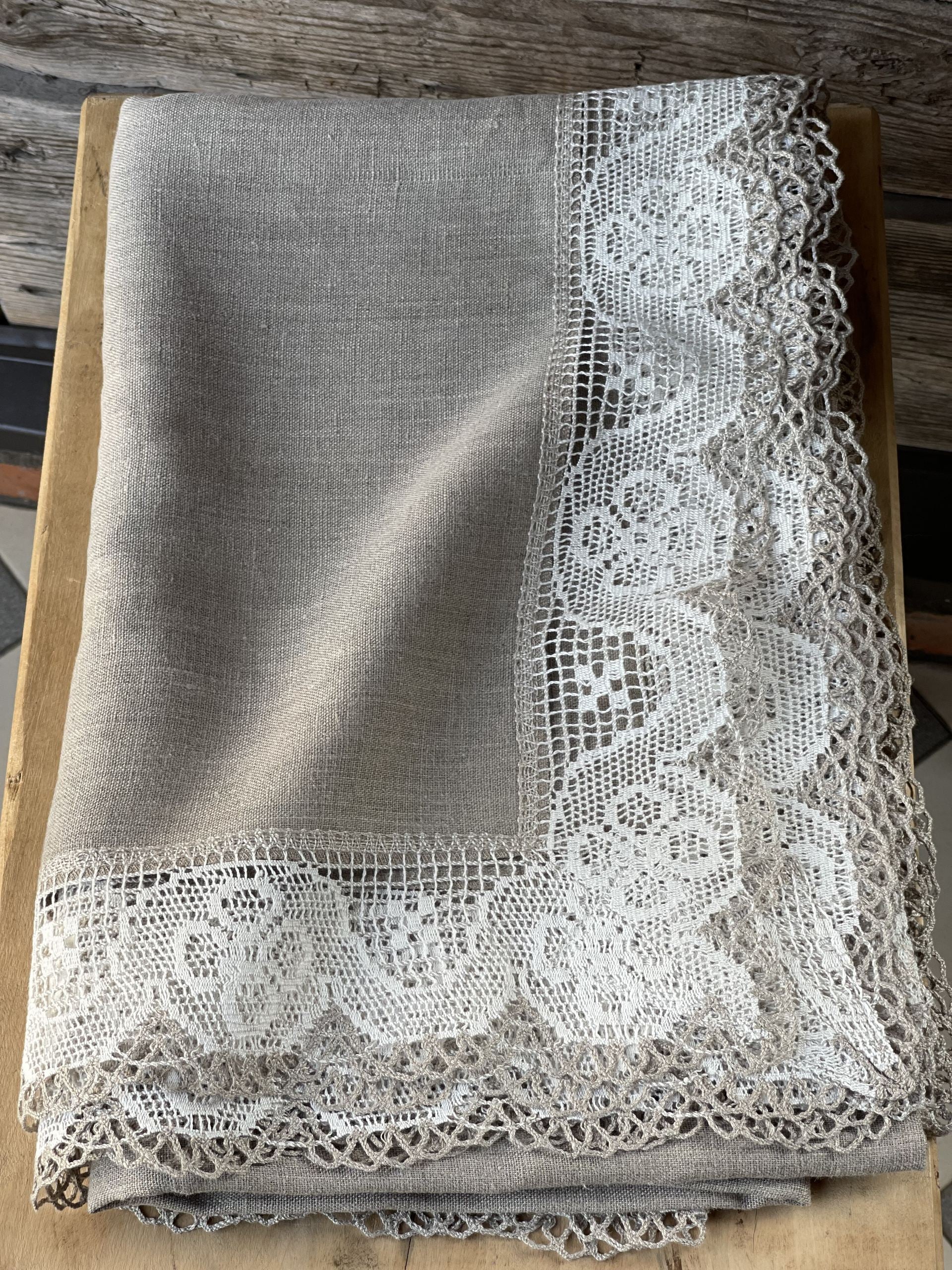 Nekrāsota, dabīgi pelēka toņa lina galdauts ar ~6cm platu balti-pelēku lina mežģīni ar ziedu rakstu