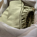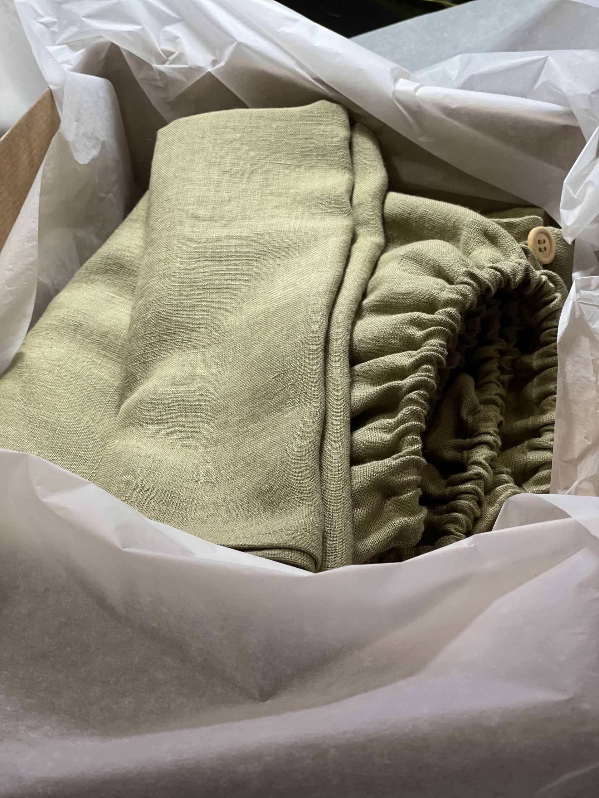 Olīvzaļa toņa mīkstināta lina palags ar gumiju