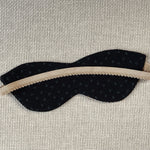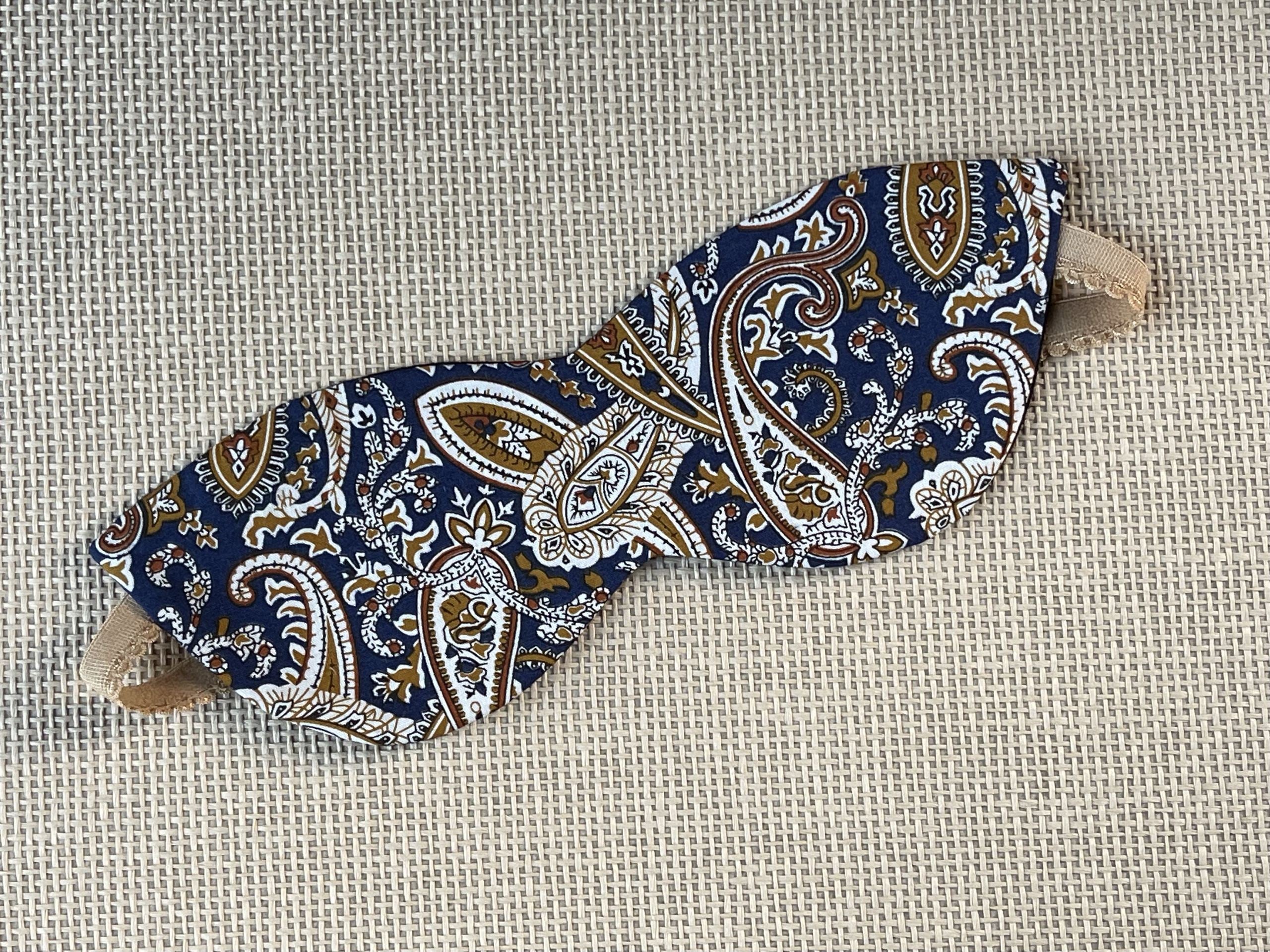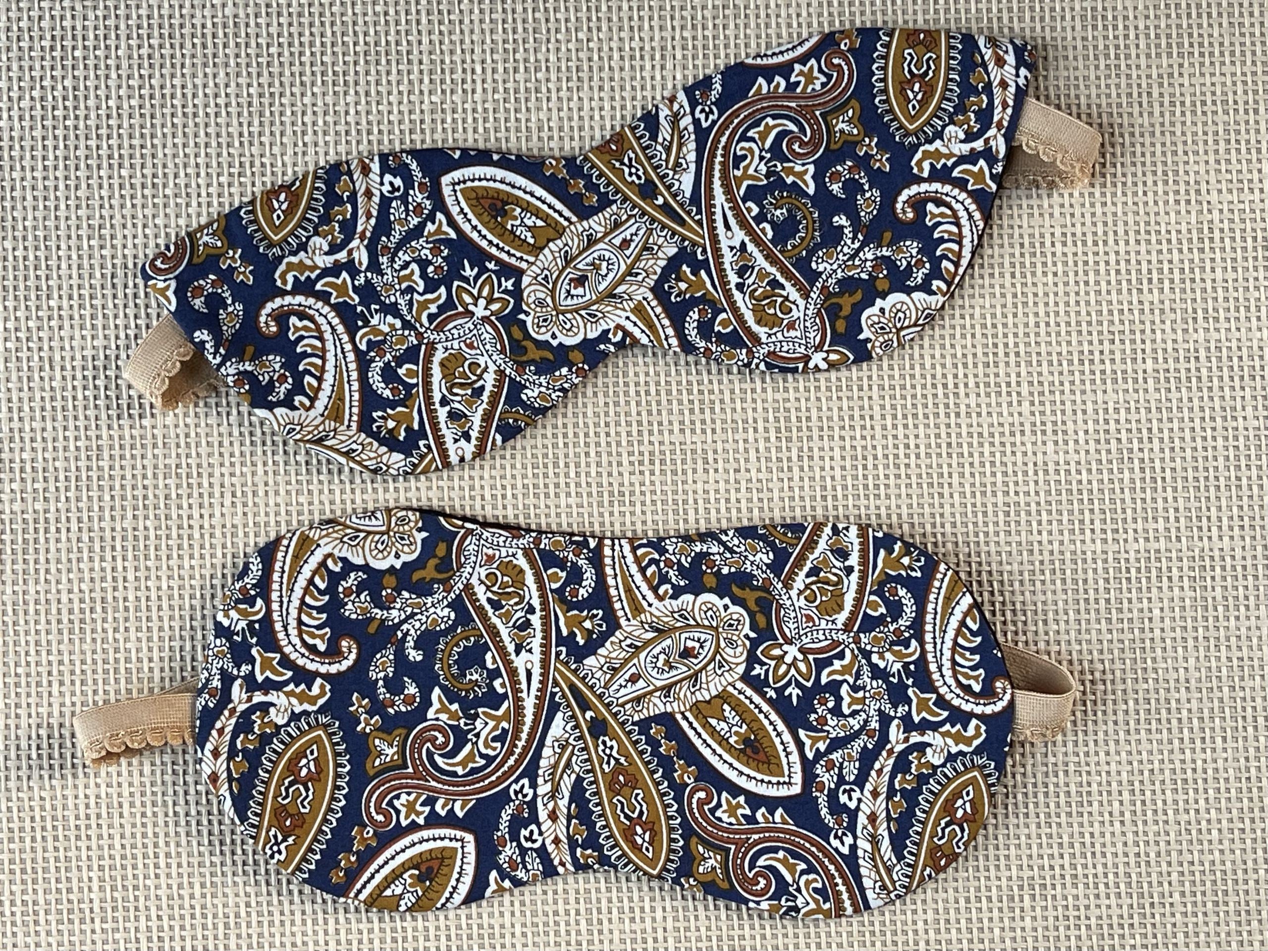 Tumši zila kaķa acu formas miega maska gulēšanai ar karameļu brūnu nierīšu rakstu