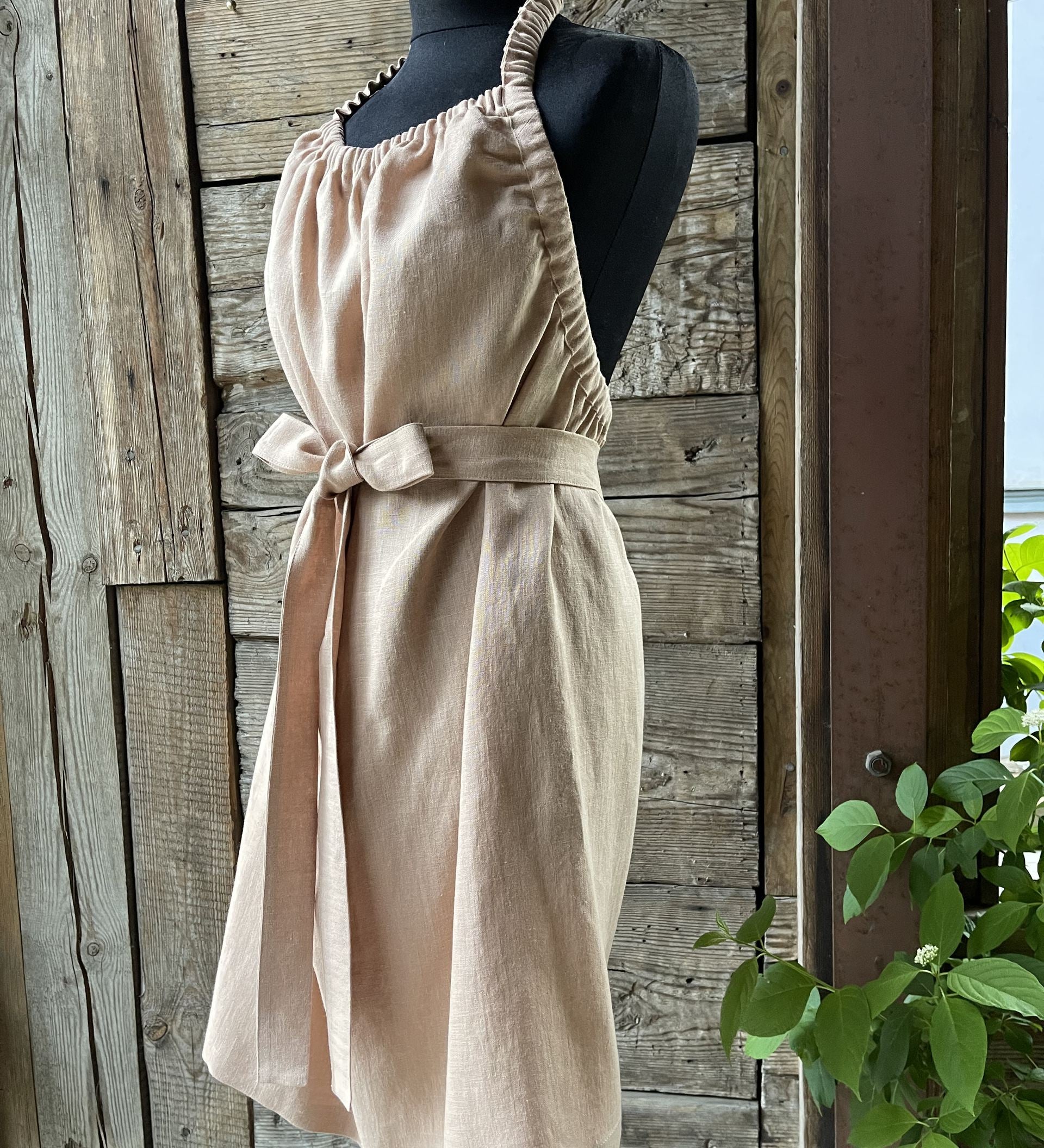 Maigi bēšas pūderkrāsas mīkstināta lina pirts kleita ar sasienamām jostas bantēm