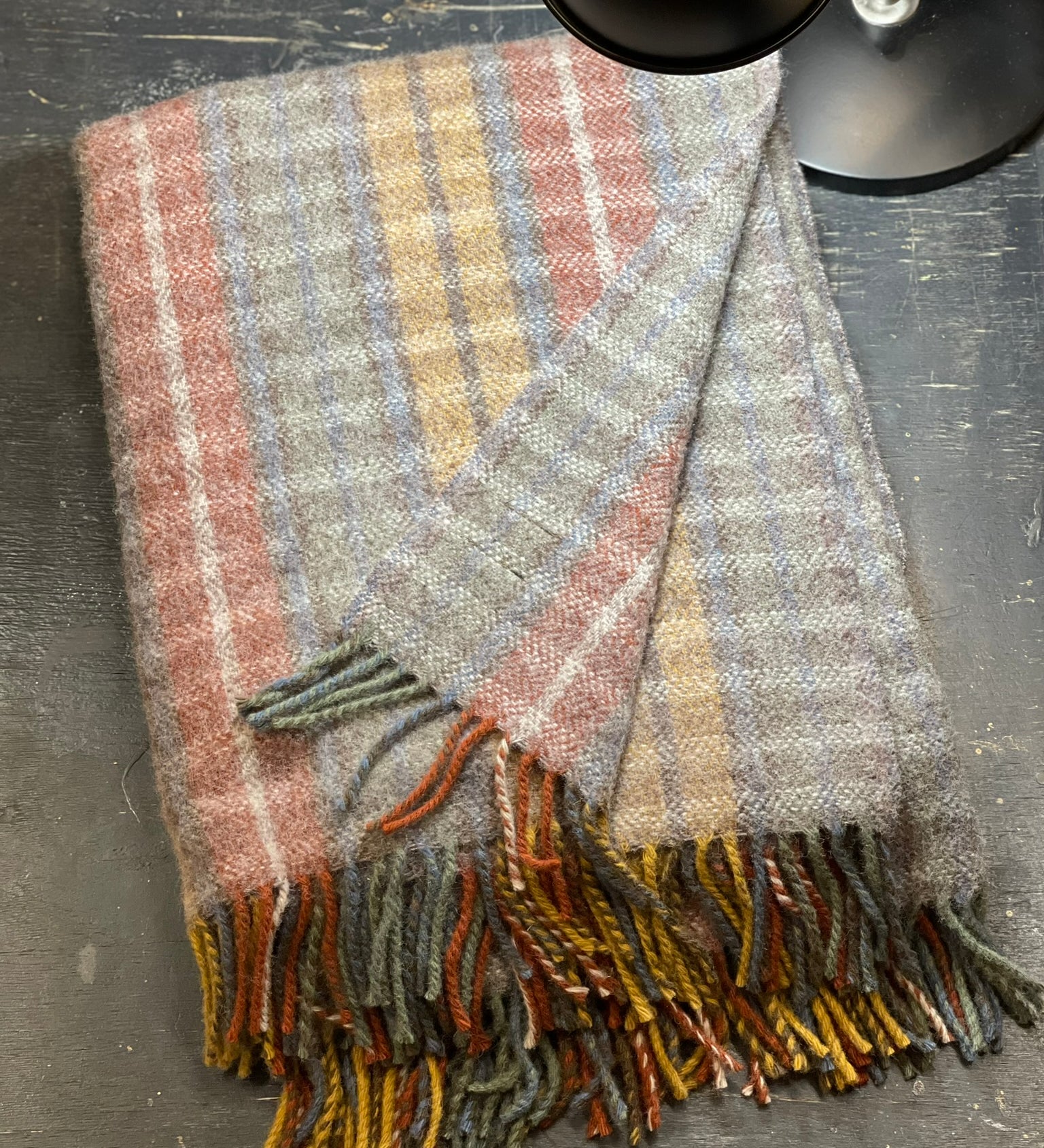 Dūmakaini rūtains aitas vilnas pleds, bordo, okera, sinepju zaļos toņos, 150x210cm