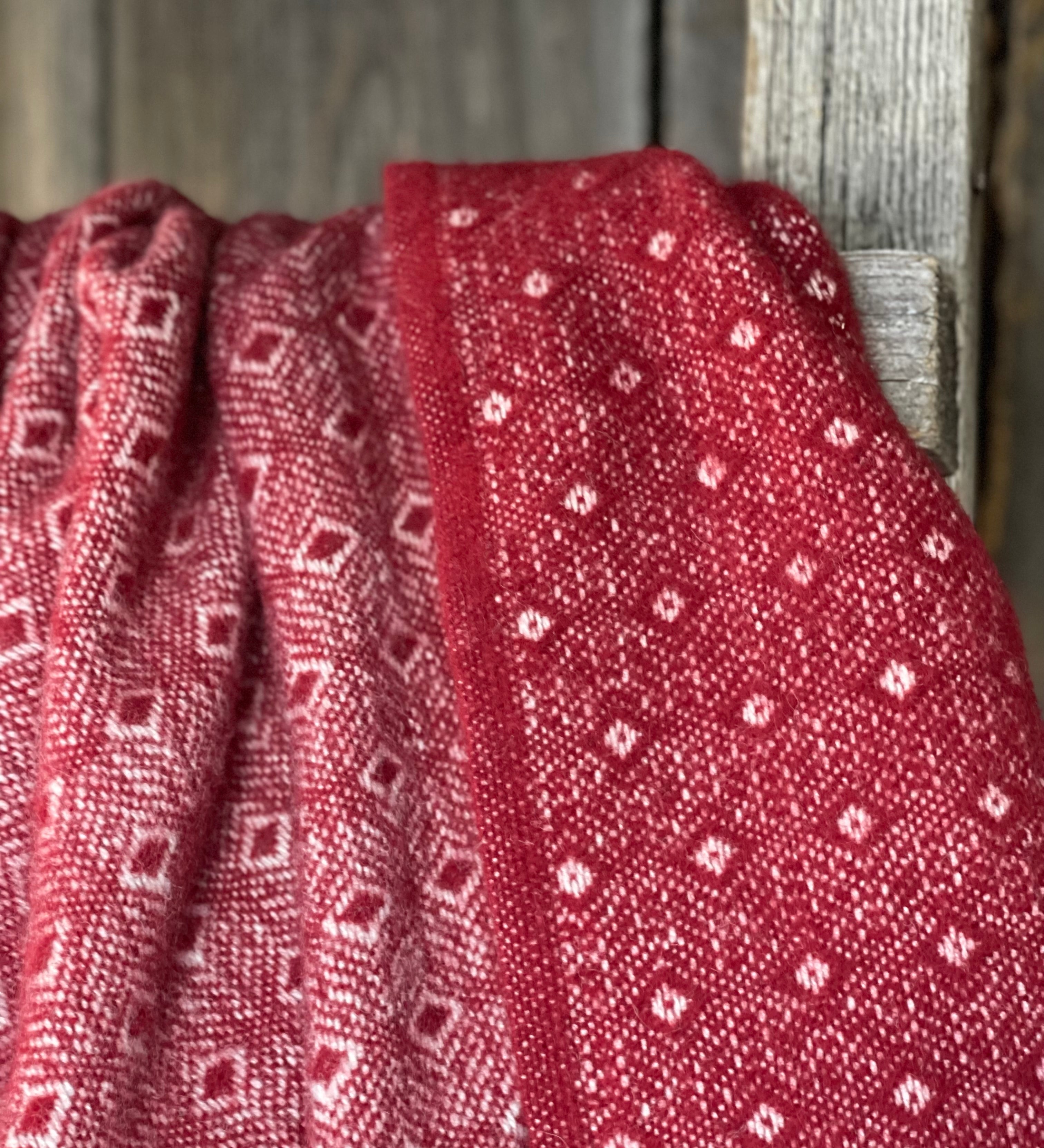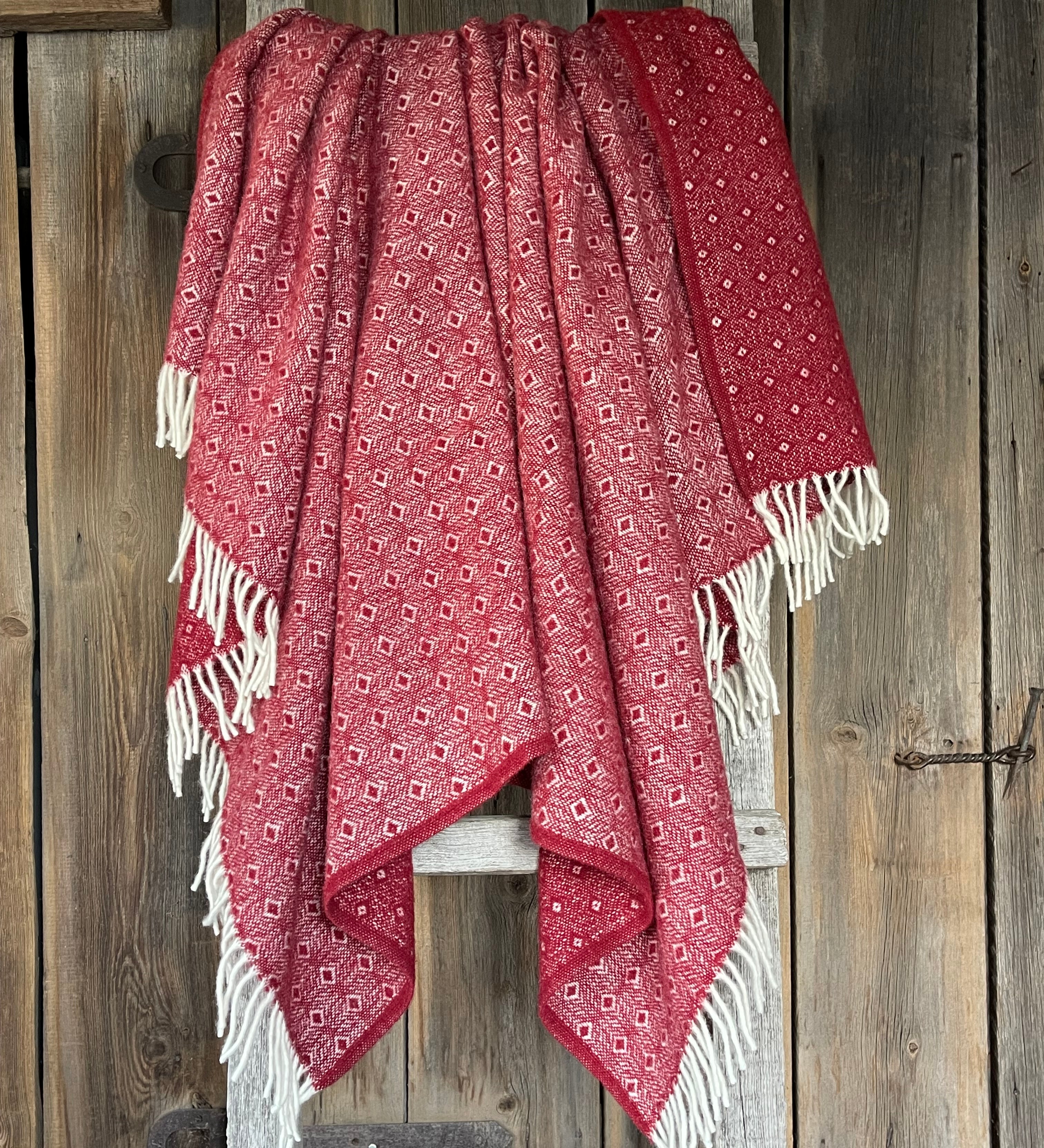 Sarkans aitas vilnas pleds ar baltu ornamentu un baltām bārkstīm 130x200cm