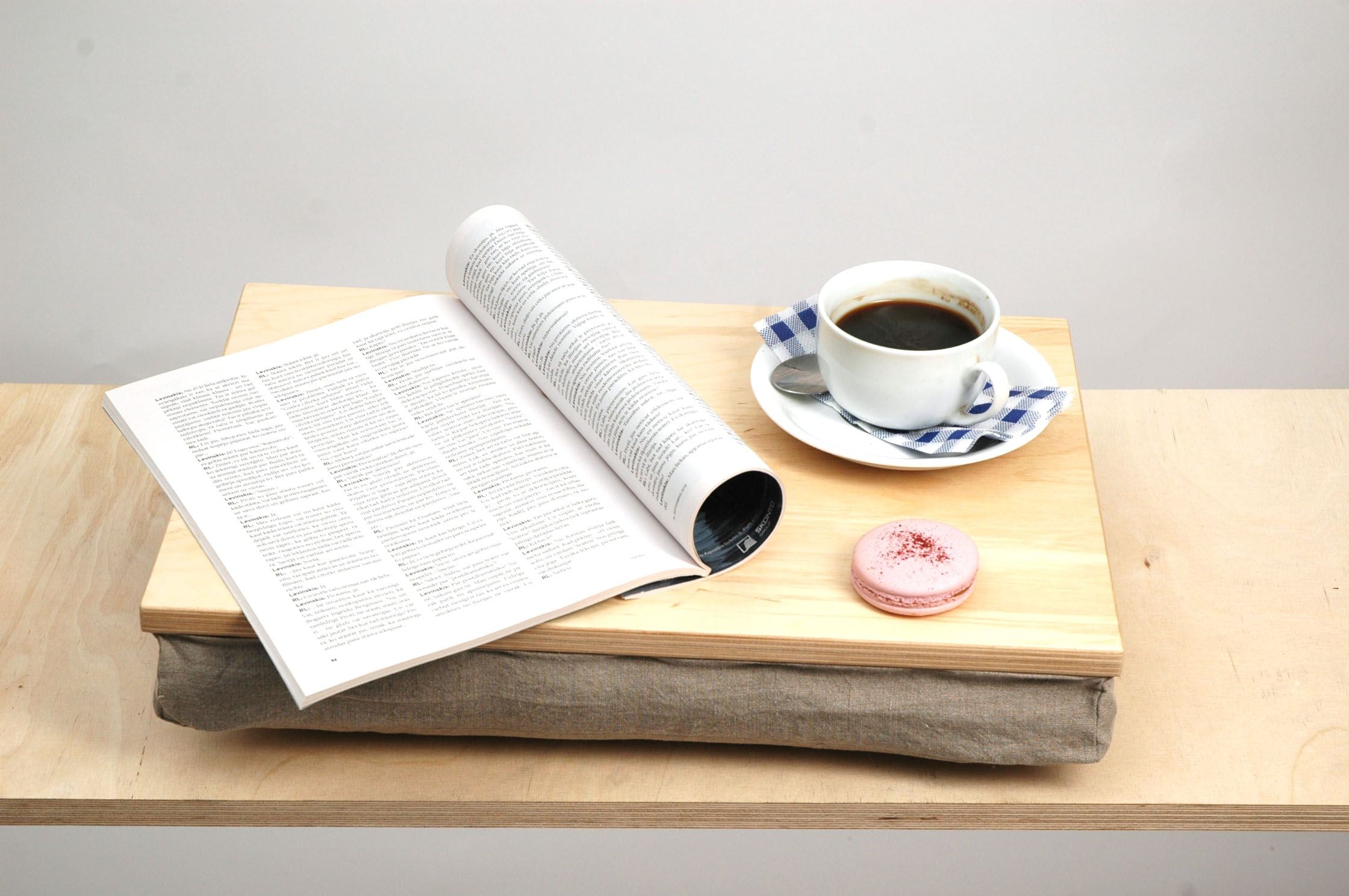 Brokastu paplāte, datora paliktnis, gultas paplāte, dabīgs koks/dabīgi pelēks spilvens