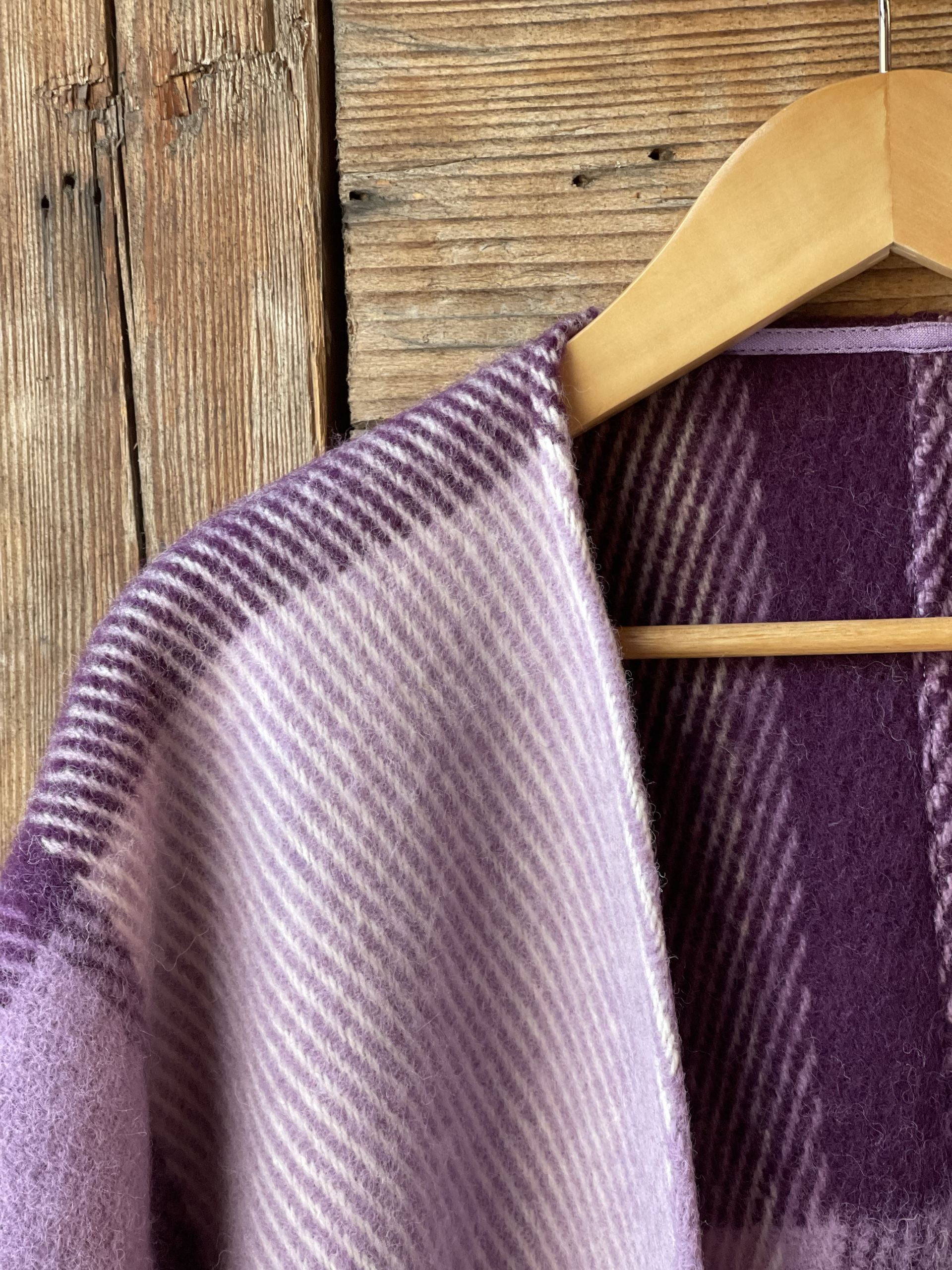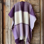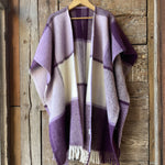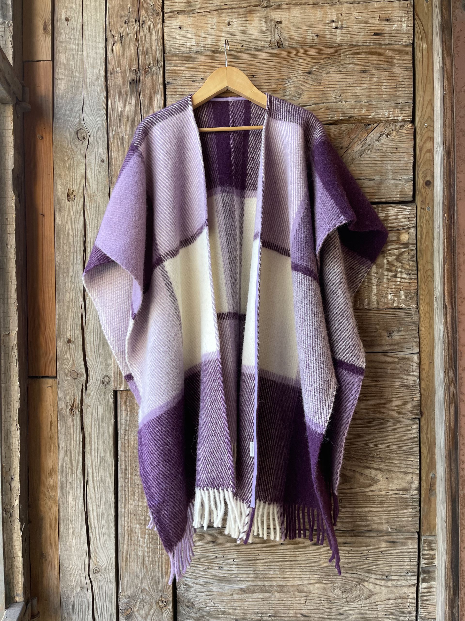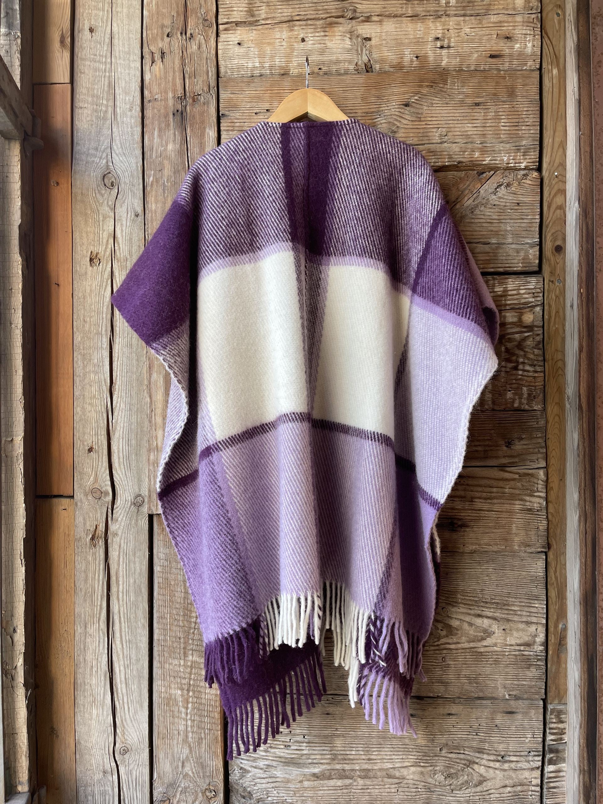 Lavandu violets/balti rūtains pončo - apmetnis ar bārkstīm no aitas vilnas auduma