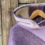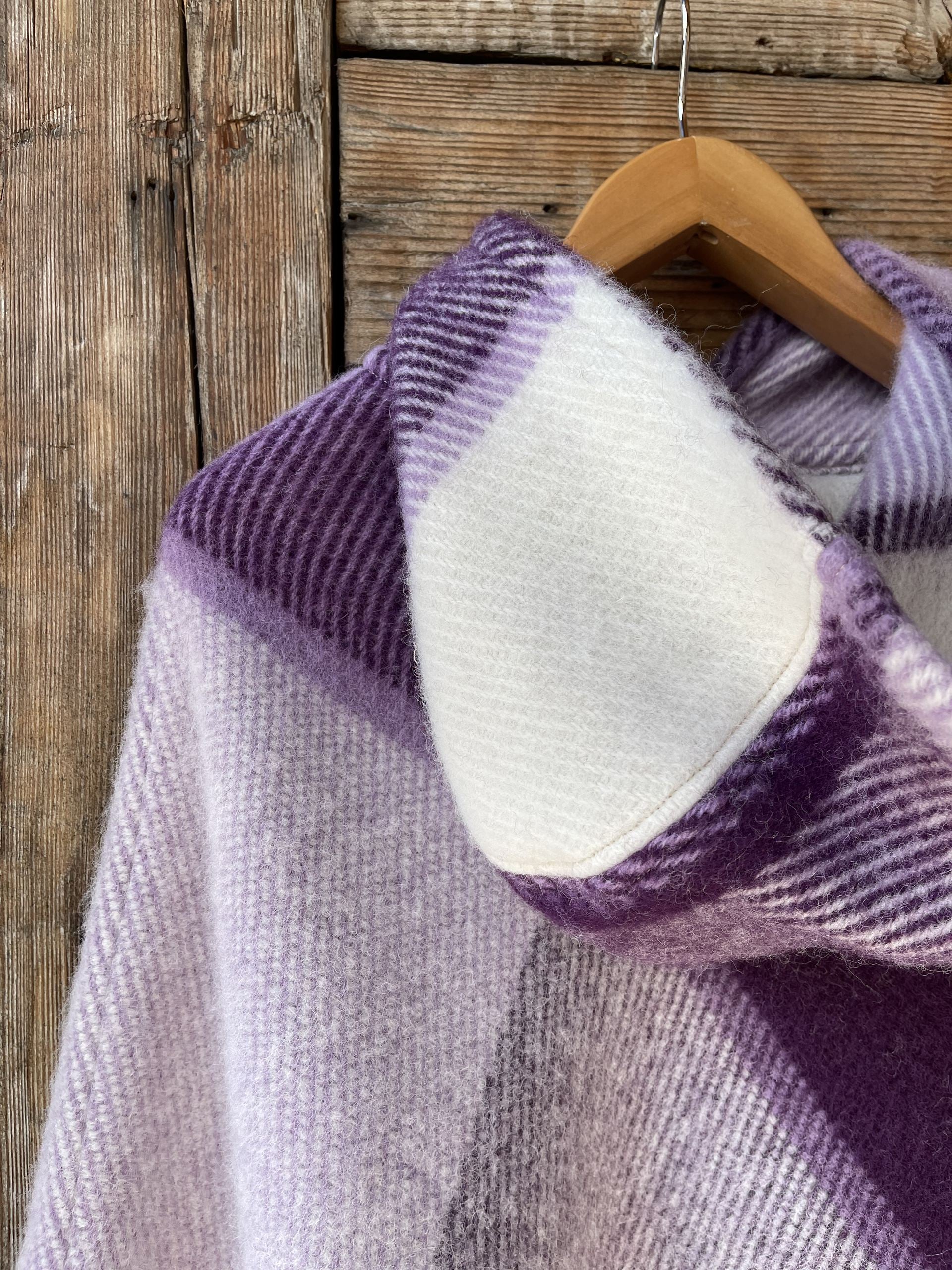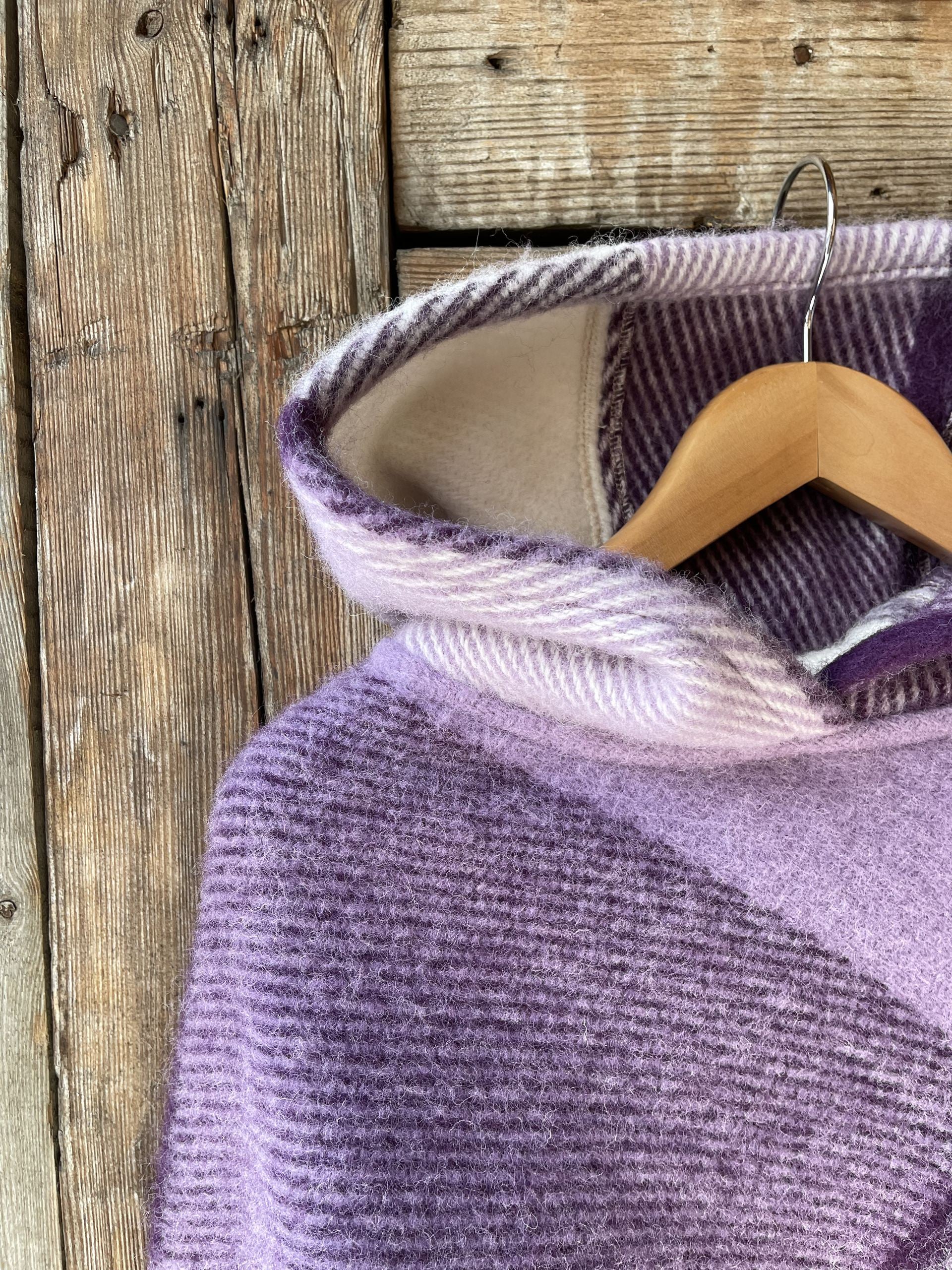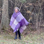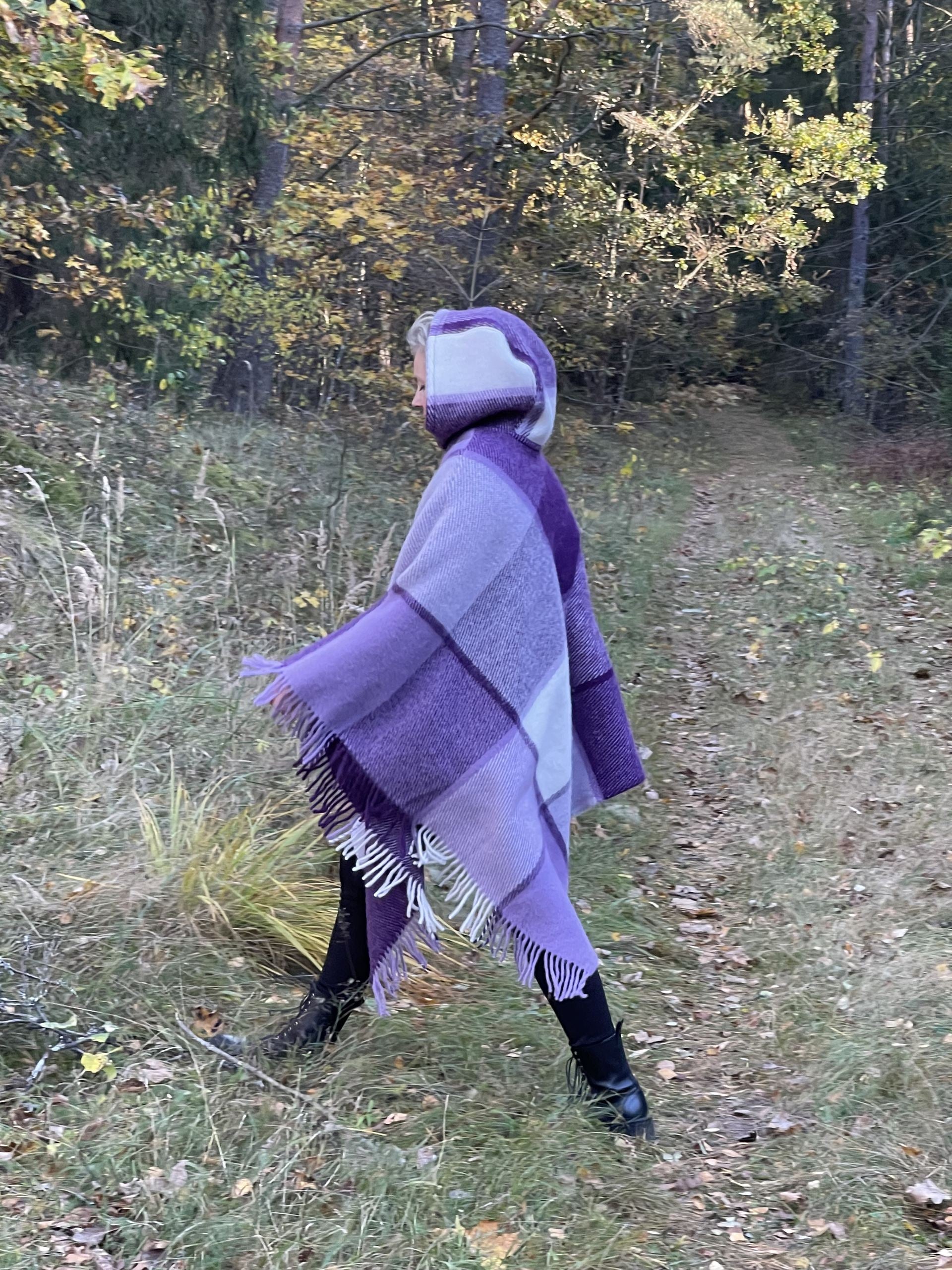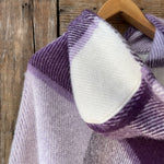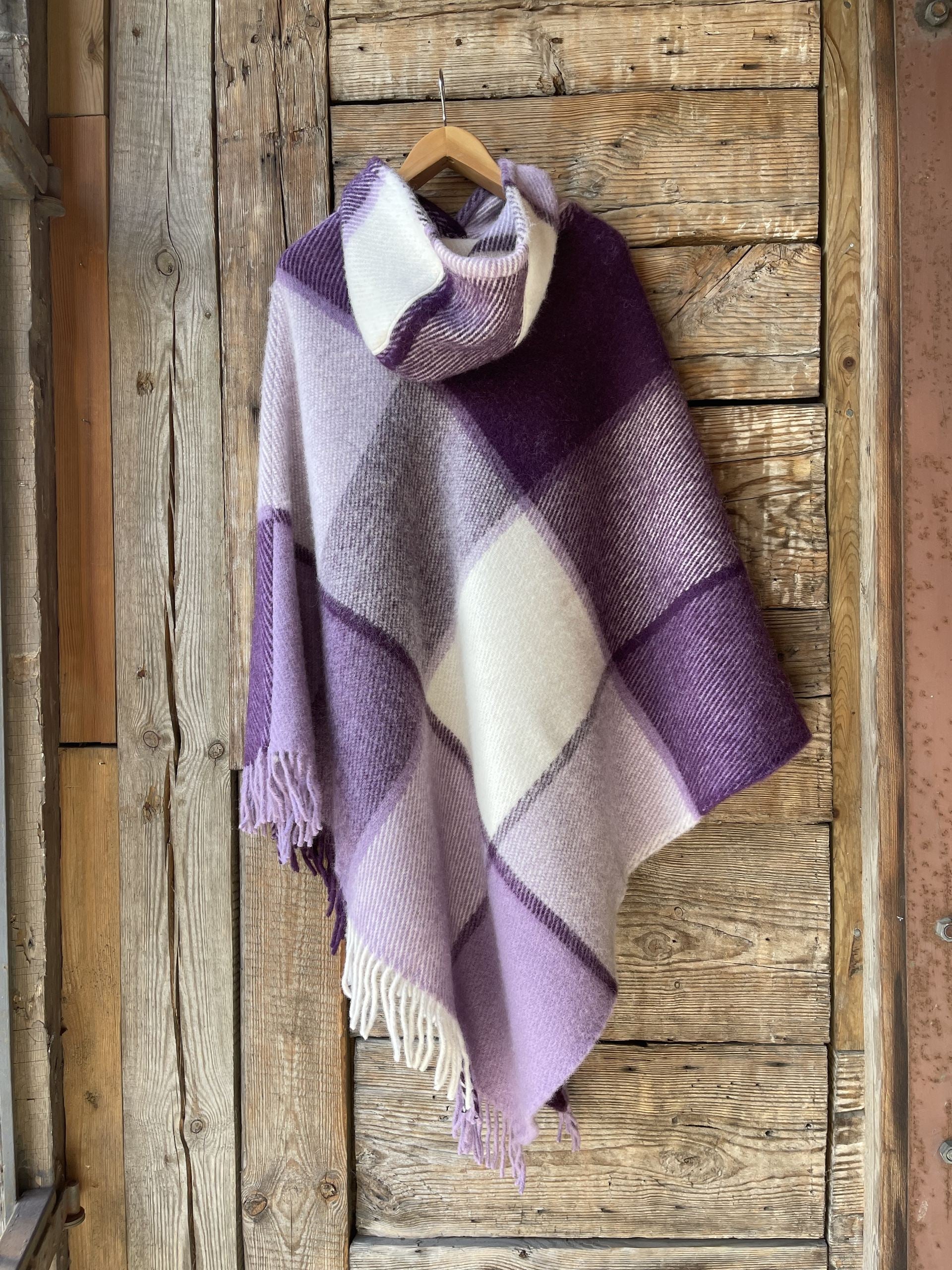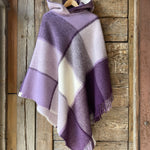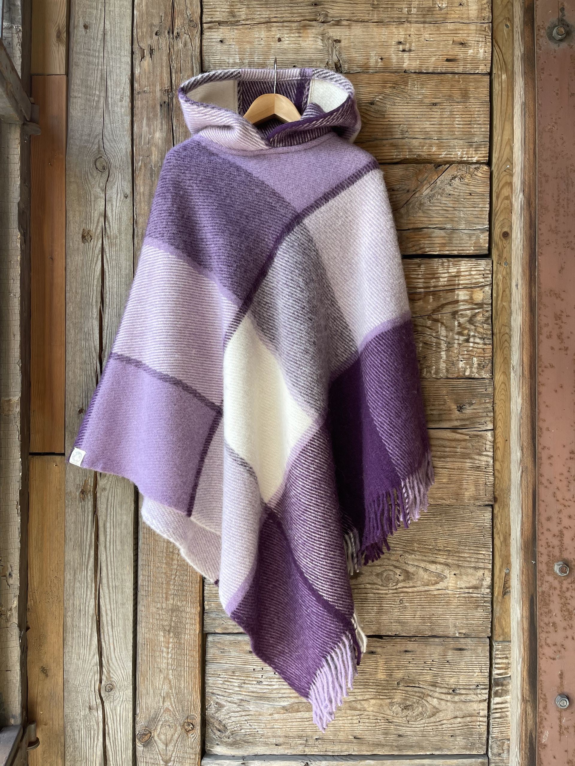 Lavandu violets/balts lieli rūtains vilnas pončo ar kapuci un bārkstīm