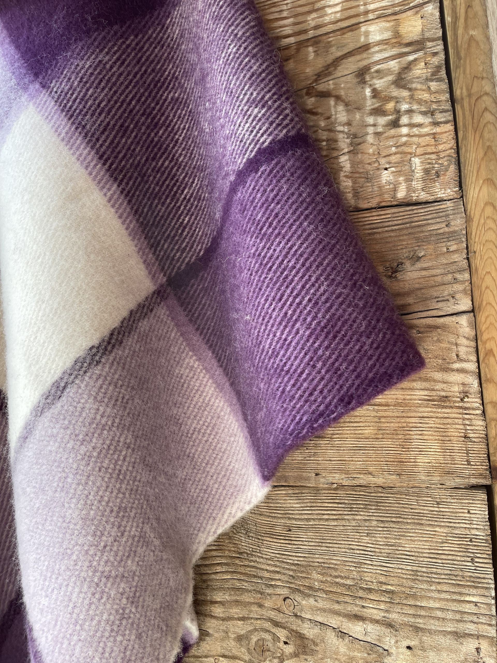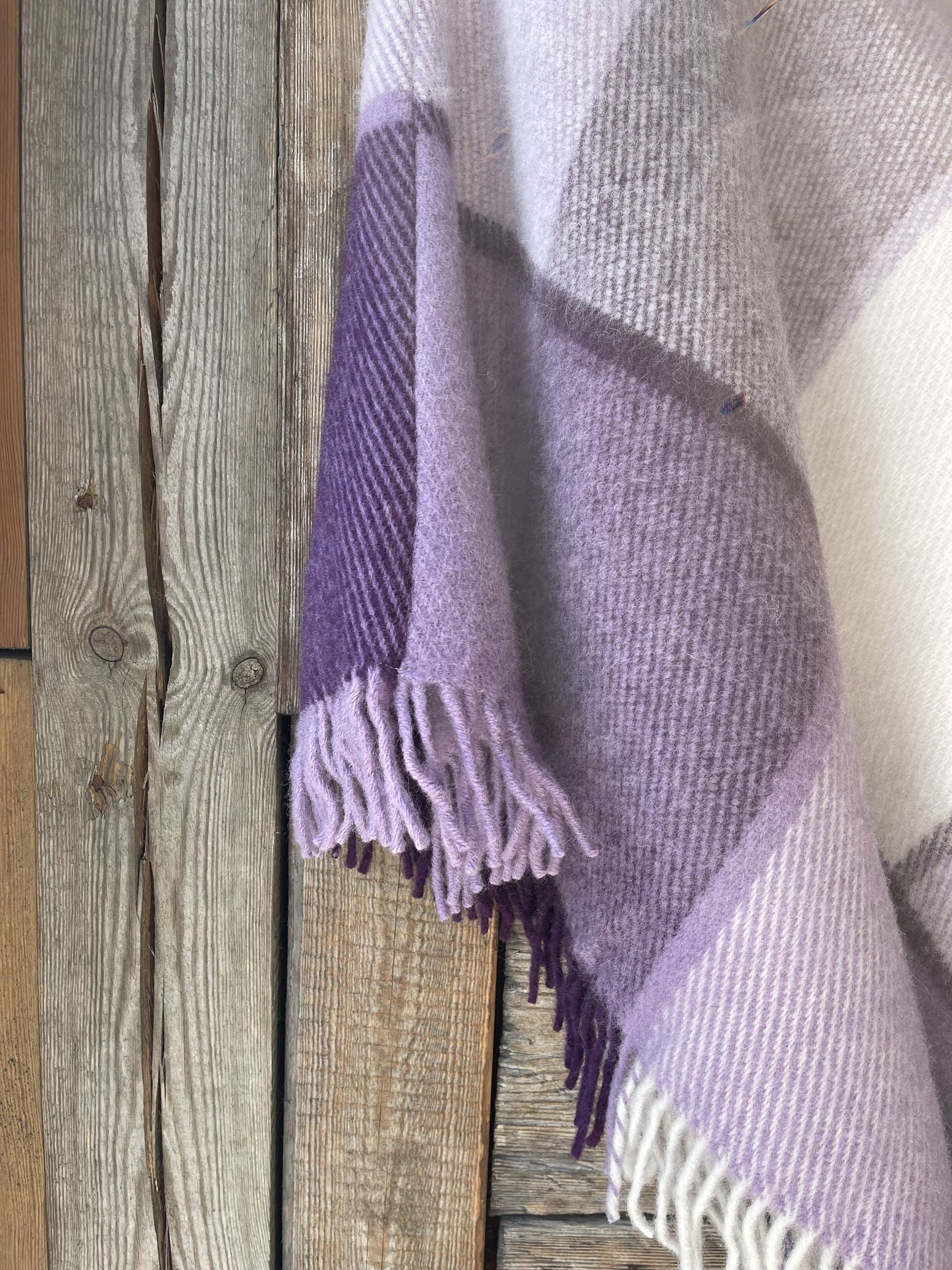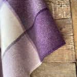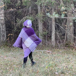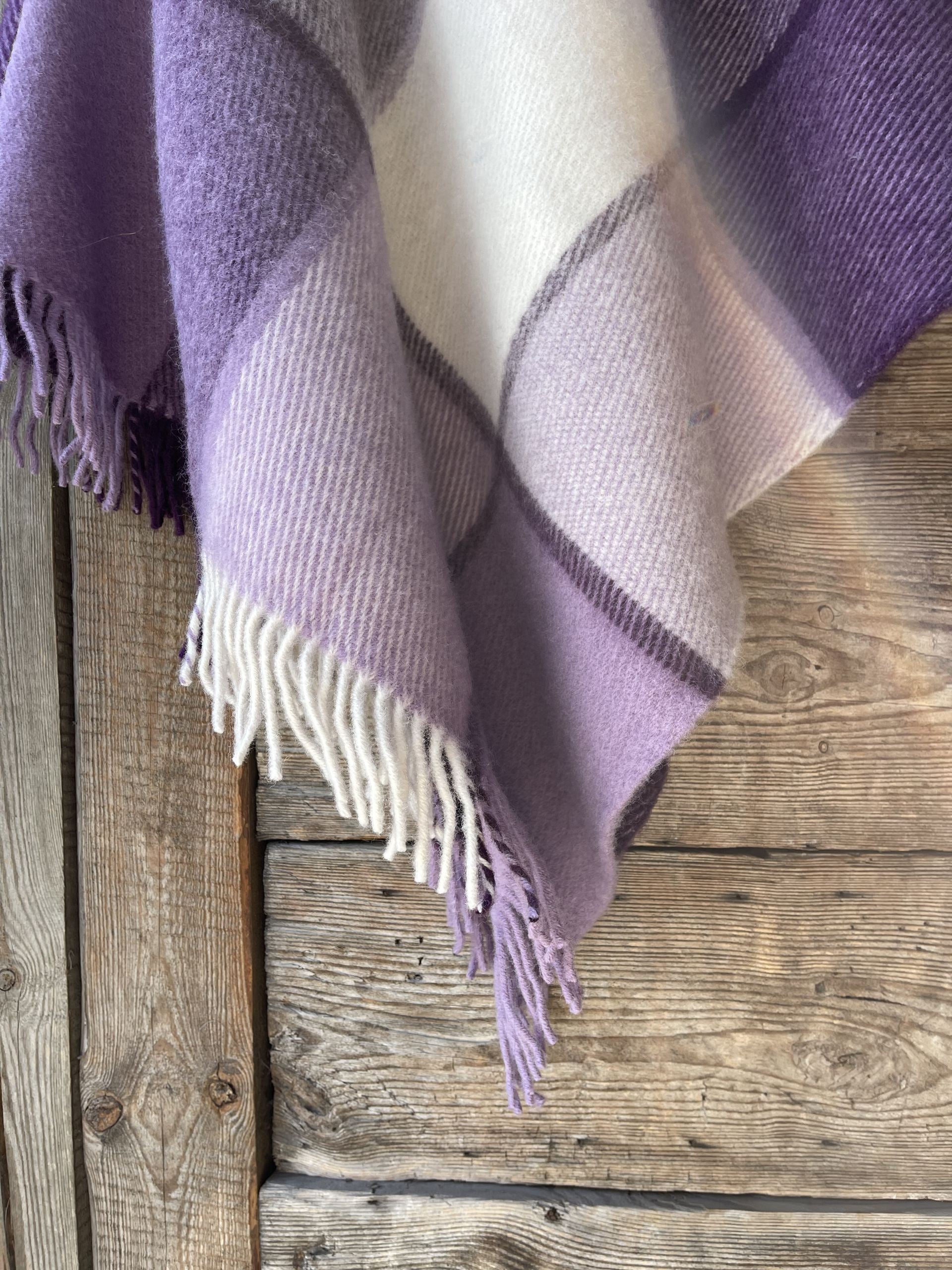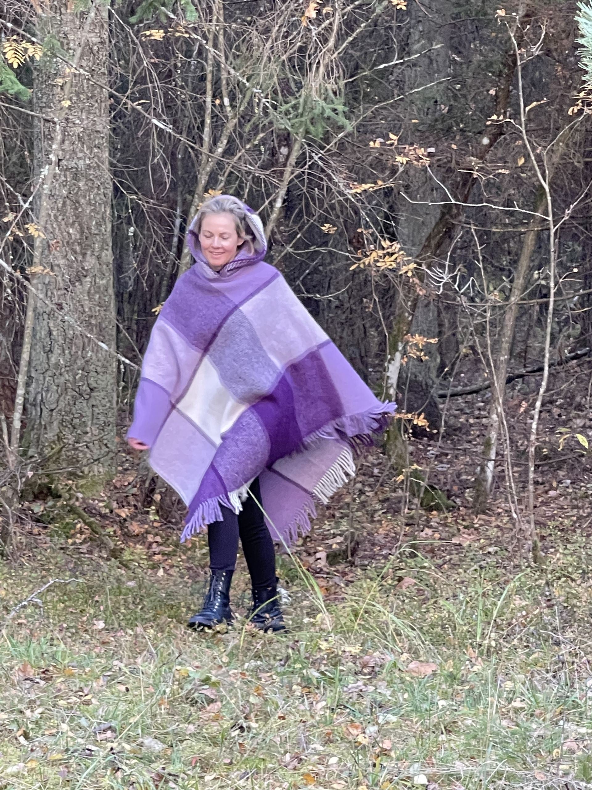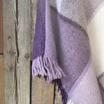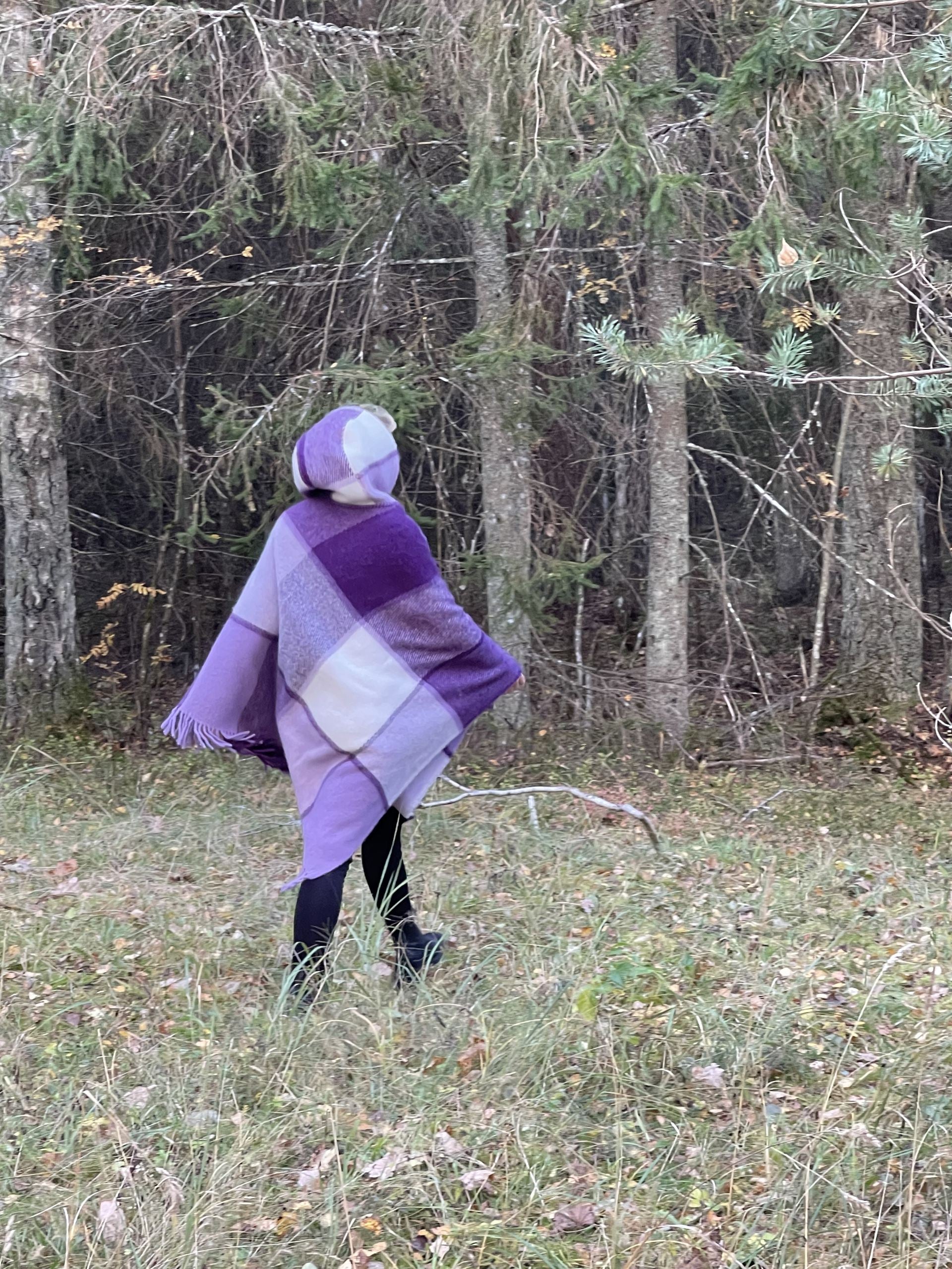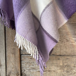 Lavandu violets/balts lieli rūtains vilnas pončo ar kapuci un bārkstīm